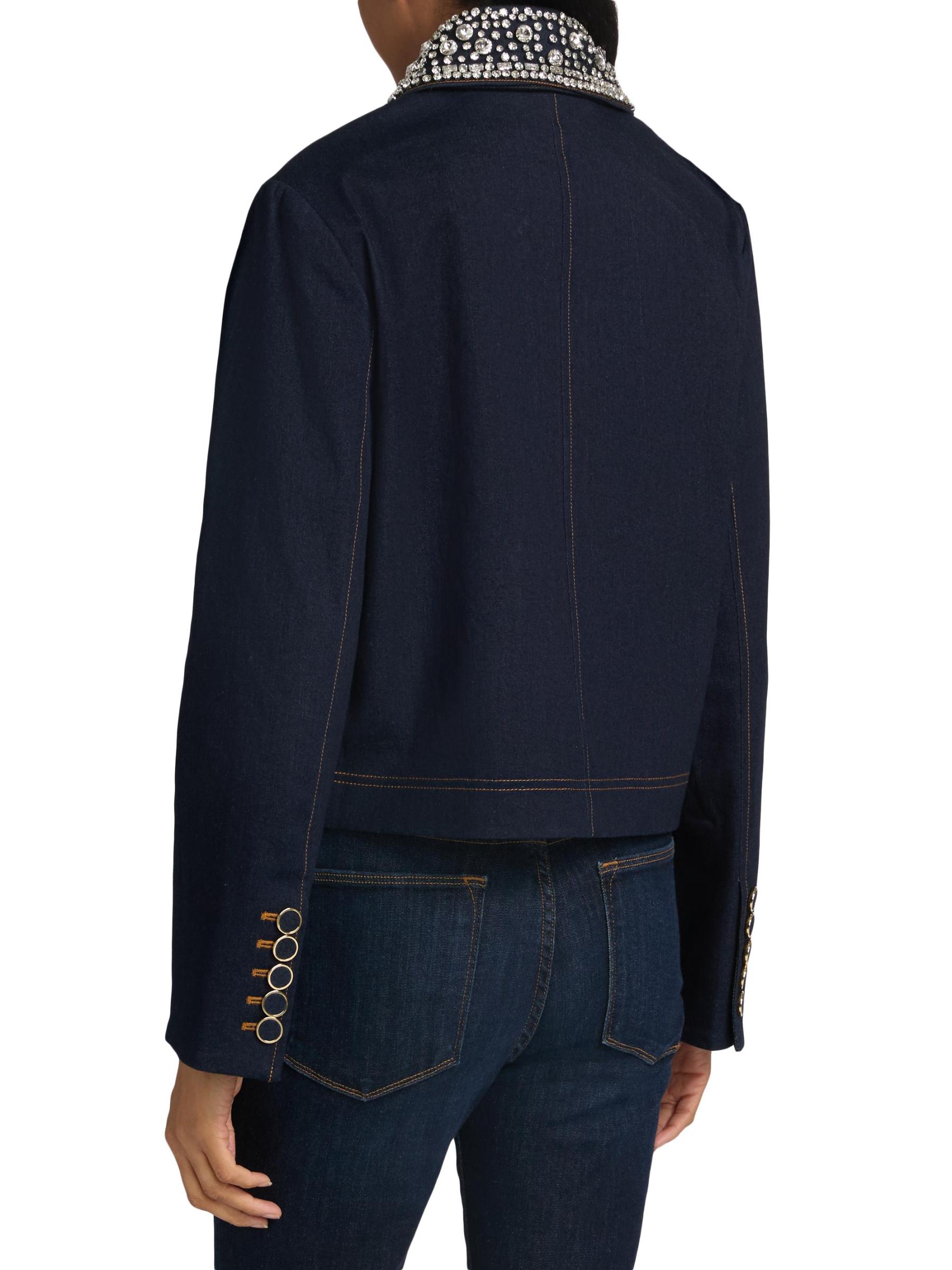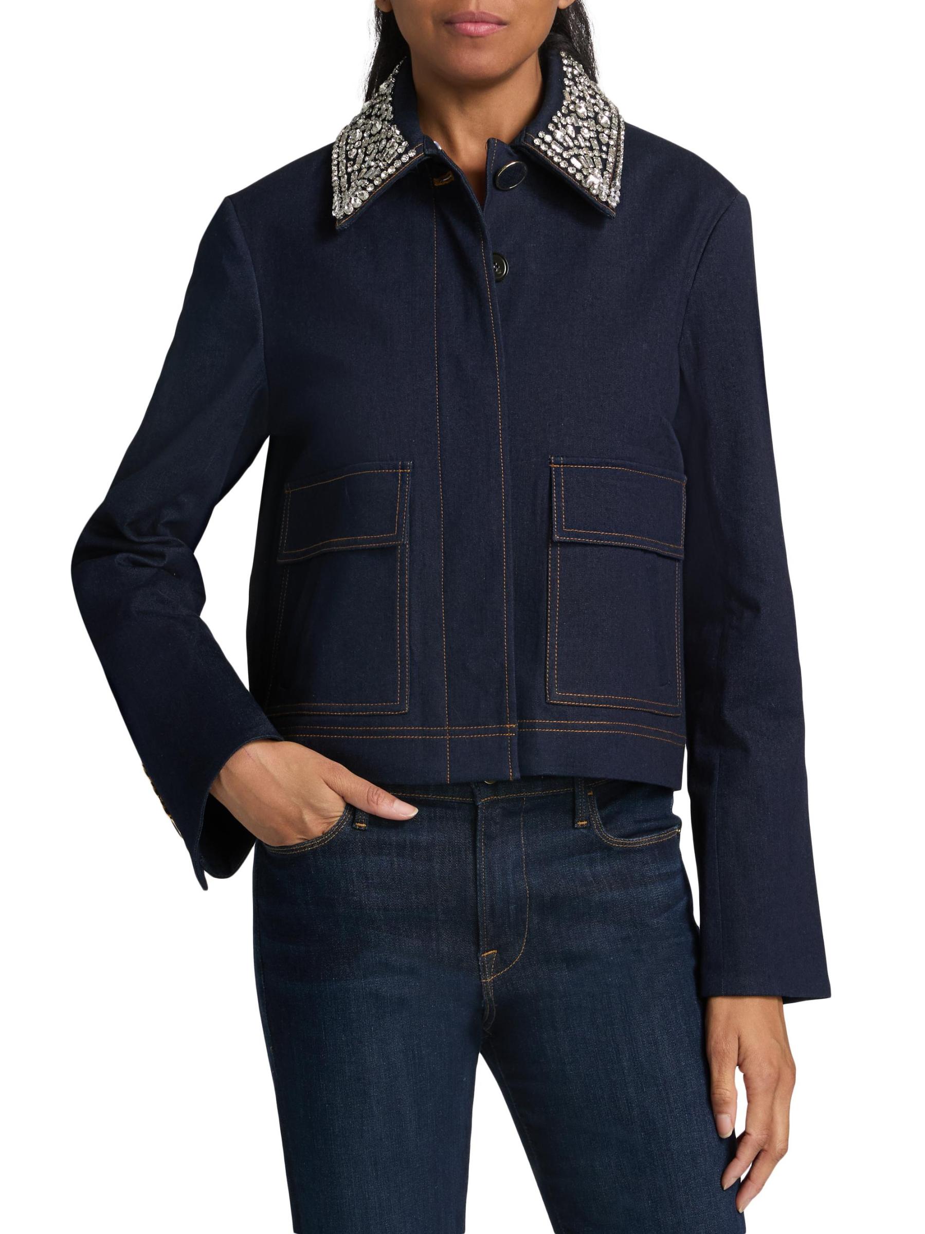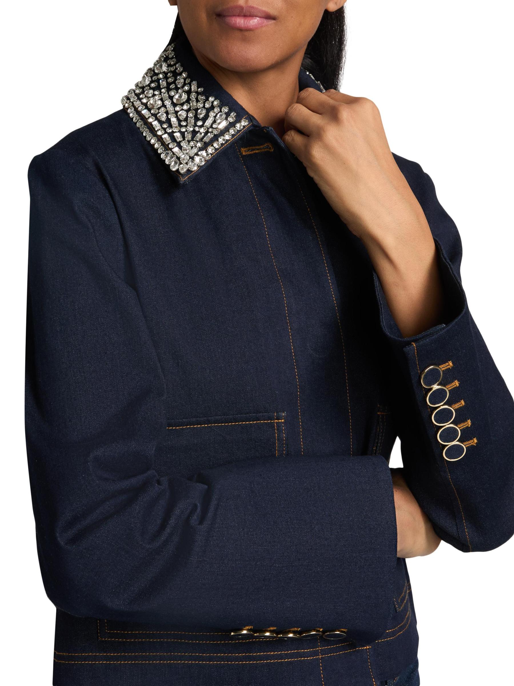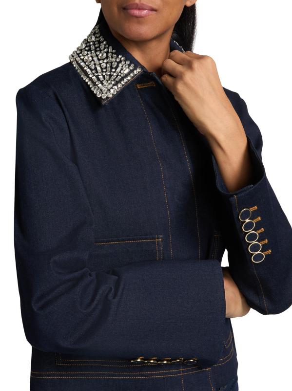 تتميّز سترة Barrington من Veronica Beard المصنوعة من الدنيم القطني المرن بياقة مزيّنة تضفي لمسة من التألق.
