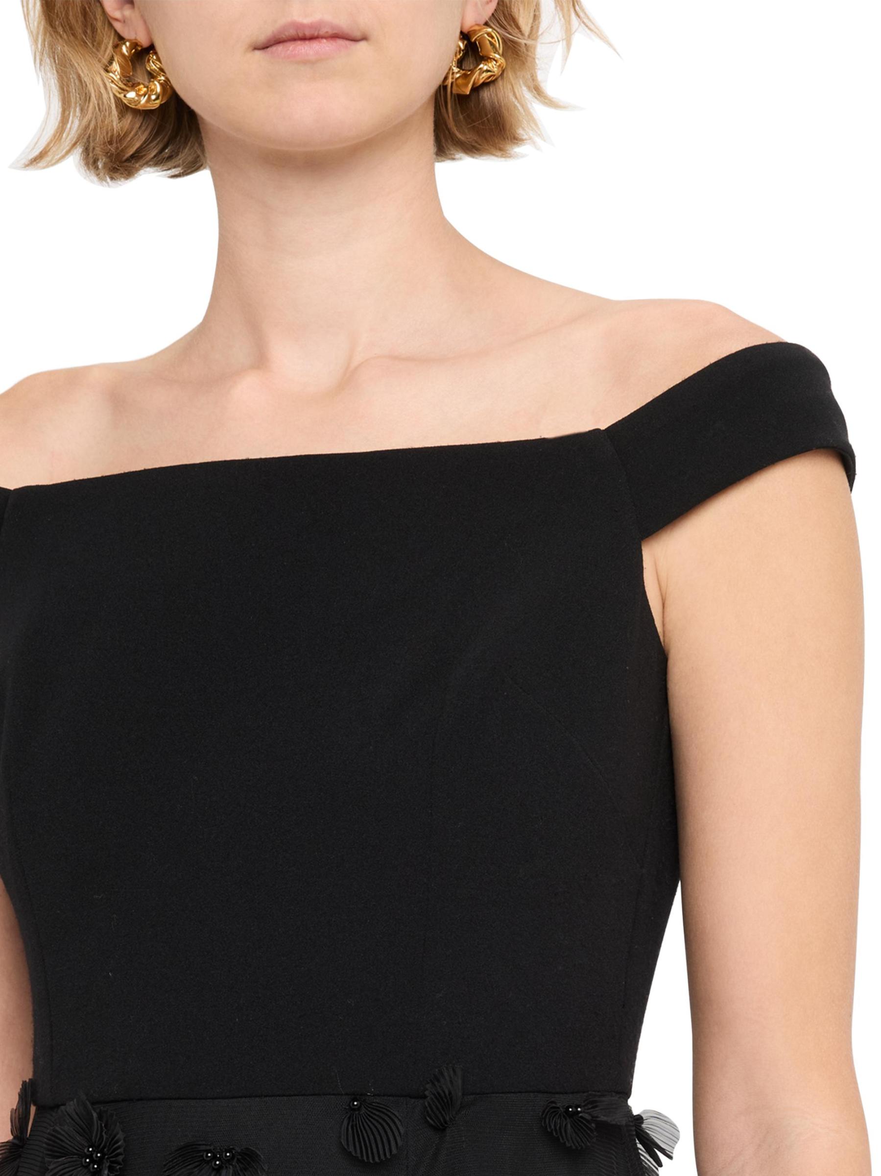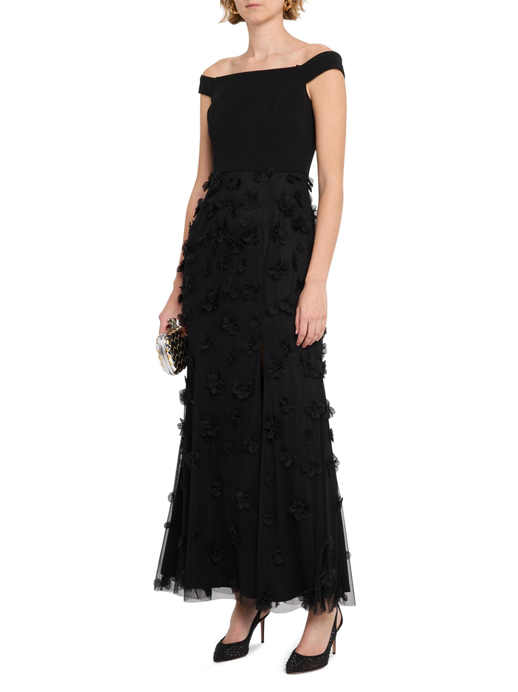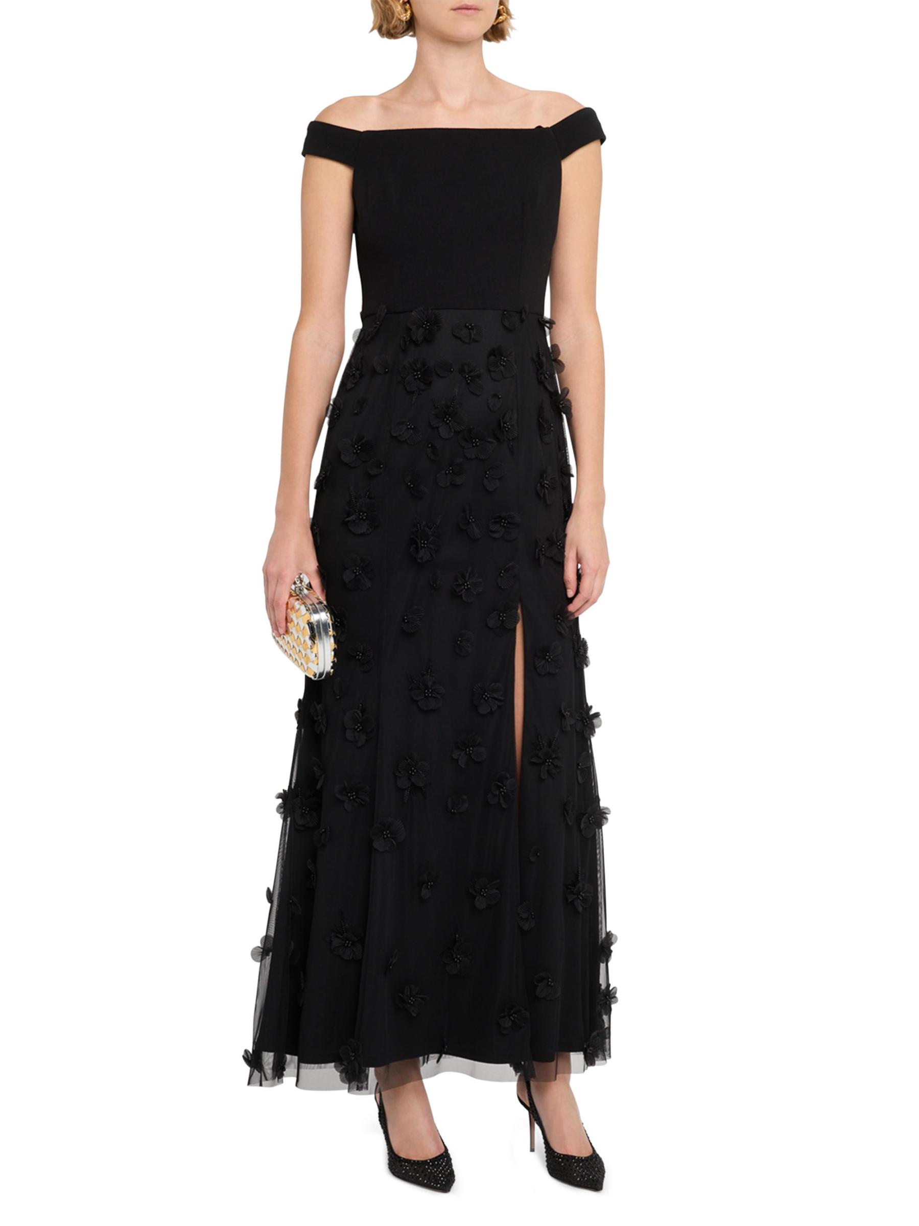 يتميز هذا الفستان ذو الأكتاف المكشوفة من Aidan Mattox بتطريز الأزهار المزين بالخرز وتنورة من التل متعدد الطبقات.