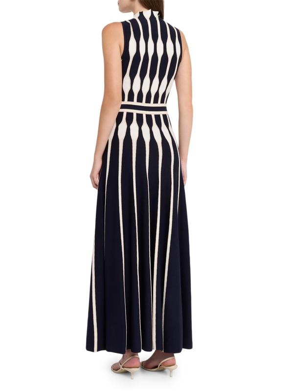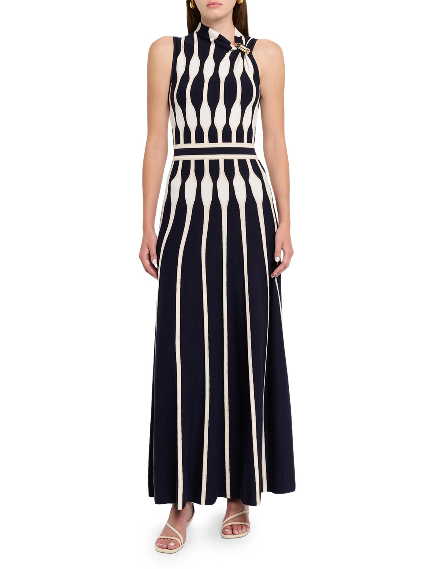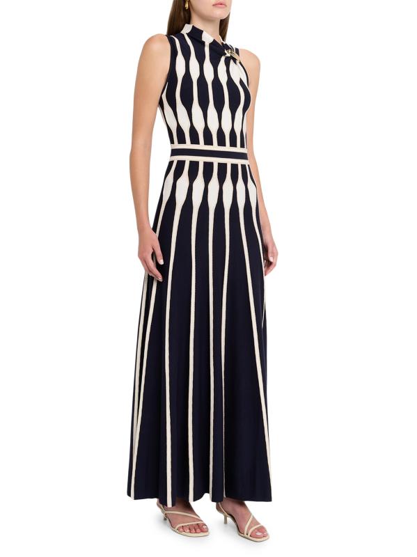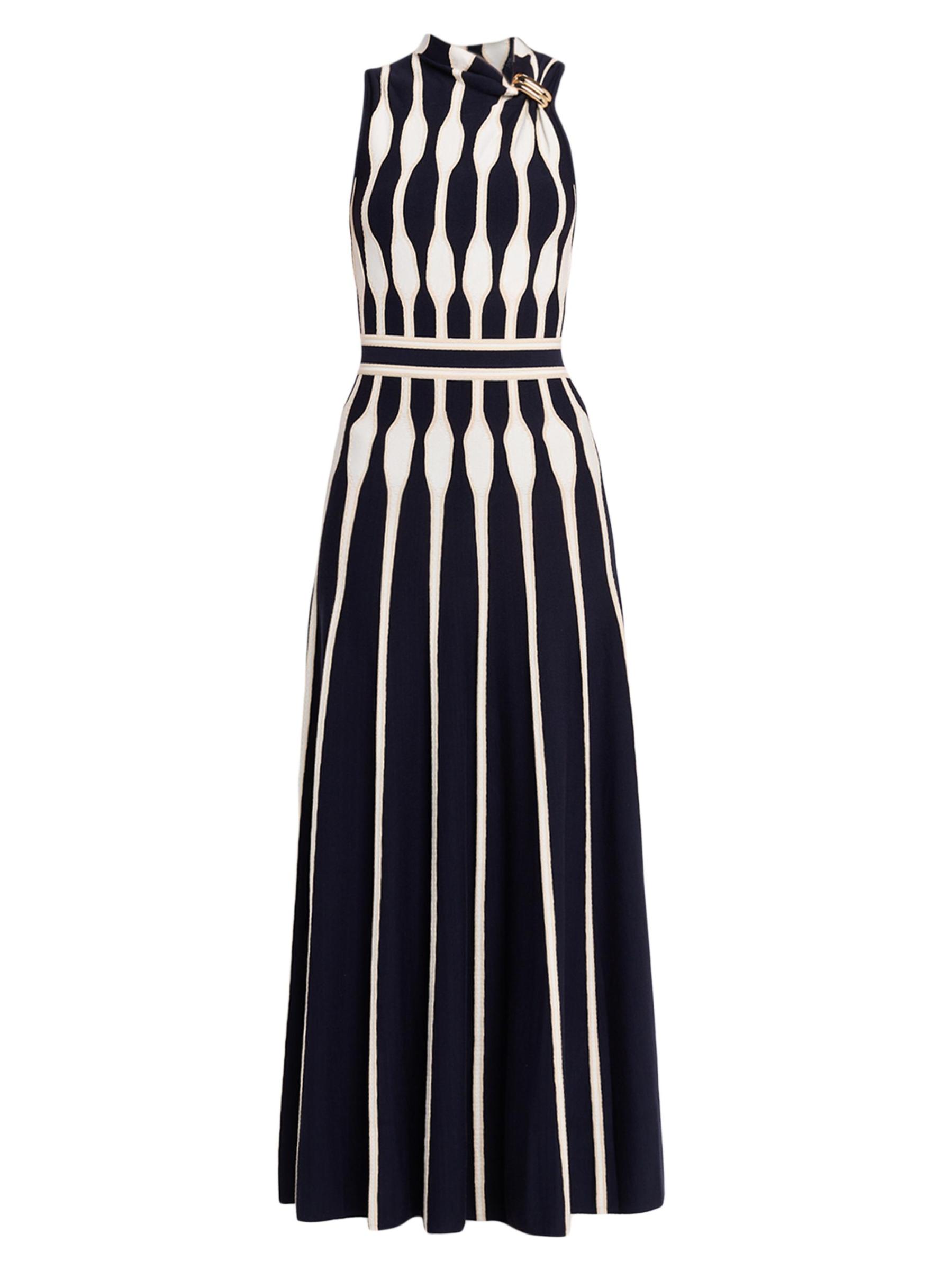 يُبرز فستان Beaford maxi من Acler، المزين بزخارف متباينة جريئة وأجزاء صلبة ذهبية اللون، صورة ظلية راقية من نسيج مطاطي مريح.