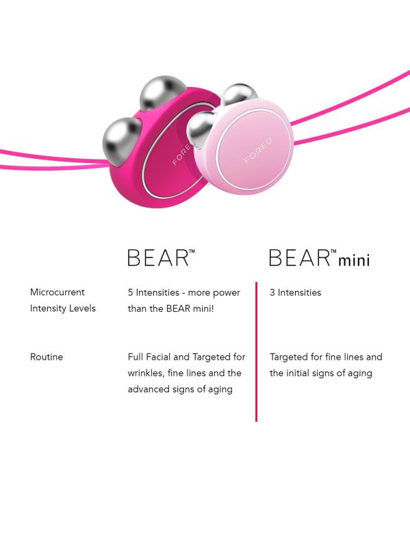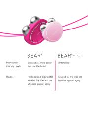 مثل تمرين الوجه، يستخدم BEAR™ كرتين من تيارات التيار المتناهي الصغر التي تنقل الطاقة مباشرة إلى الجلد. تعني مساحة السطح المتوسطة للكرات أنها تستطيع معالجة المساحات الأكبر مع استهداف كل خط دقيق بعناية فائقة في نفس الوقت. عند استخدام التيار المتناهي الصغر، تتحلل خلايا الجلد ثم تنمو مرة أخرى بشكل أقوى، بنفس الطريقة التي تعمل بها عضلاتك بعد رفع الأثقال. بينما تمحى علامات الشيخوخة في طبقة البشرة (العلوية) من الجلد، تعمل طبقة الأدمة (الأعمق) من الجلد في وقت واحد لإنتاج مظهر قوي ومرن.