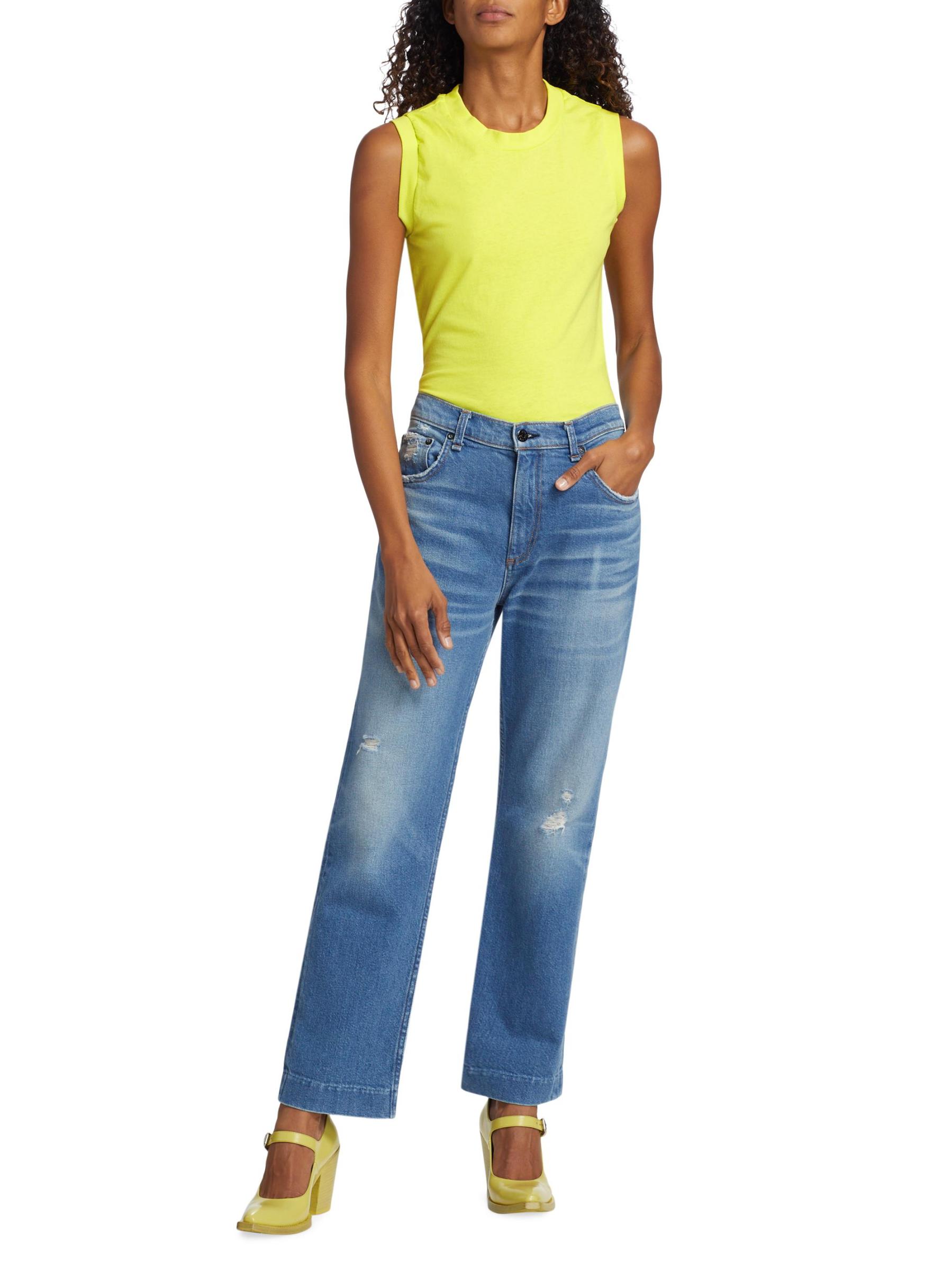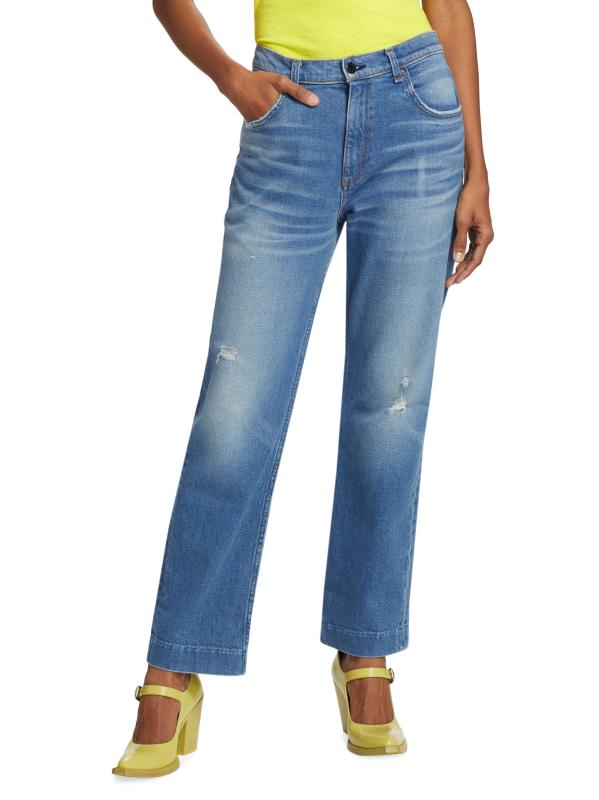 يتميز بنطال جينز Beau من ASKK NY بتصميم مرتفع ذو أرجل مستقيمة ومصنوع من الدنيم الصلب. يضفي الضوء المؤلم والبهتان لمسة نهائية على المظهر.حلقات الحزام طراز بخمسة جيوب زيب فلاي إغلاق بأزرار قطن بنسبة 100% يُغسل في الغسالة صُنع في الولايات المتحدة الأمريكية
