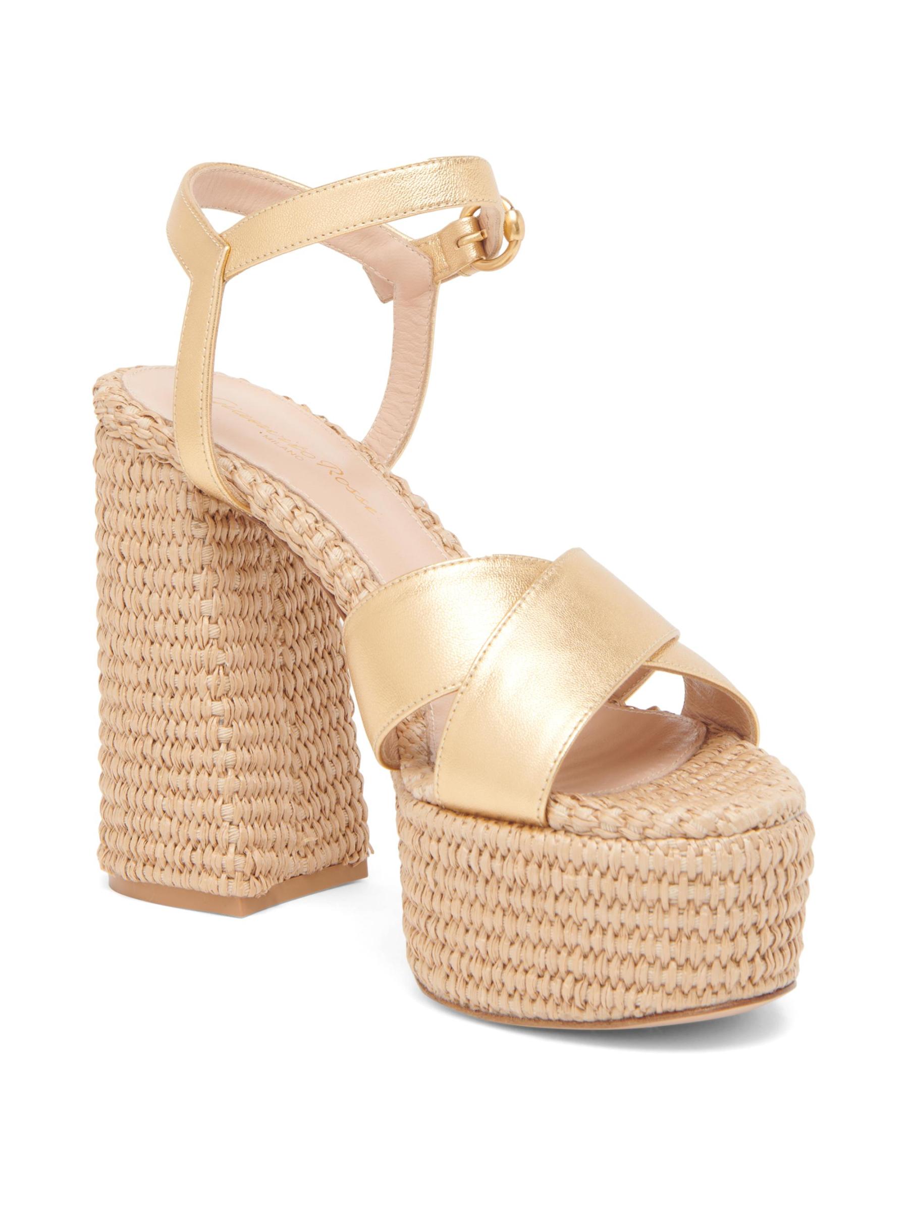 صندل بيبي من جيانفيتو روسي مصنوع من الجلد والرافيا. صُنع هذا الزوج في إيطاليا، وهو مصمم بنعل بلاتفورم وإبزيم قابل للتعديل.