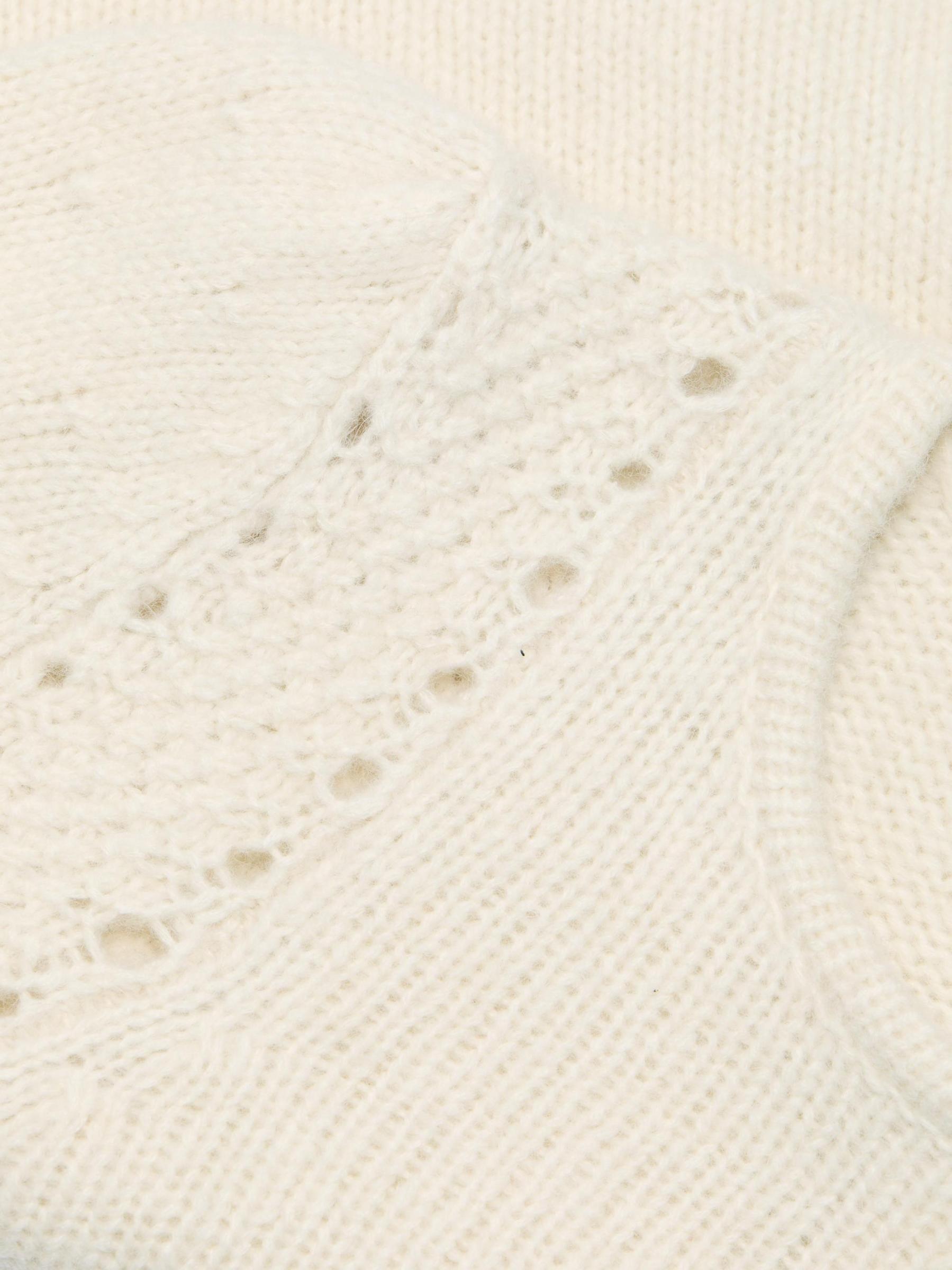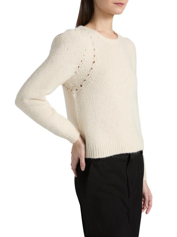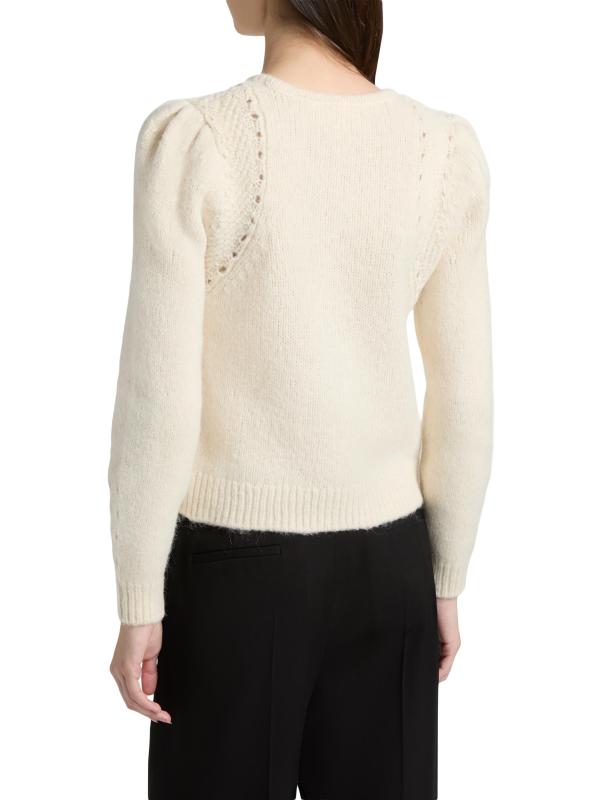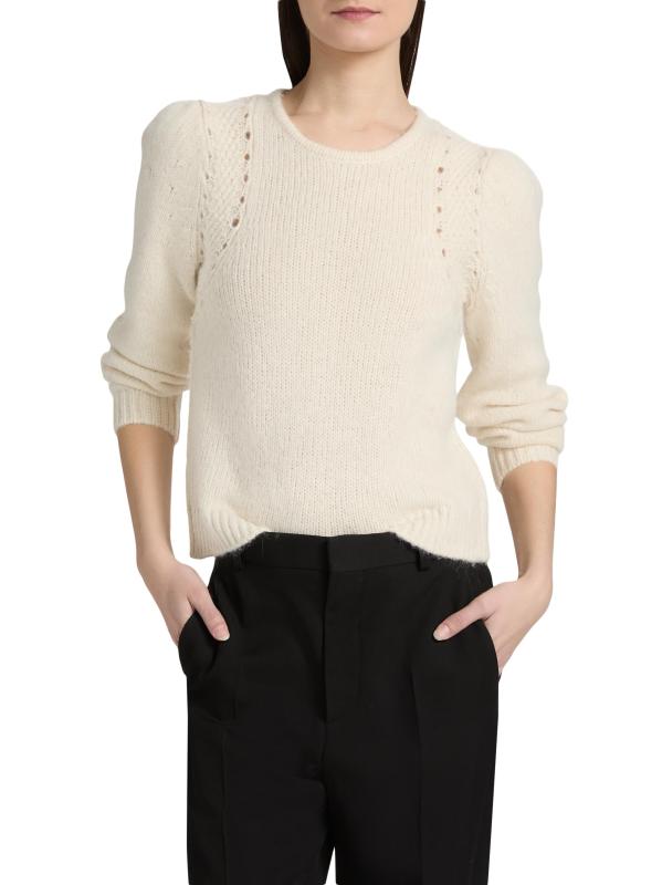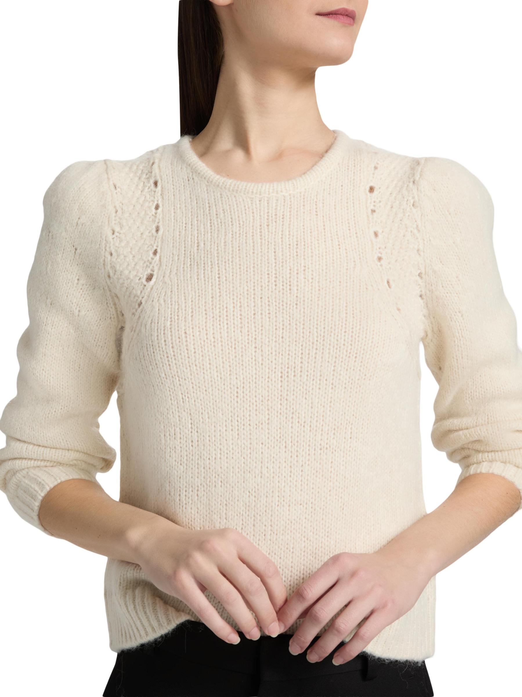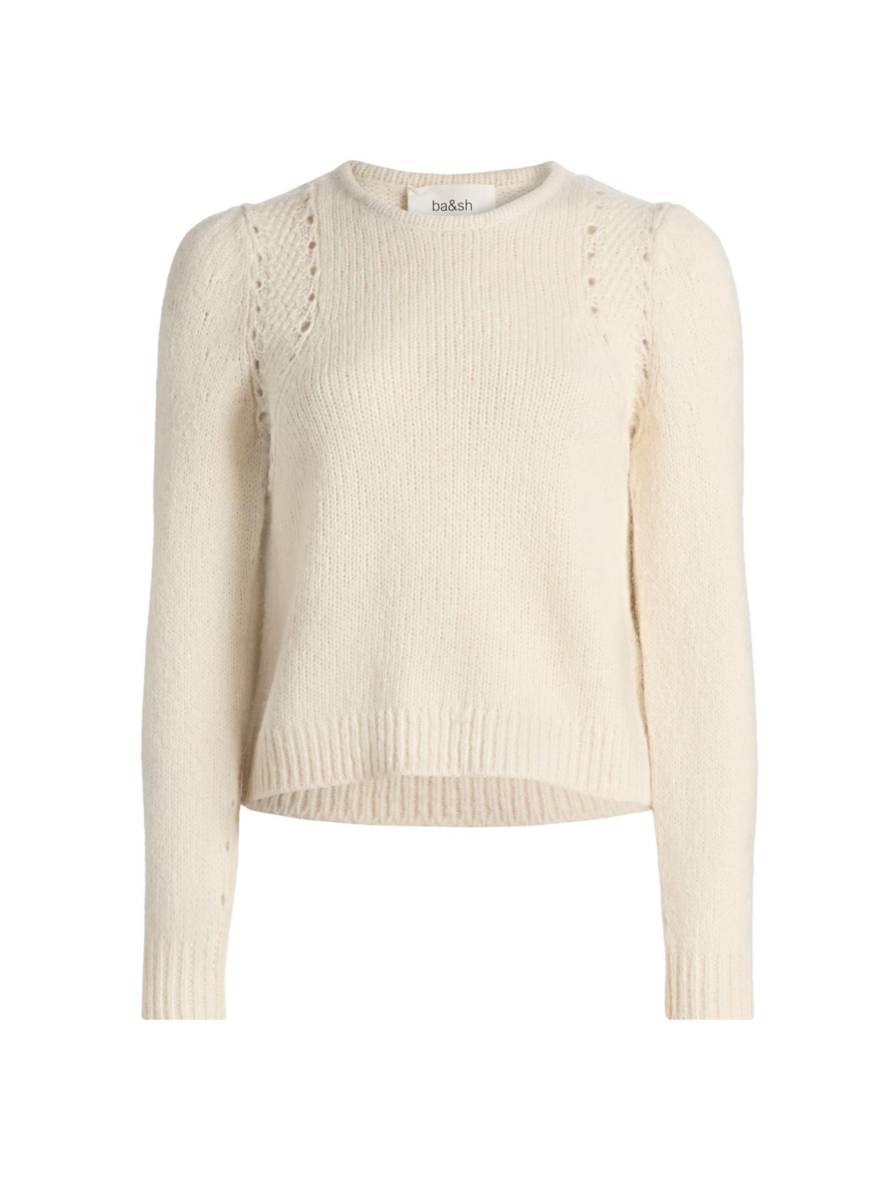 صُنعت سترة Belma من ba&sh من مزيج الصوف والقطن والألبكة، وتتميز بنسيج محبوك عند الكتفين وأكمام طويلة منفوخة.
