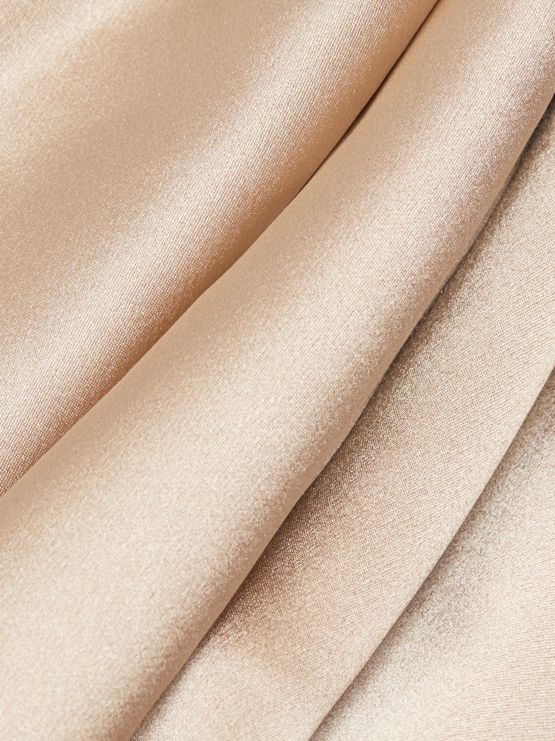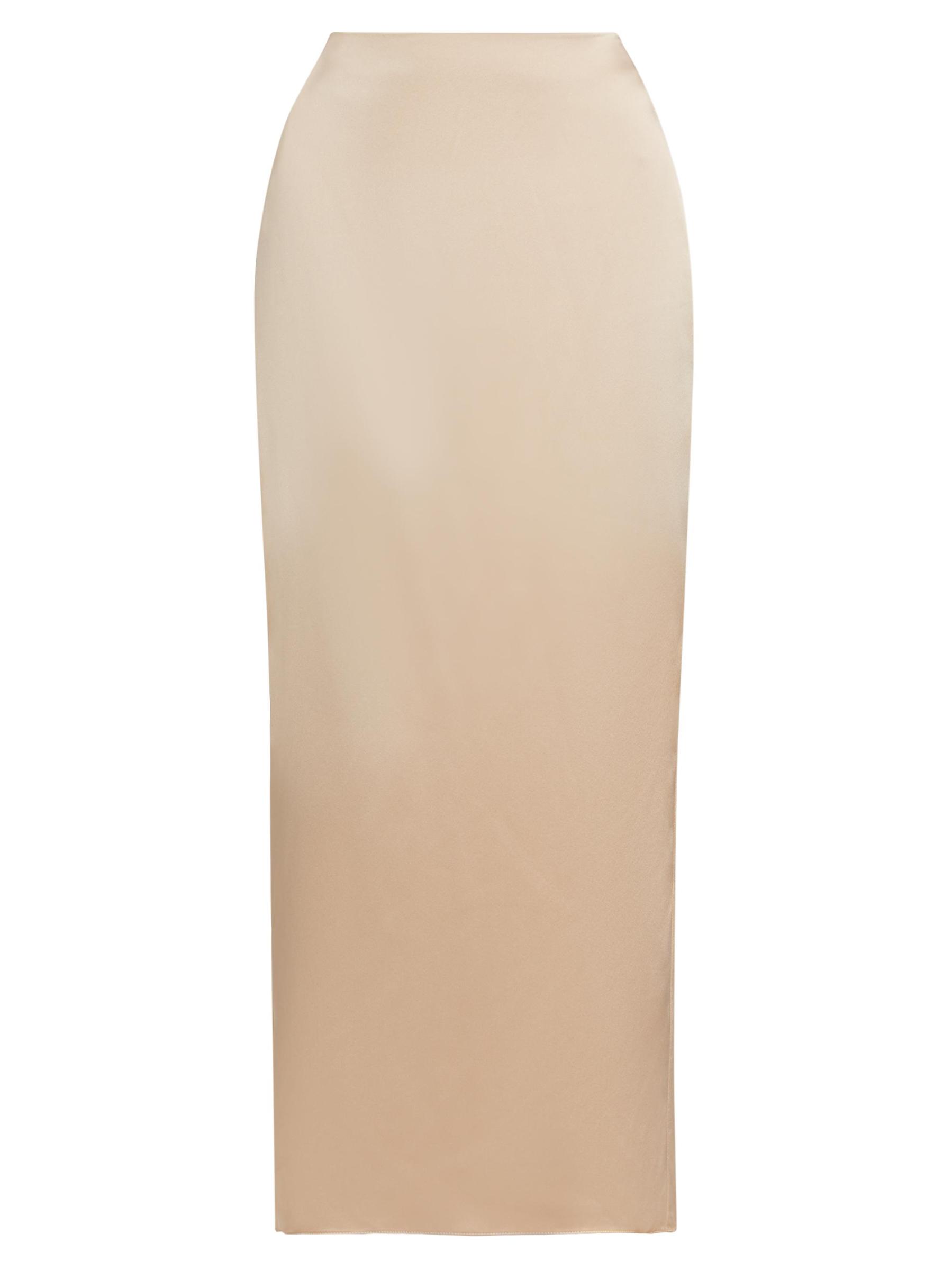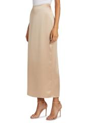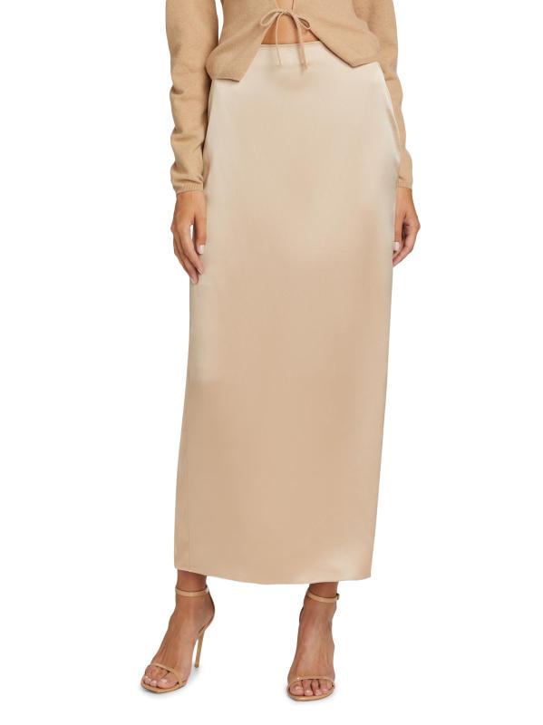 تتميّز التنورة الطويلة ذات القصّة المتحيزة من أليخاندرا ألونسو روخاس المصنوعة من الحرير اللامع، بخصر مهيكل وشق خلفي أنيق.