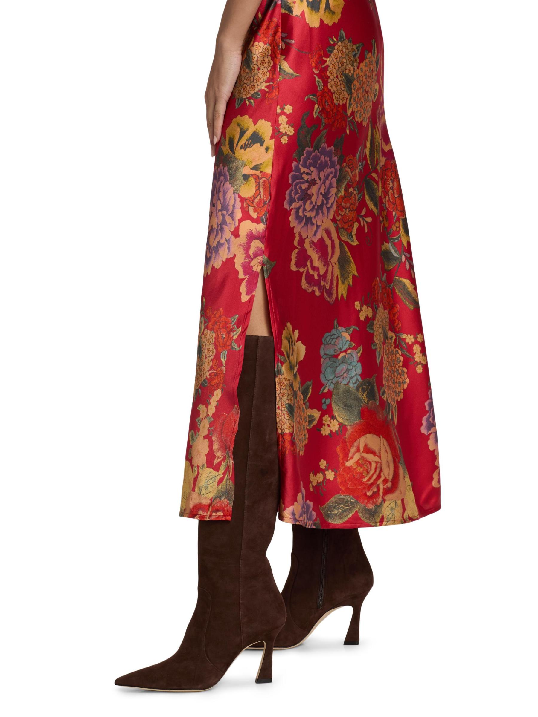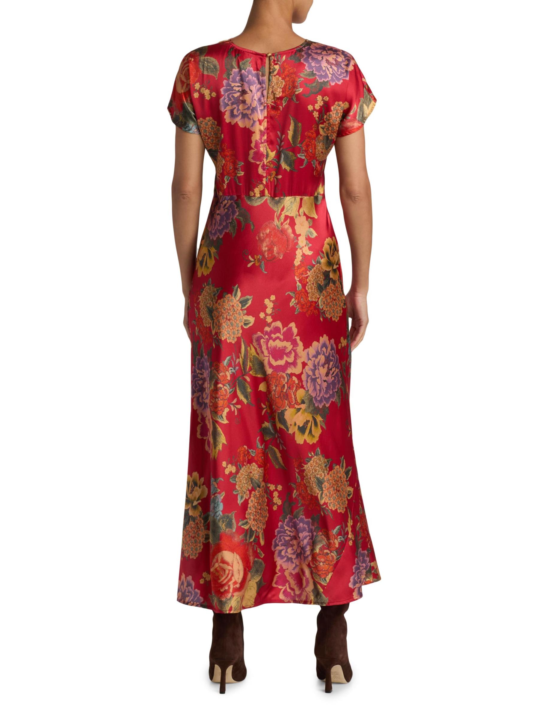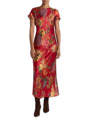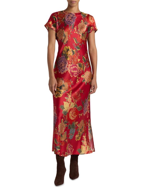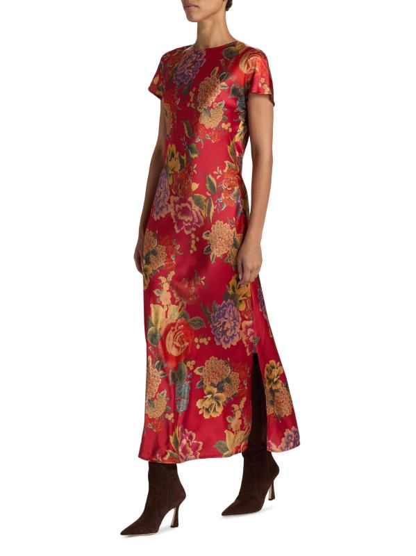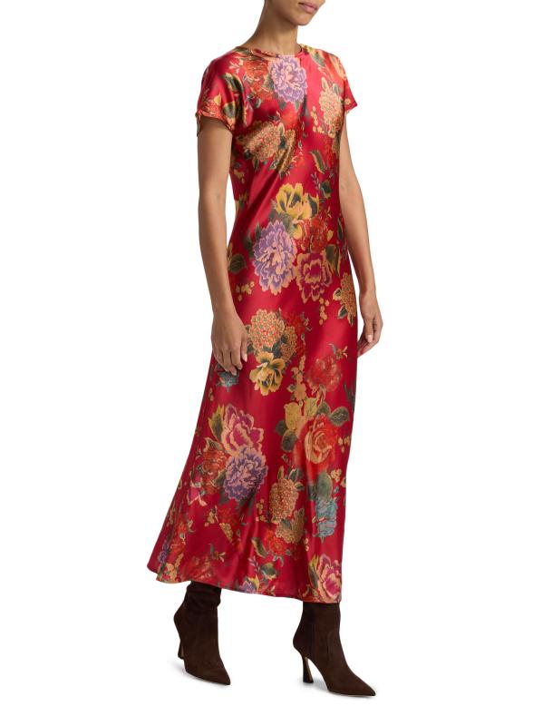يُظهر فستان Bias Dolman المتوسط من Johnny Was زخارف نباتية مذهلة على الساتان الناعم اللامع. تتميز هذه القطعة، المُحاطة بأكمام قصيرة، برقبة دائرية وشق جانبي.