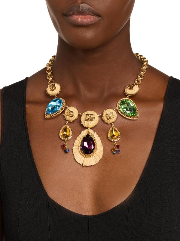 تجمع قلادة Bijoux المميزة من Dolce&Gabbana بين حليات الشعار المنسوجة وأحجار الراين الكبيرة الحجم المقطوعة على شكل كمثرى بألوان زاهية لإطلالة مذهلة.