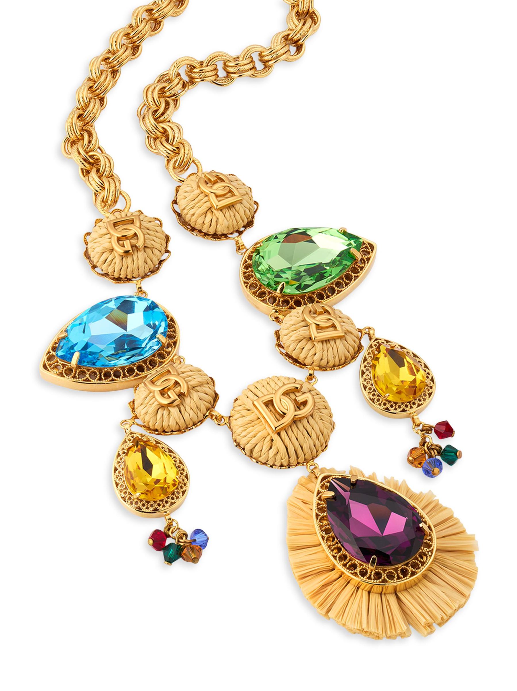 تجمع قلادة Bijoux المميزة من Dolce&Gabbana بين حليات الشعار المنسوجة وأحجار الراين الكبيرة الحجم المقطوعة على شكل كمثرى بألوان زاهية لإطلالة مذهلة.أحجار الراين الزجاجية فيسكوز نحاس مشبك لوبستر صُنع في إيطاليا