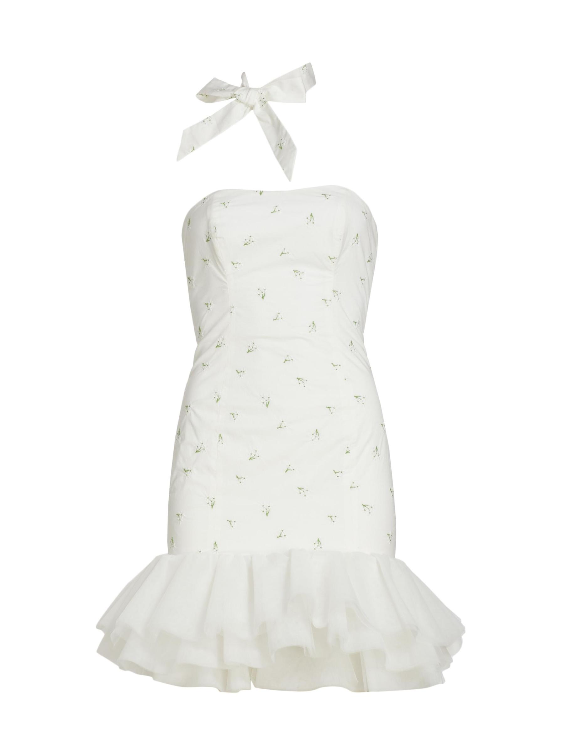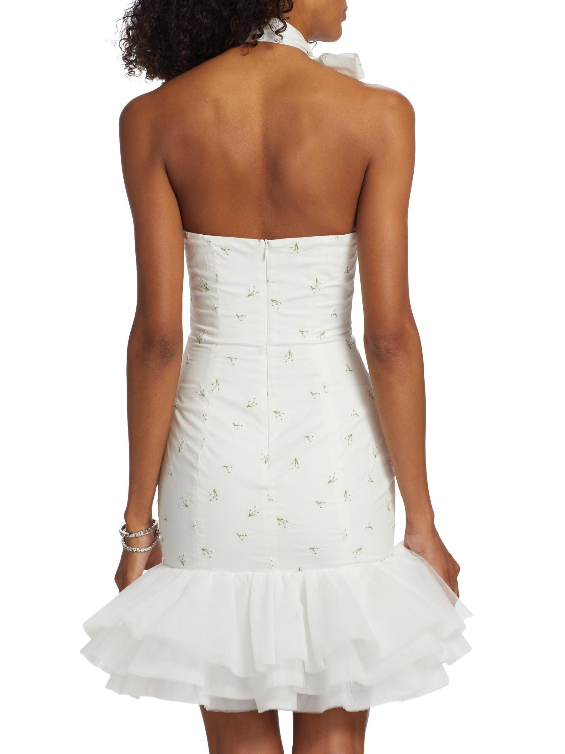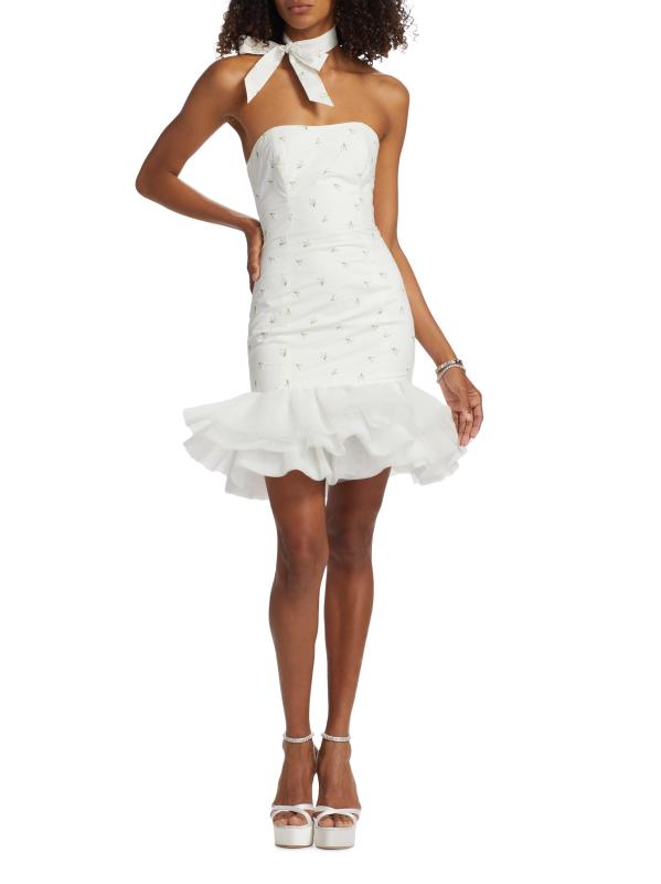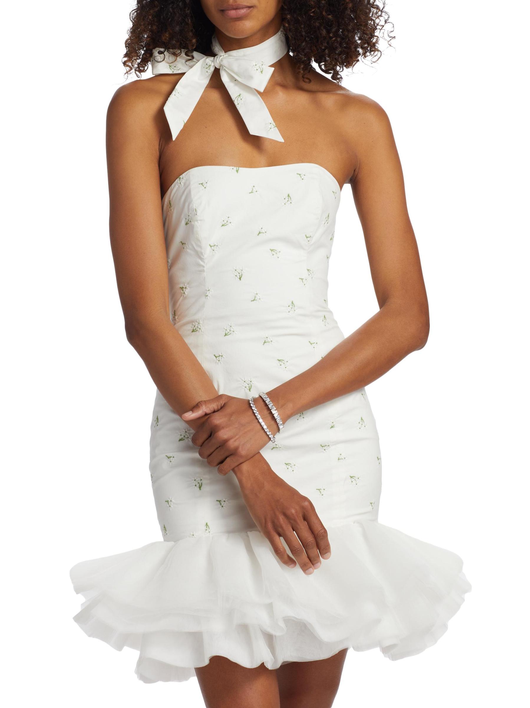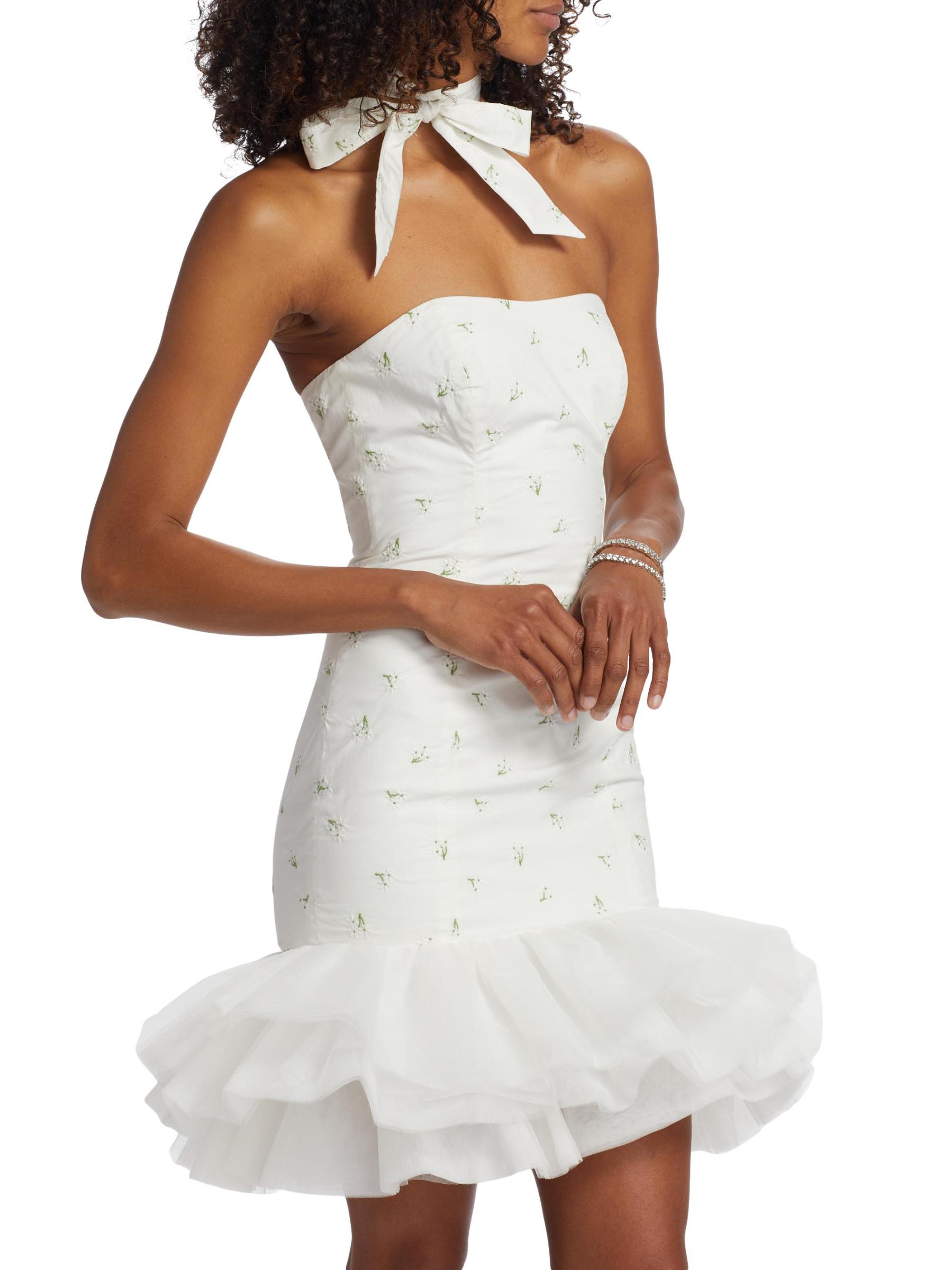 يتميز فستان Blake الصغير من The Bar بتصميم ضيق مع حافة واسعة من التل. يُحدد المظهر بتطريز الأزهار ووشاح الرقبة المطابق.