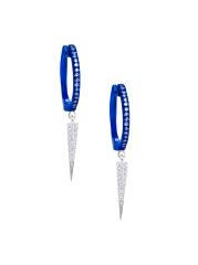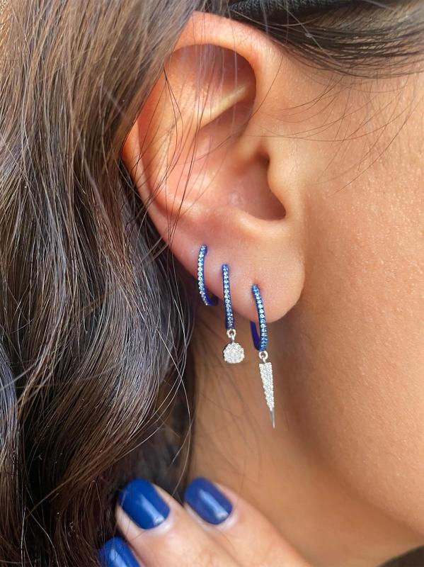 تتميّز أقراط «هاغي هوب» من «ميرا تي» المصنوعة من الذهب الأبيض عيار 14 قيراطًا والمطلي بالروديوم الأزرق بقطرات على شكل خنجر مرصّعة بالألماس اللامع.