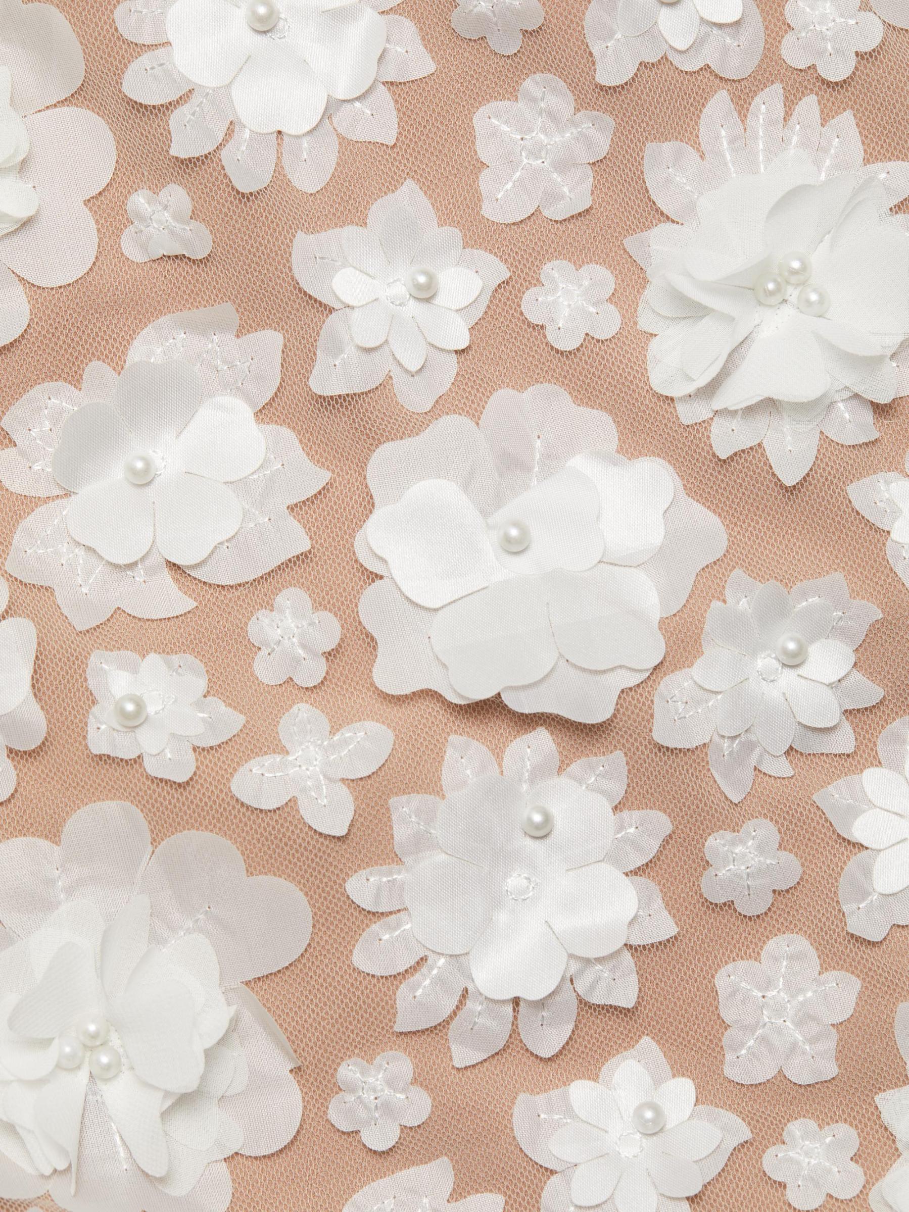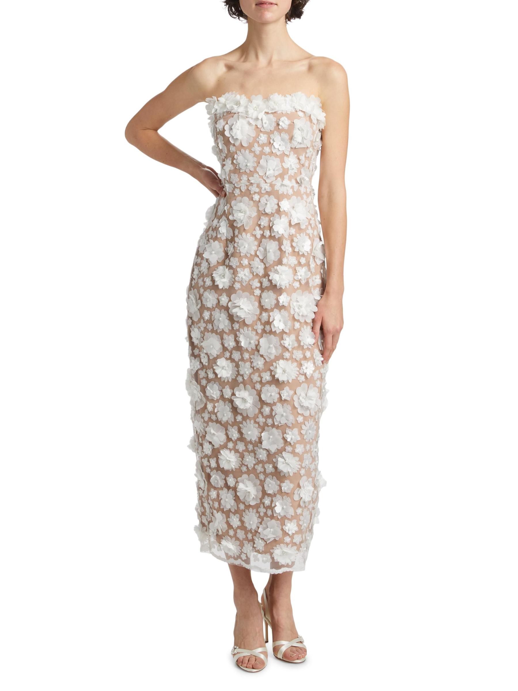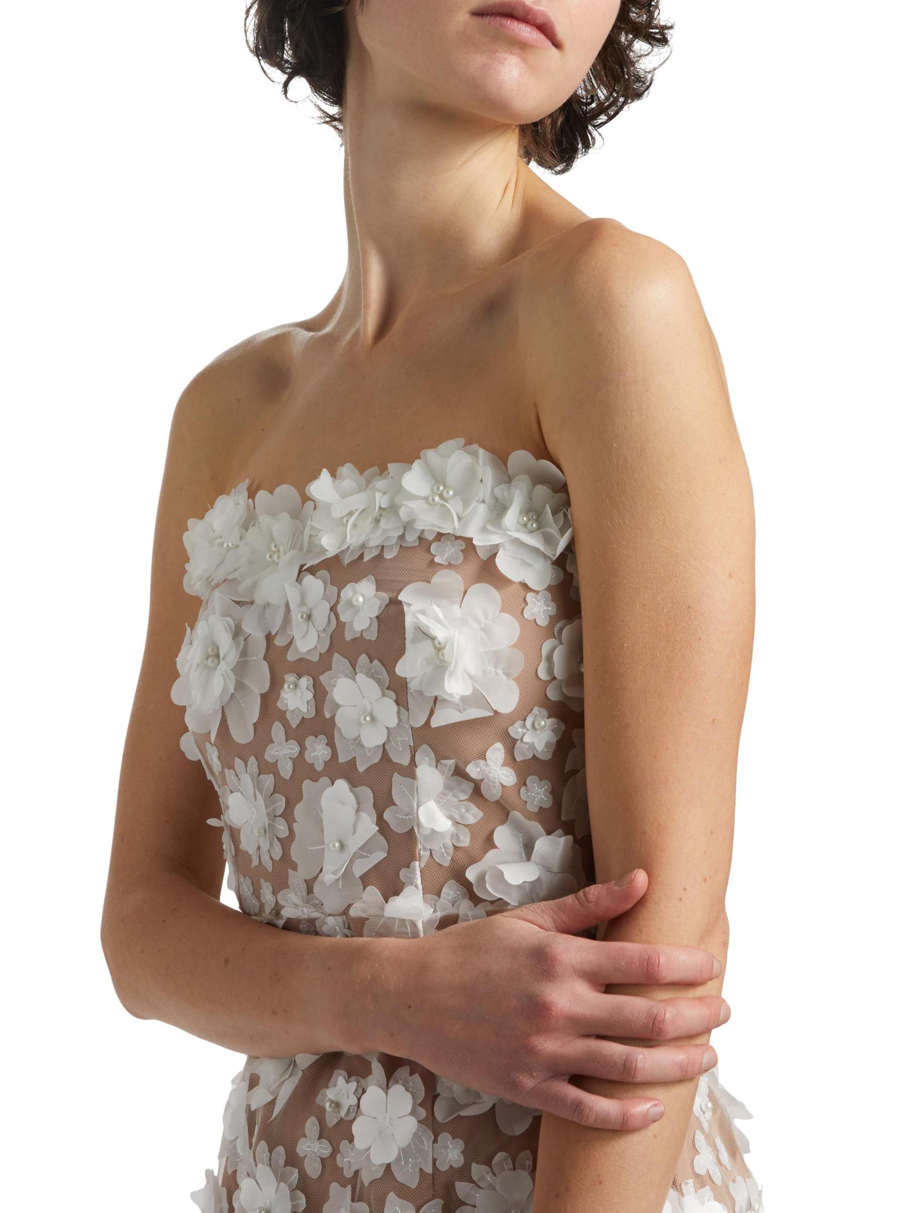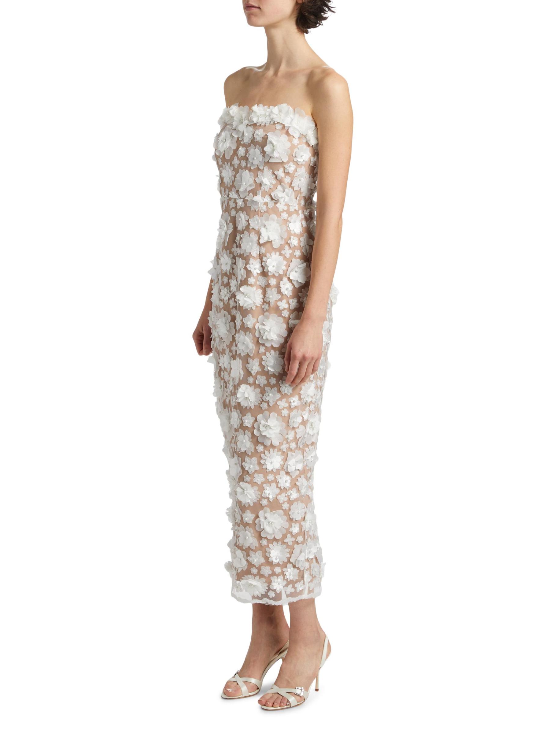 من مجموعة العروس والضيوف. يُبرز فستان Bluebell متوسط الطول بدون حمالات من Elliatt أناقة عصرية مع أحزمة قابلة للإزالة وصدّار ضيق يتميز بعظام للحصول على صورة ظلية خالية من العيوب. صُنعت هذه القطعة من الزهور الفاخرة ثلاثية الأبعاد واللؤلؤ الصناعي، وتتميز بفتحة في منتصف الظهر.