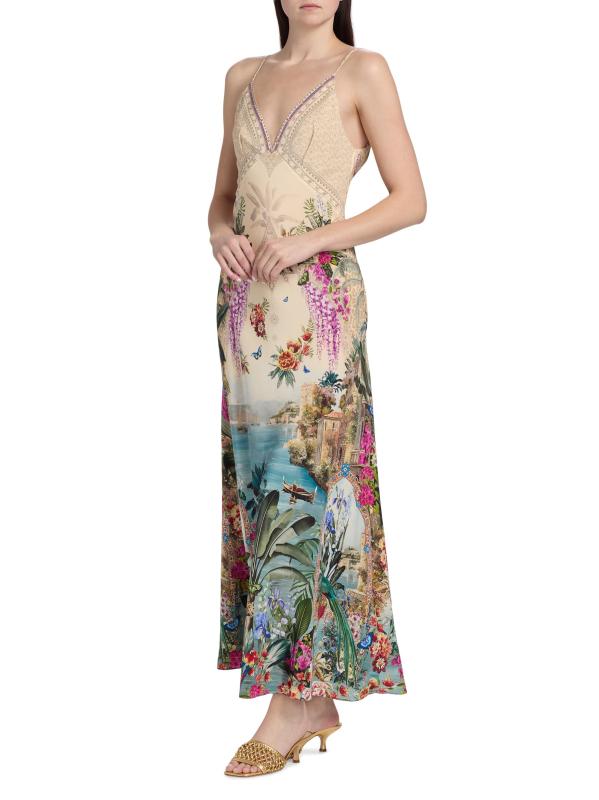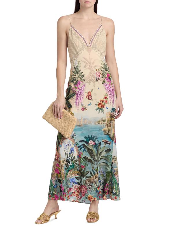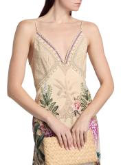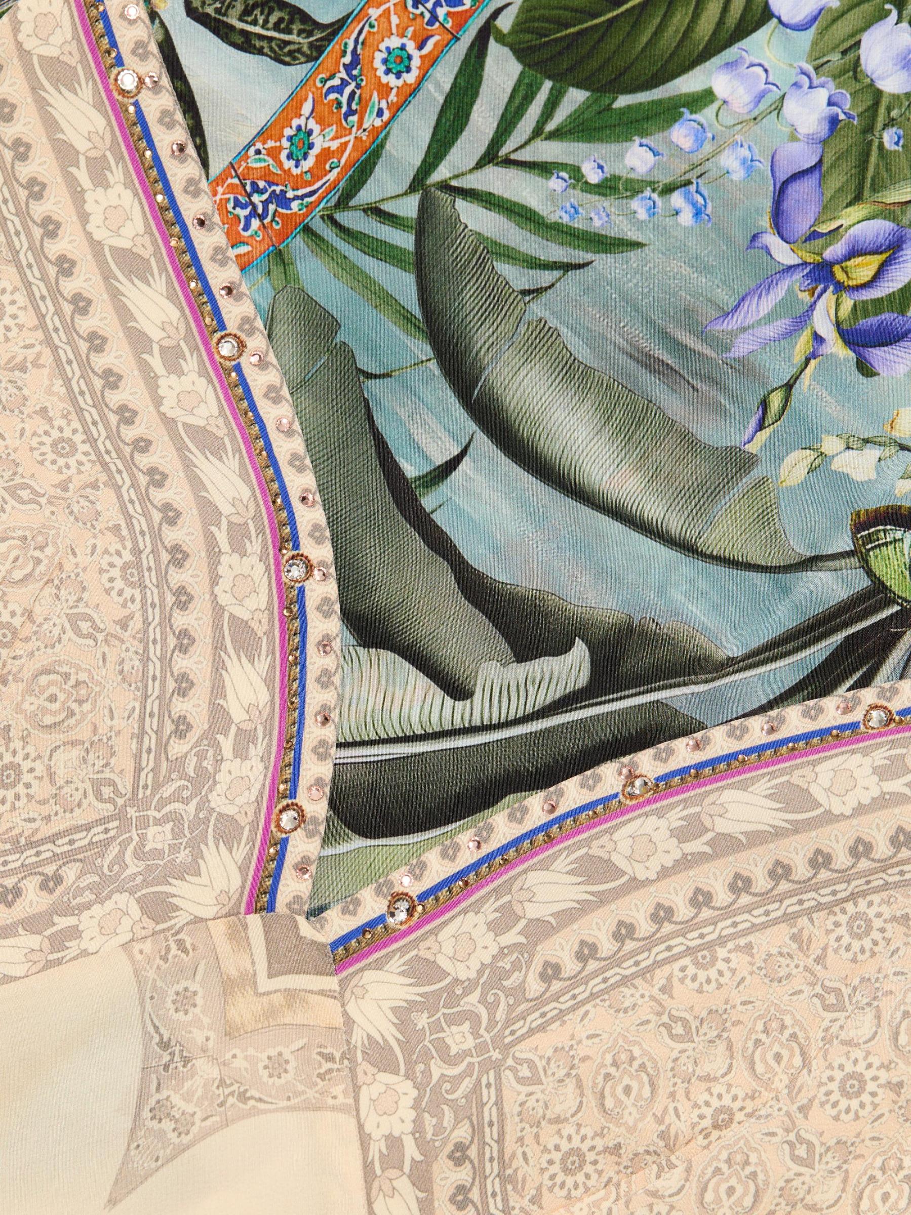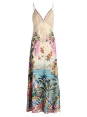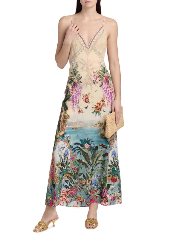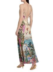هذا الفستان ذو الشكل الهرمي من كاميلا مصنوع من الحرير ويتميز بطبعة Bodrum Botanicals بزخارف استوائية وزهرية وحيوانية في لوحة ألوان متعددة.