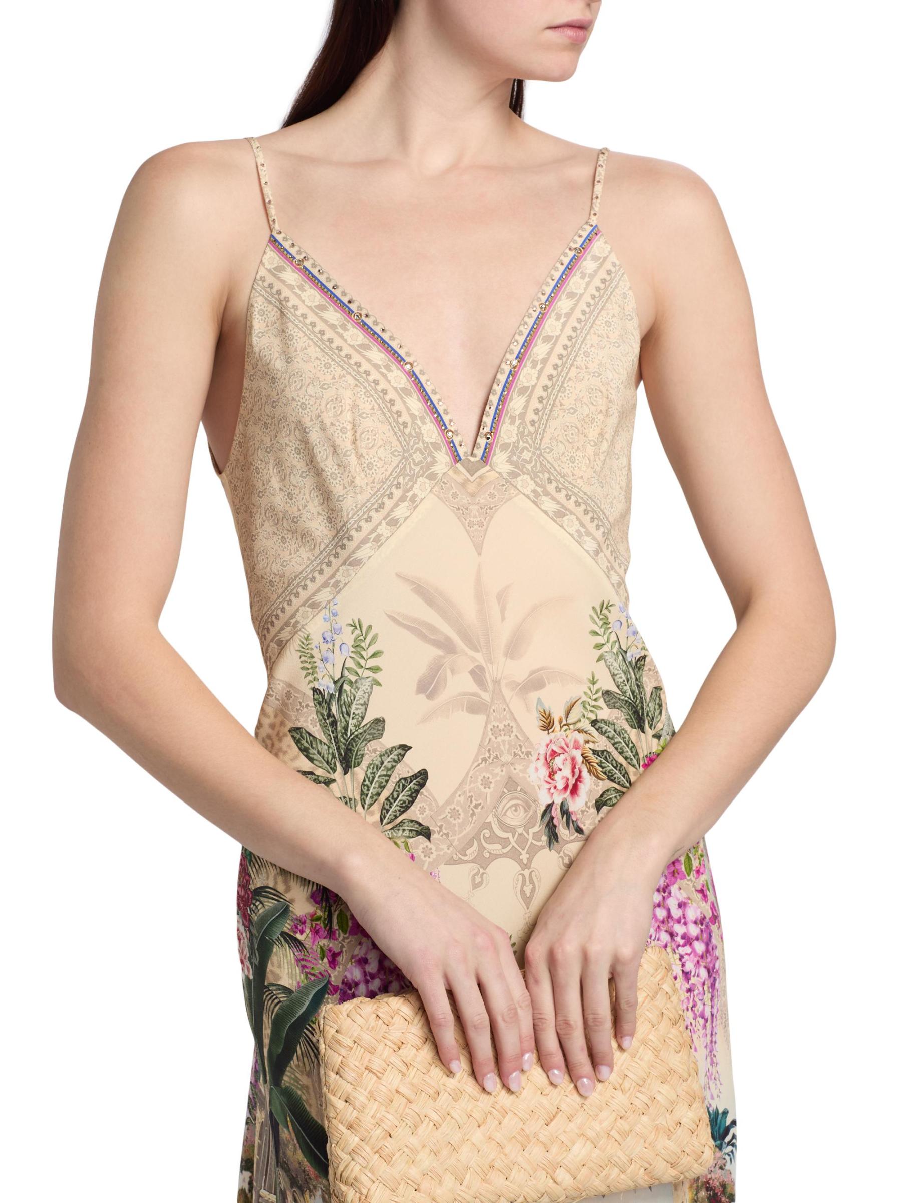 هذا الفستان ذو الشكل الهرمي من كاميلا مصنوع من الحرير ويتميز بطبعة Bodrum Botanicals بزخارف استوائية وزهرية وحيوانية في لوحة ألوان متعددة.فتحة رقبة واسعة على شكل حرف V وظهر على شكل حرف V أحزمة كتف قابلة للتعديل تسحب حرير بنسبة 100% تنظيف جاف مستوردة