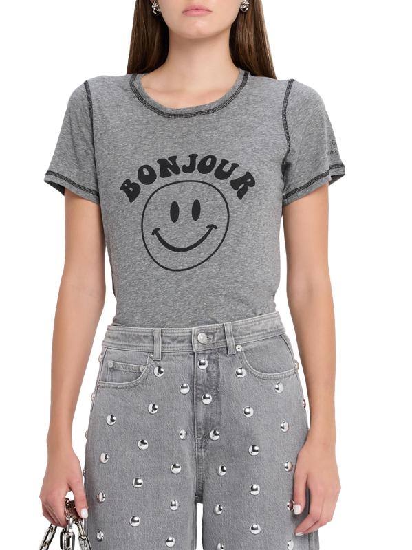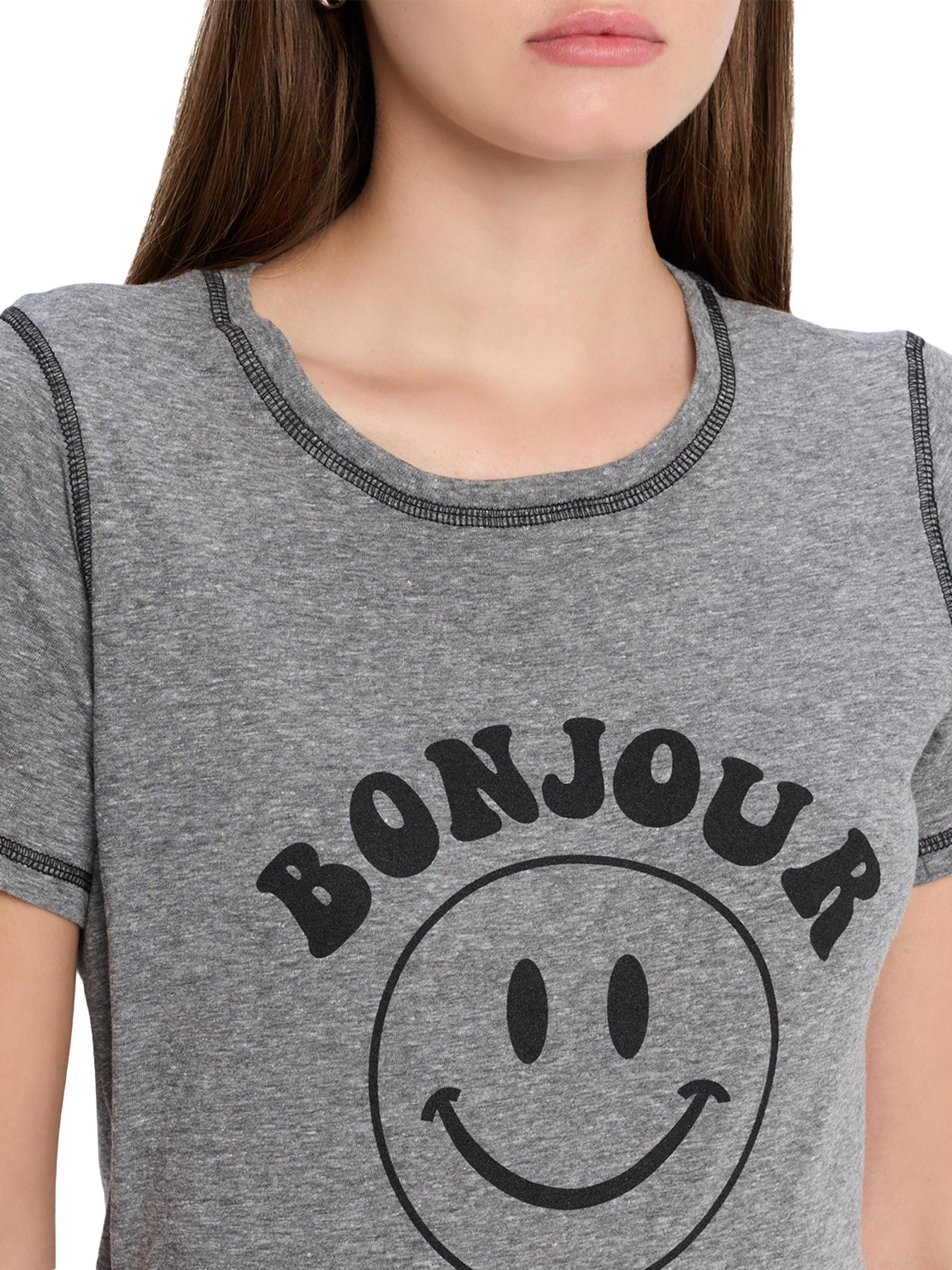 صُمم تي شيرت Bonjour Smiley من Cinq á Sept برسومات Bonjour Smiley برسومات متباينة في الأمام وزخرفة مخيطة.