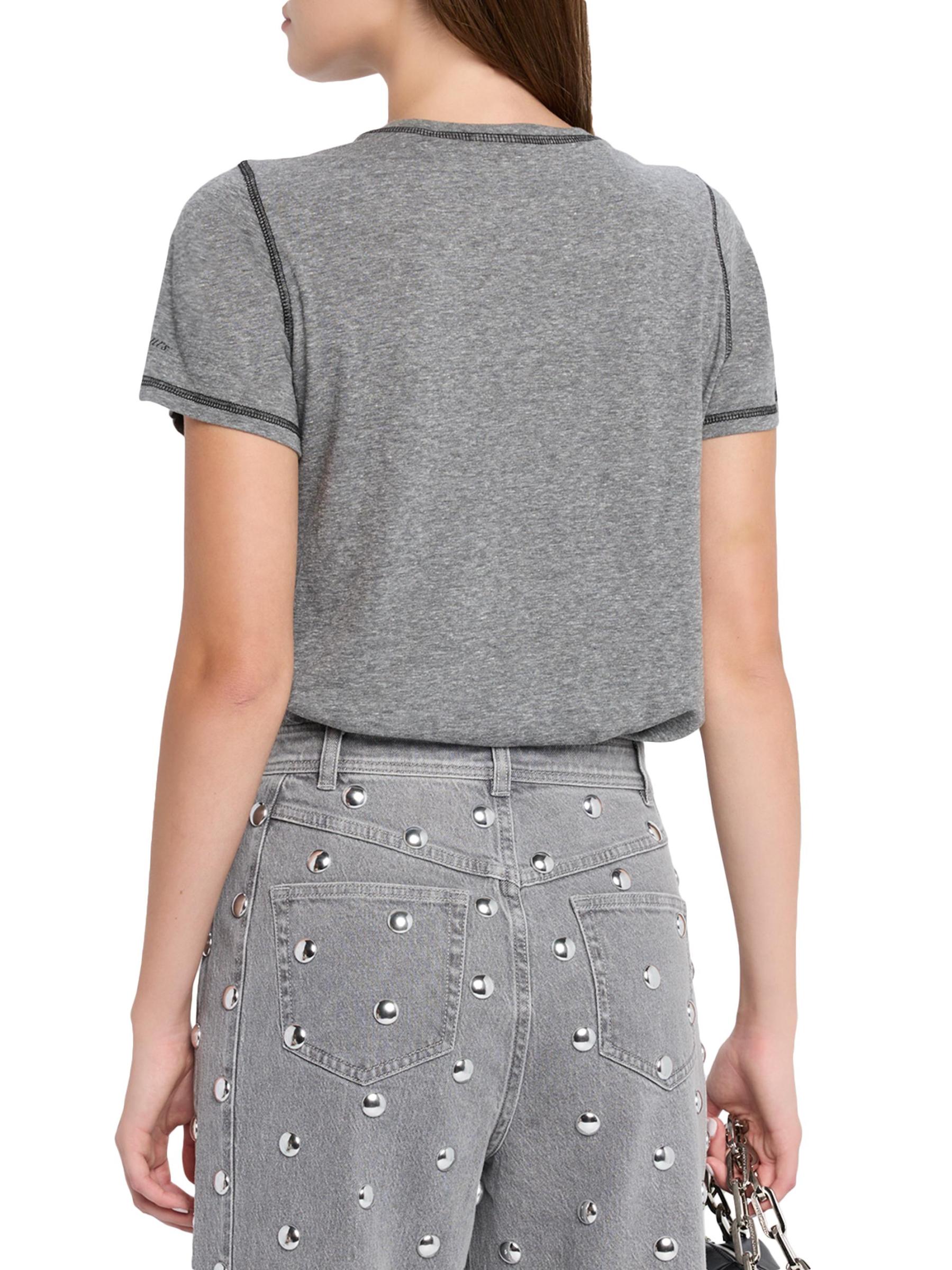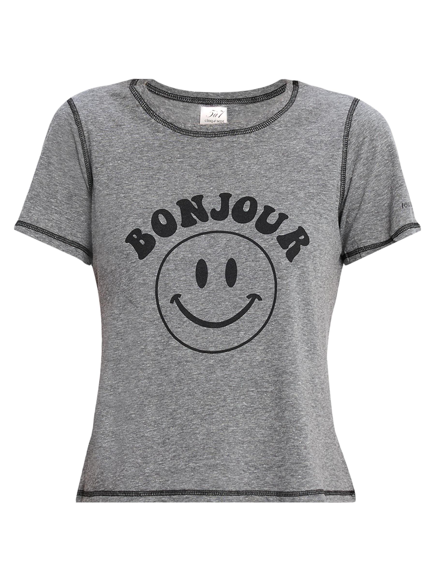 صُمم تي شيرت Bonjour Smiley من Cinq á Sept برسومات Bonjour Smiley برسومات متباينة في الأمام وزخرفة مخيطة.رقبة مستديرة أكمام قصيرة تسحب بوليستر/قطن/رايون/أسيتات سليلوز تنظيف جاف صُنع في الولايات المتحدة الأمريكية