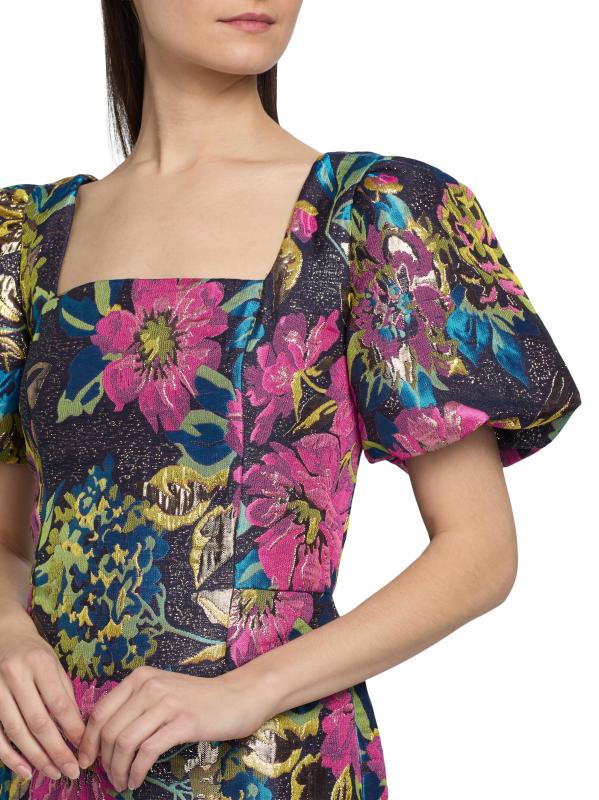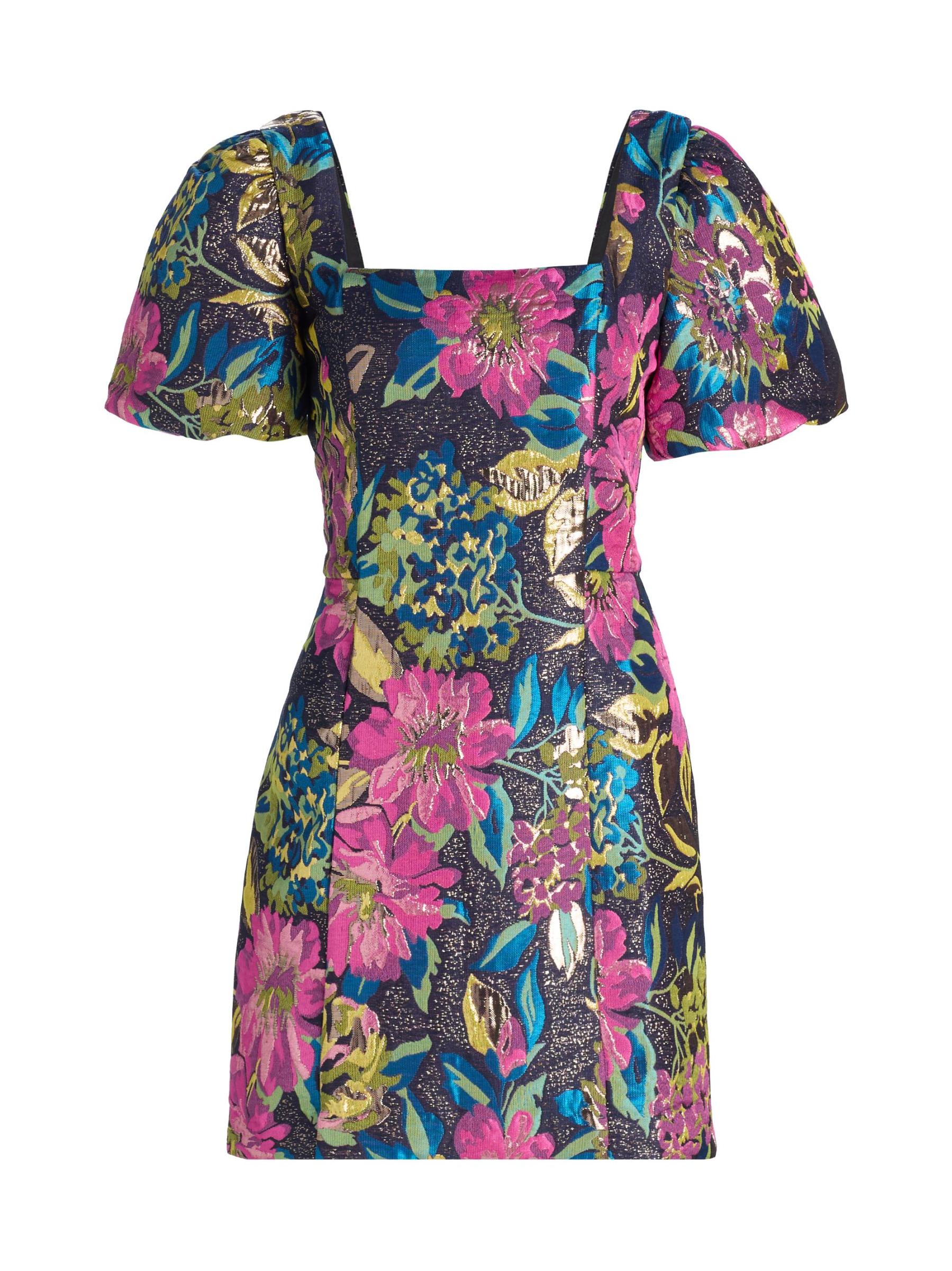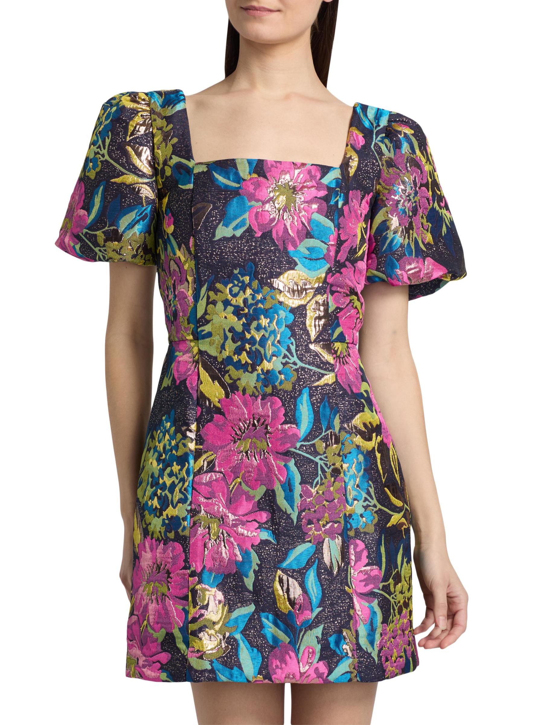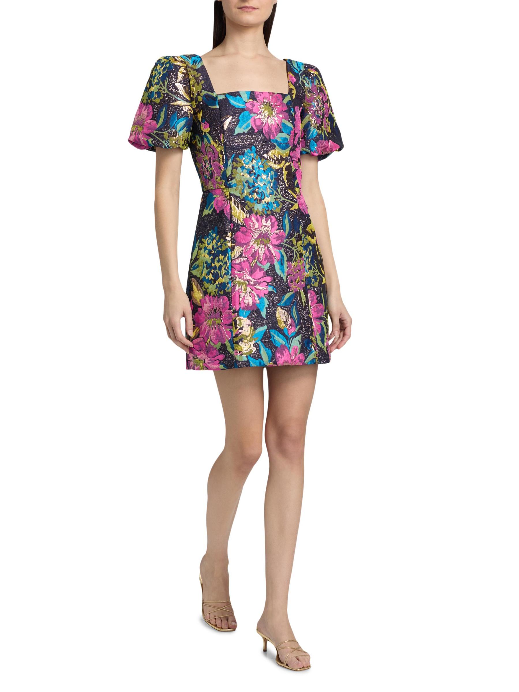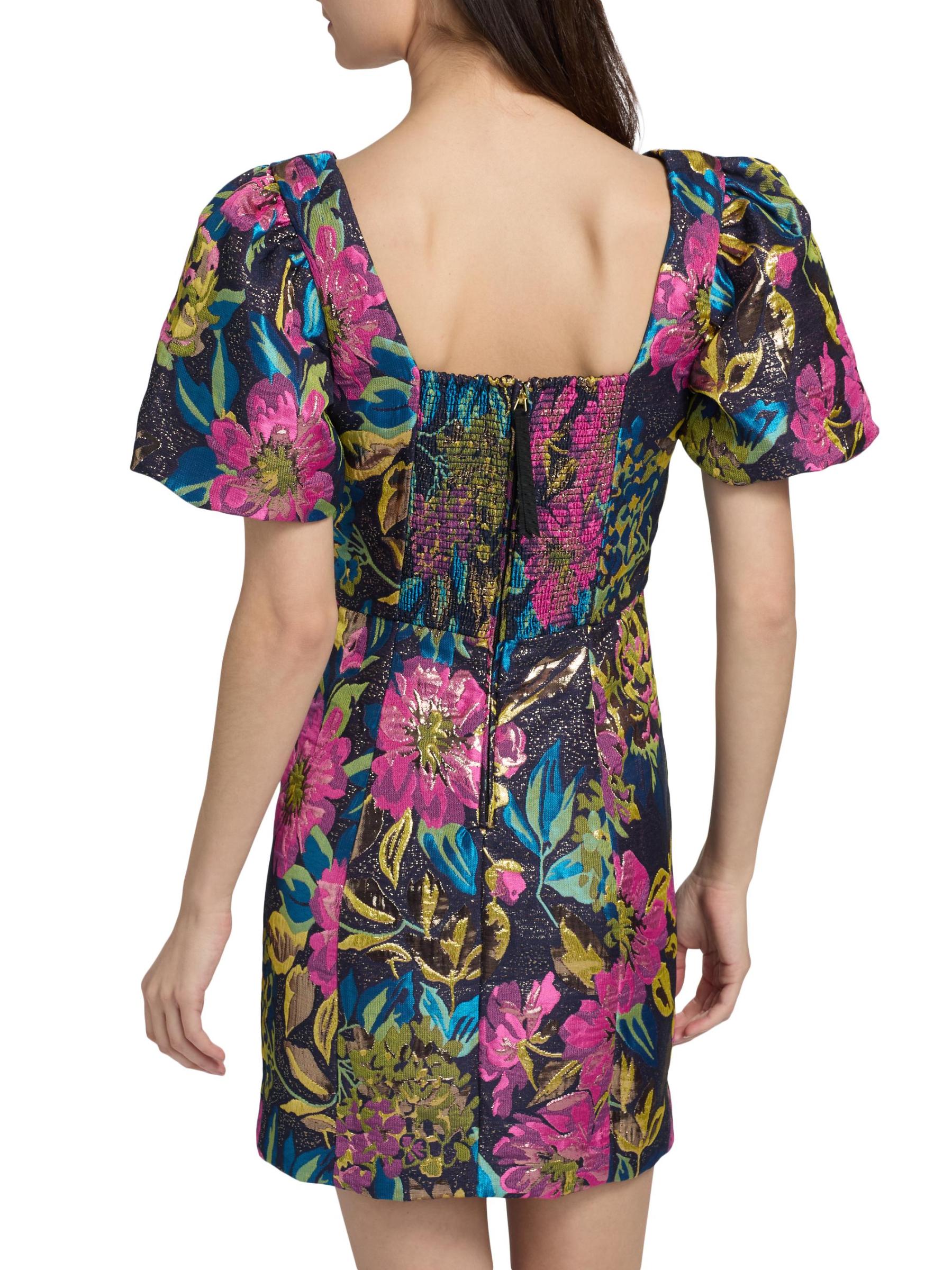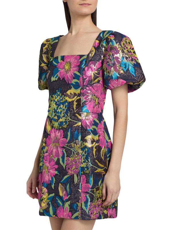 يتميز فستان بوكر القصير من Lilly Pulitzer بتصميم بروكيد معدني مزهّر ومزين بأكمام قصيرة منفوخة وشورت مدمج.