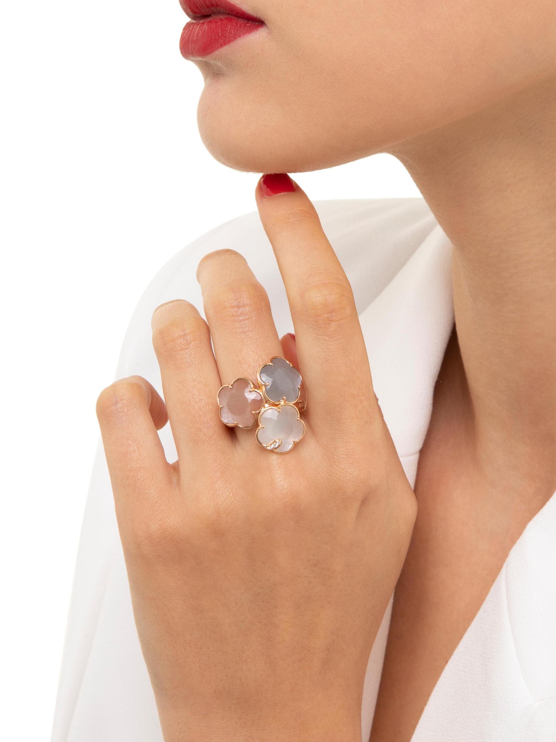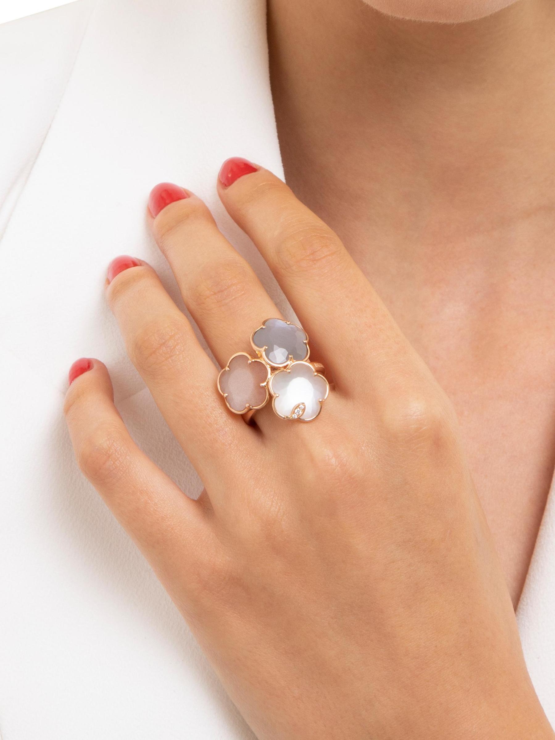 من مجموعة بوكيه لونير. تُبرز مجموعة من أحجار القمر على شكل زهرة بثلاثة ألوان مميزة خاتم Pasquale Bruni المميز، المزين بثلاث ماسات صغيرة لمزيد من اللمعان.