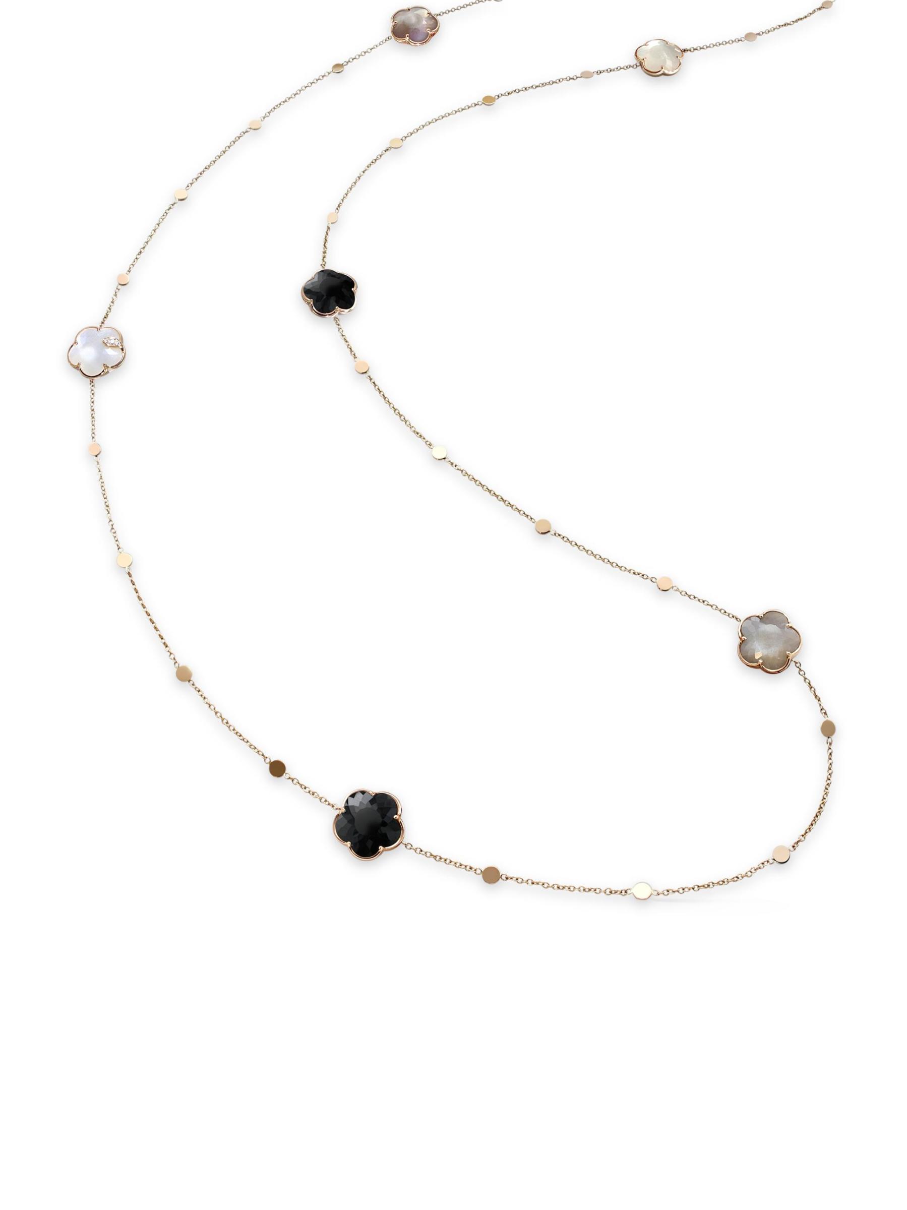 من مجموعة بوكيه لونير. تم تزيين قلادة Pasquale Bruni المزركشة بأحجار القمر البيضاء والرمادية والعقيق الأسود، والمزينة بأحجار الماس المرصوفة المتلألئة. تُبرز هذه الأحجار الكريمة المذهلة قصة بون تون المميزة للدار، والتي تتميز بجوانب ناعمة غير متساوية عند البتلات الخمس ومركز كابوشون ناعم.الماس، 0.04 طن أحجار القمر البيضاء العقيق الأسود ذهب وردي عيار 18 قيراط صُنع في إيطاليا