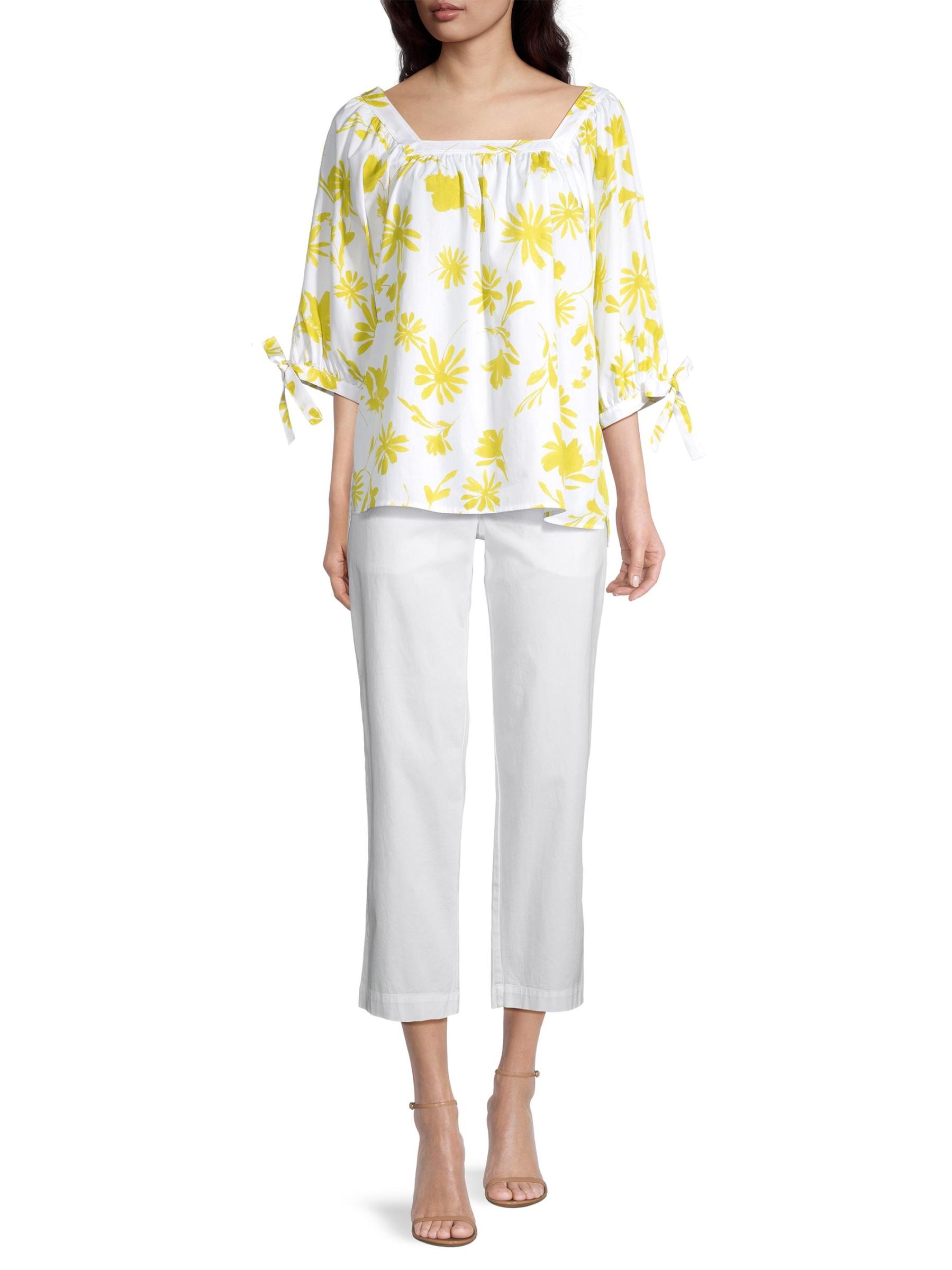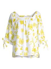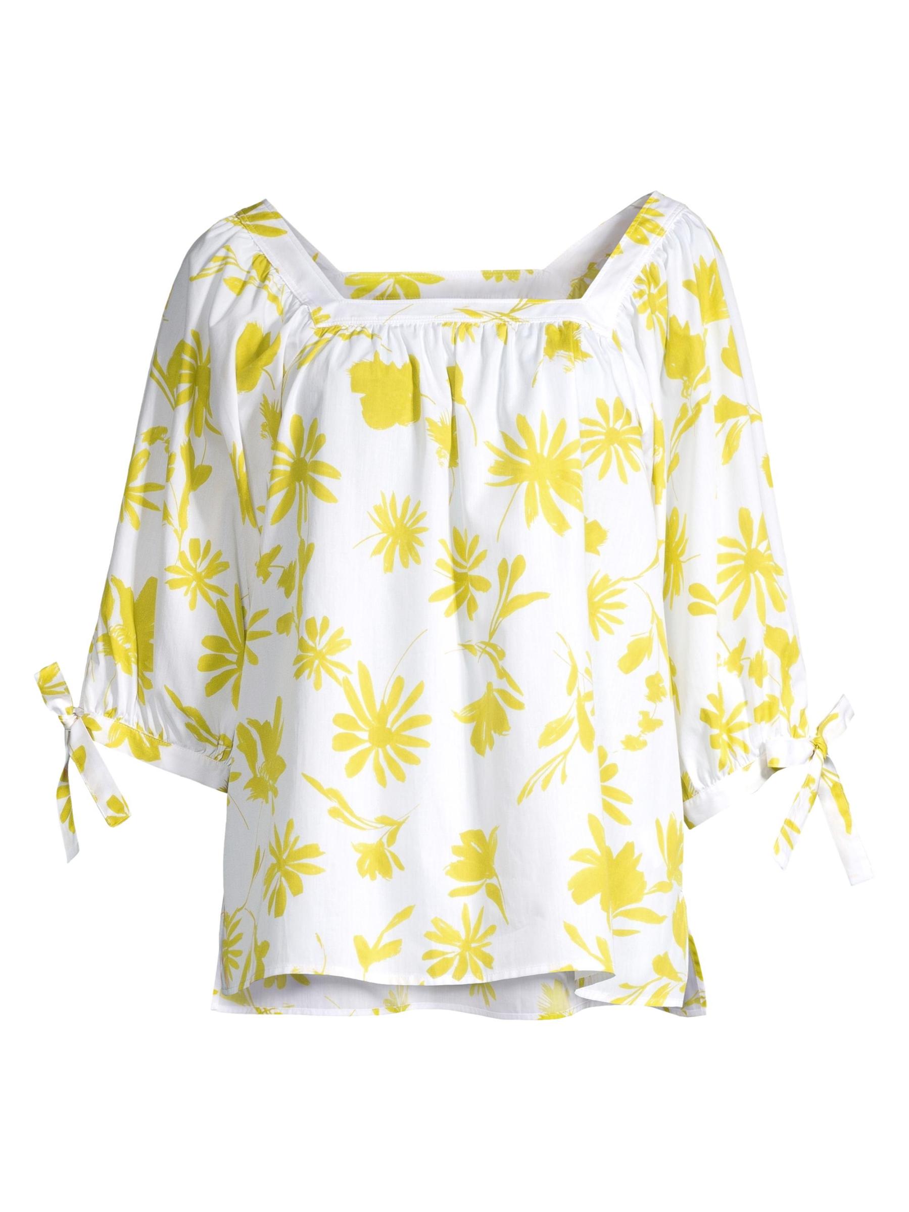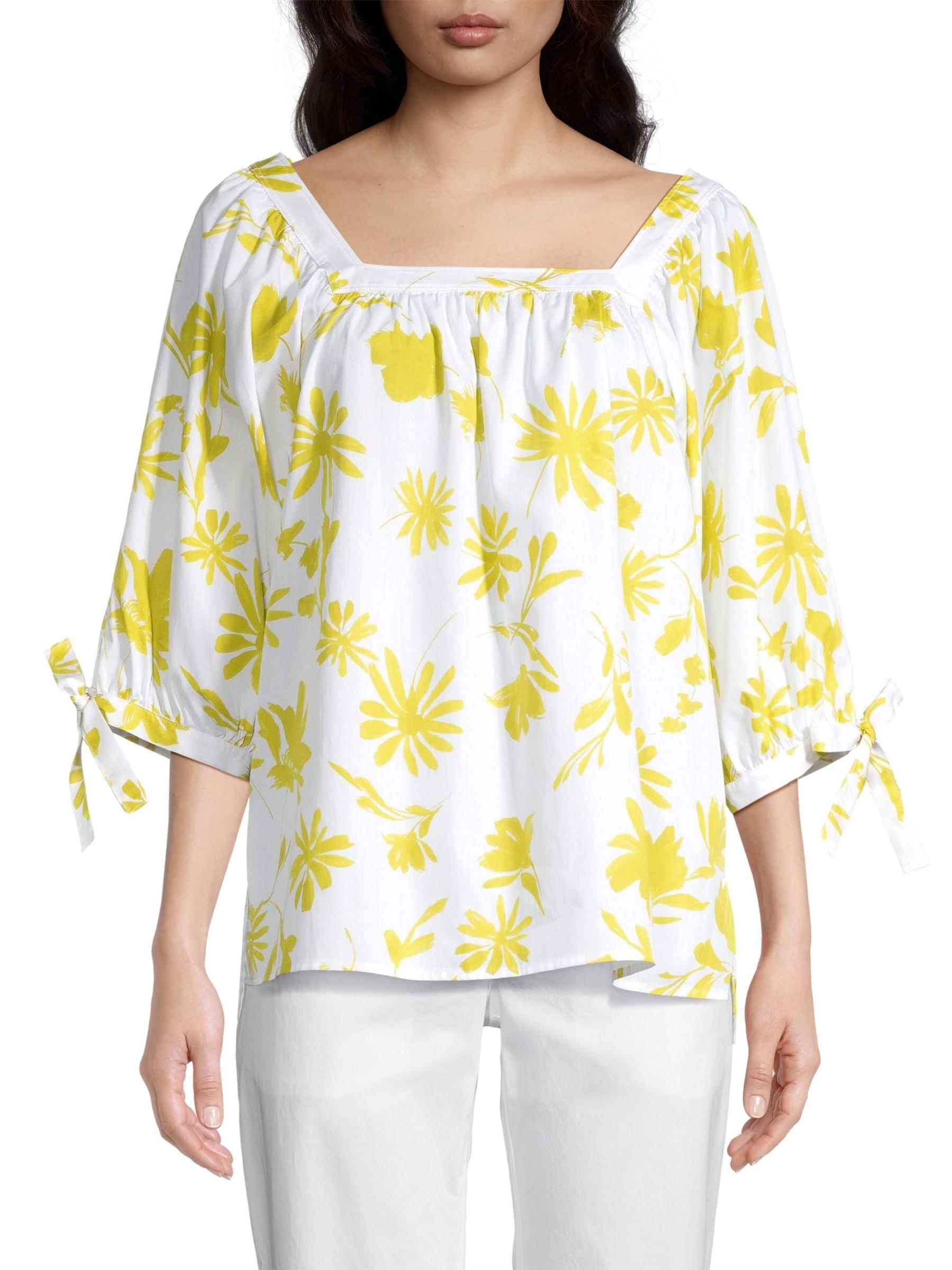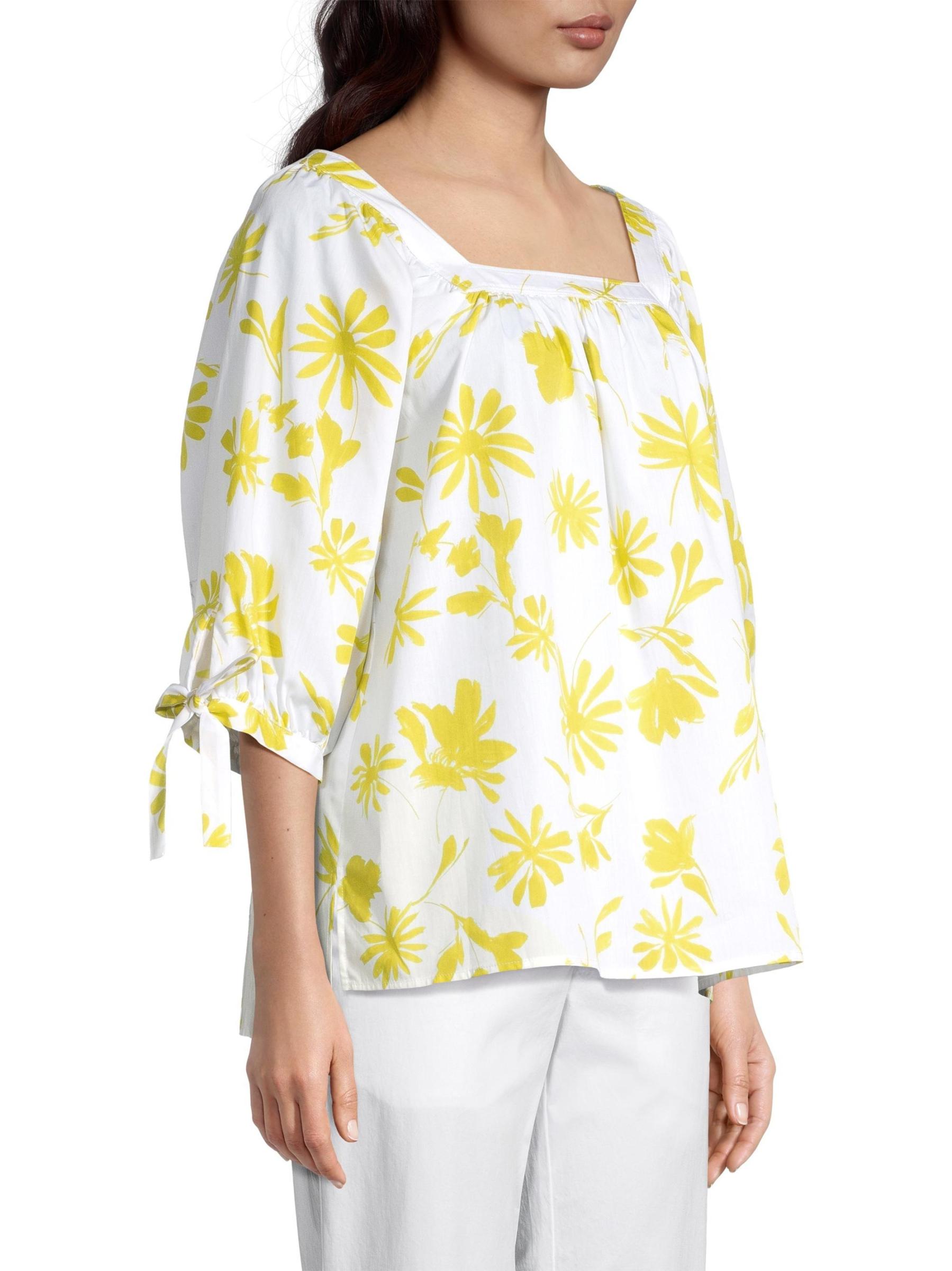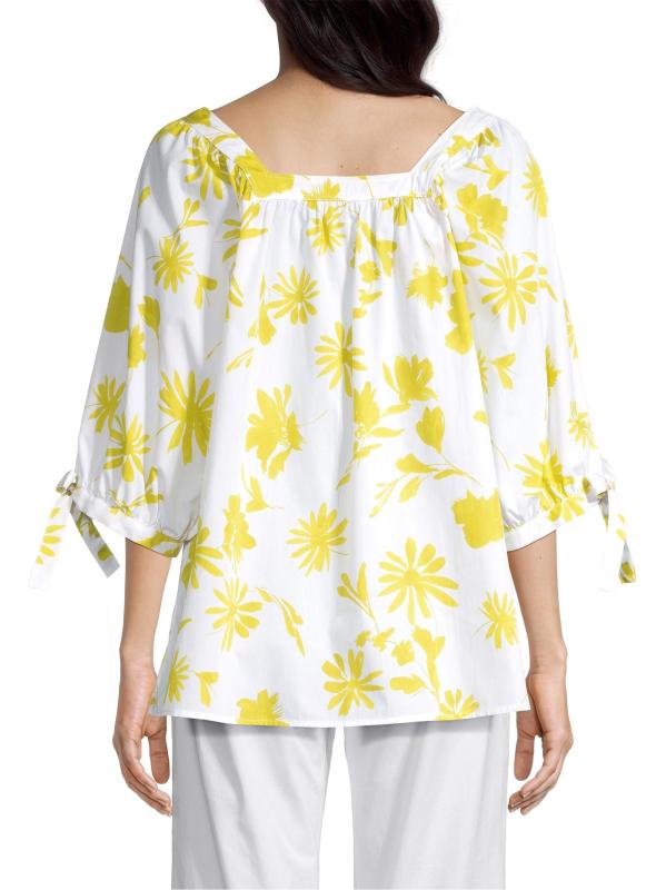 تتميّز بلوزة ROSSO35 القطنية ذات الارتفاع المنخفض بتصميم صندوقي بنقشة زهور متباينة وتفاصيل ربطة ذاتية على الأكمام.