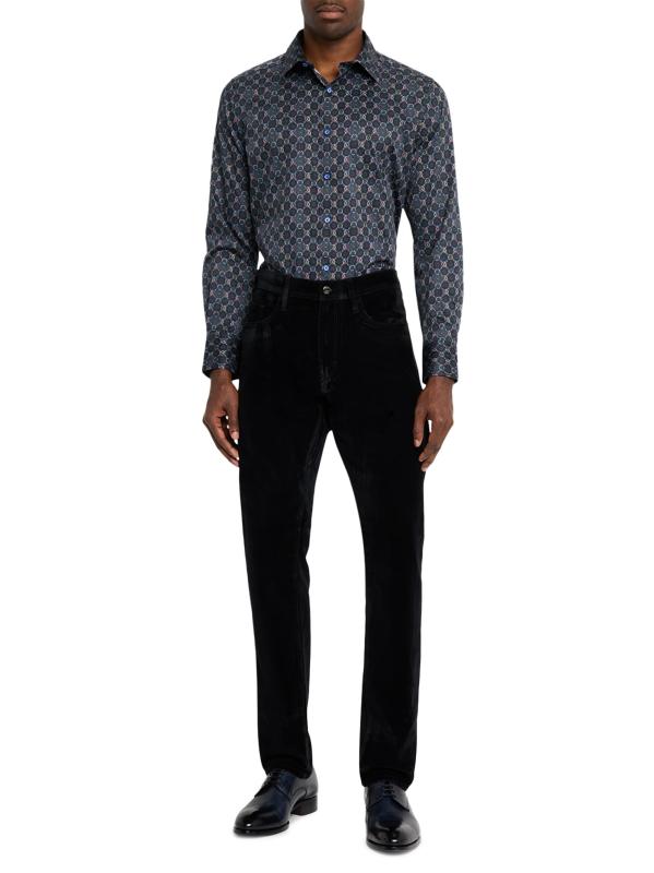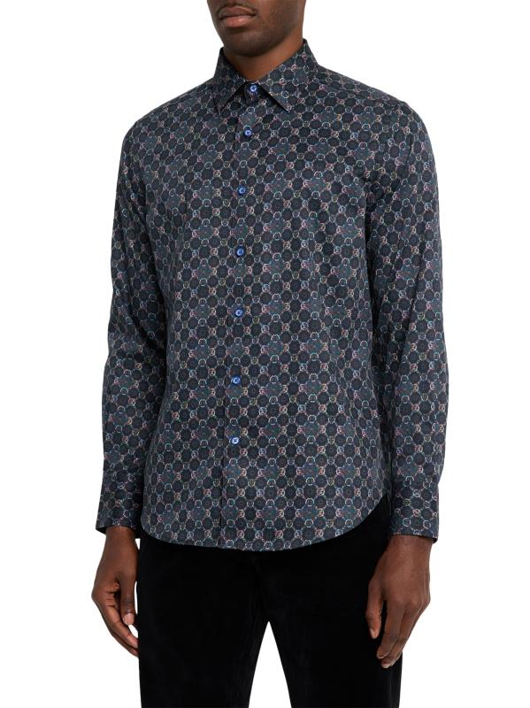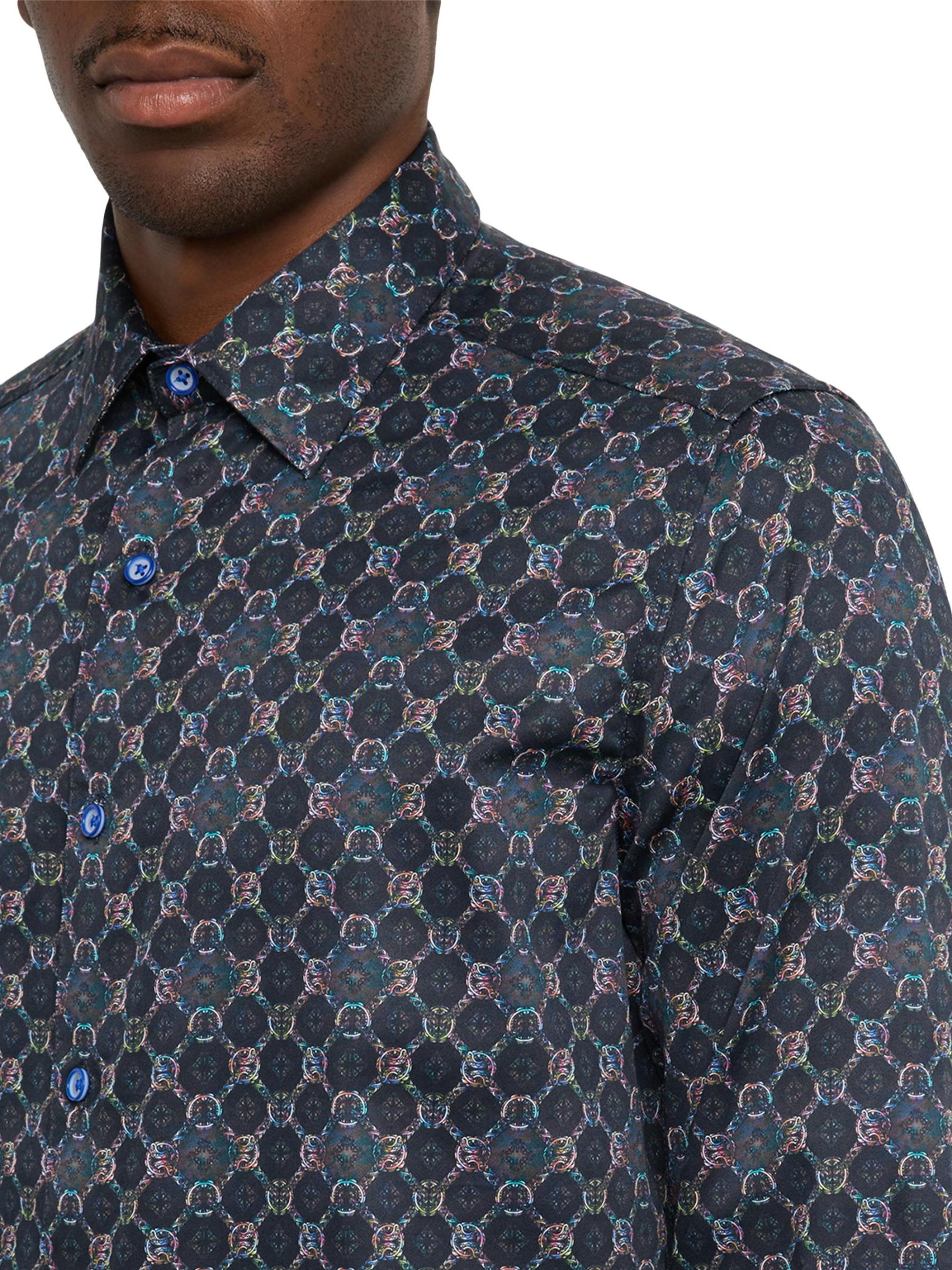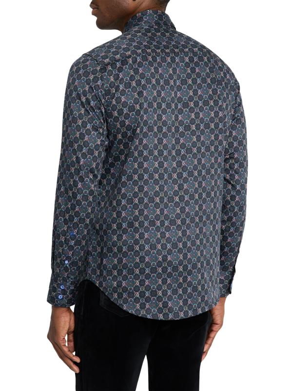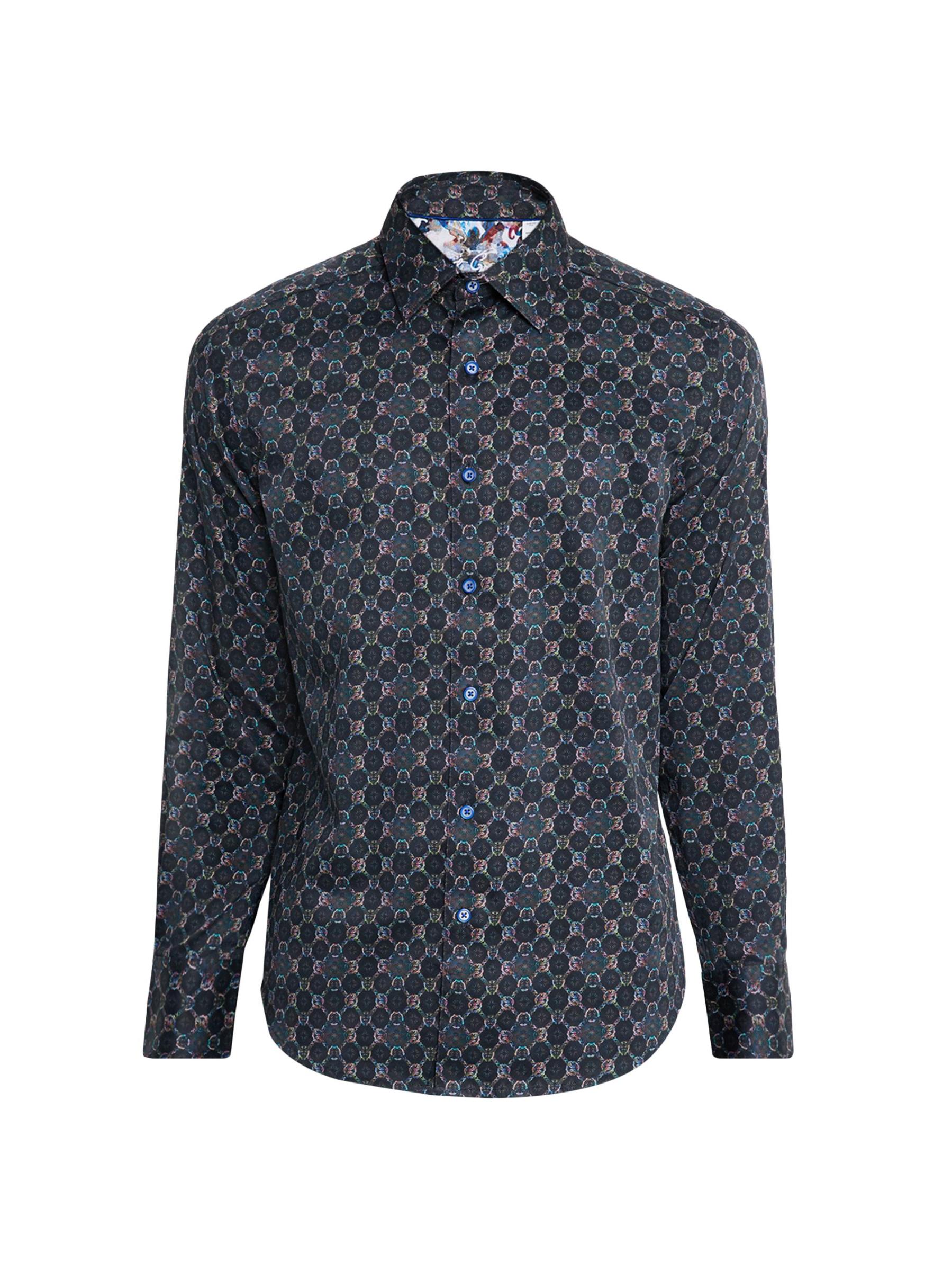 يتميز قميص Bramston ذو الأزرار الأمامية من Robert Graham، المصنوع من الساتان القطني الناعم القابل للتمدد لإضفاء لمسة ناعمة ولمعان رقيق، بطبعة هندسية بألوان متعددة نابضة بالحياة. تُضفي الزخرفة المتباينة على الياقة الداخلية والأكمام لمسة نهائية للمظهر.