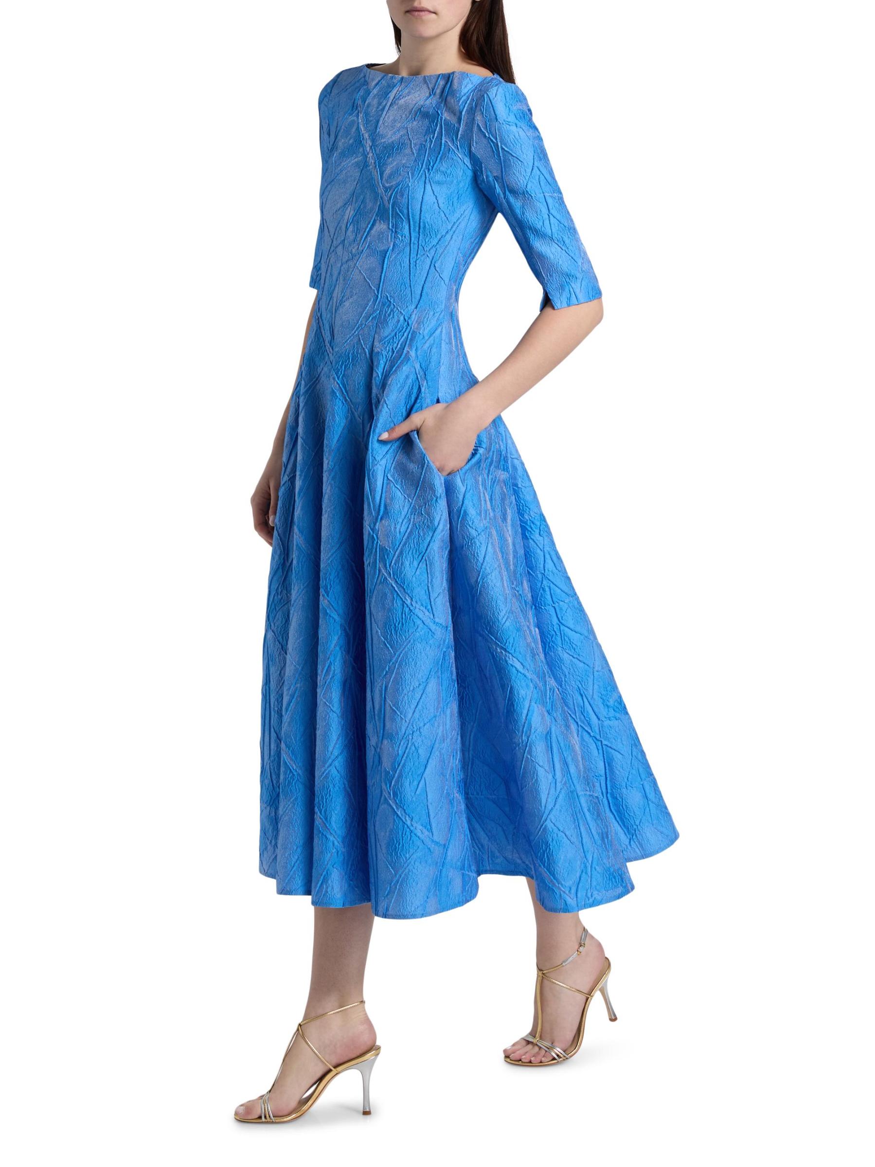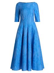 صُنع هذا الفستان بطول الشاي من Talbot Runhof من قماش الجاكار المزركش، ويتميز بألواح مطرزة وأكمام بطول الكوع ورقبة قارب أنيقة.