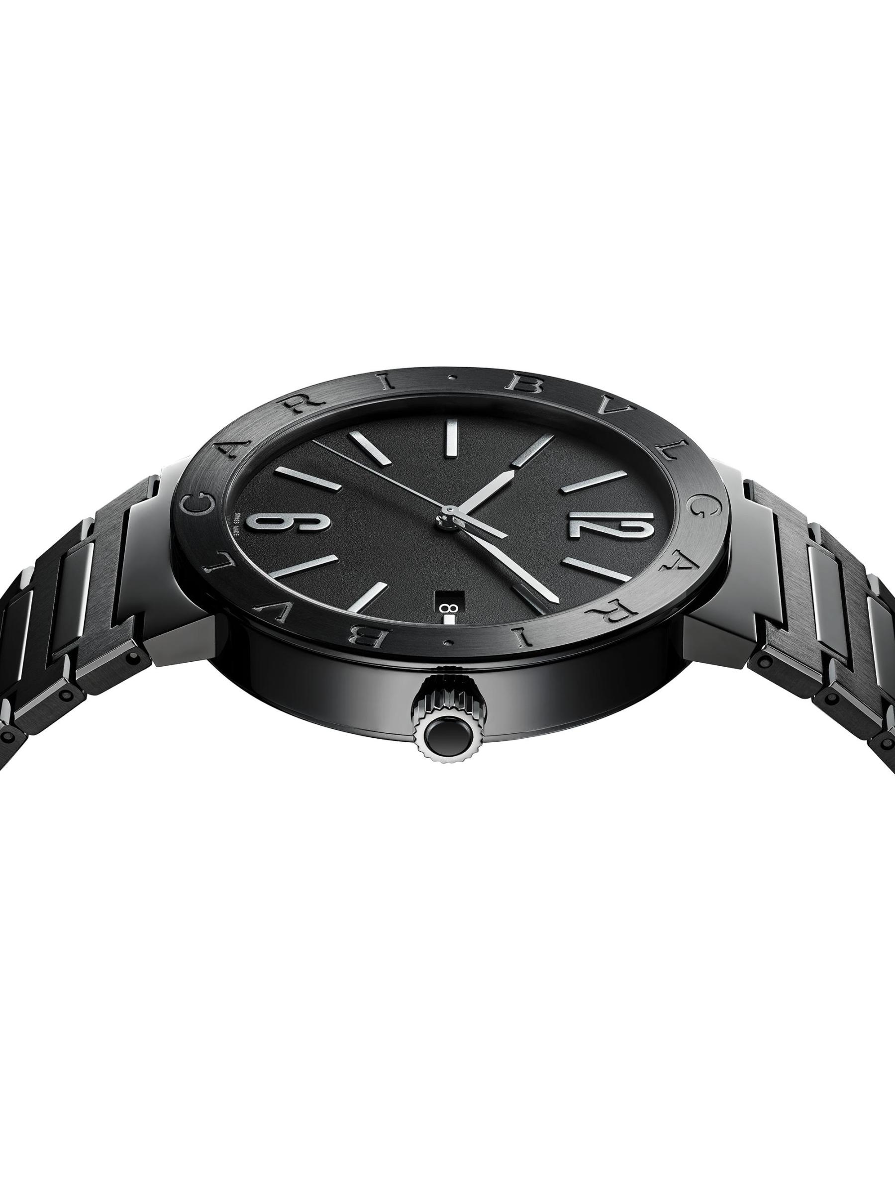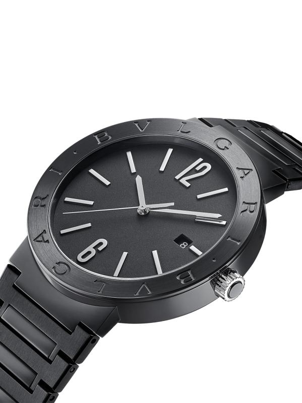 من مجموعة بولغري بولغري. تتميّز ساعة BVLGARI المصنوعة من الفولاذ المقاوم للصدأ باللون الأسود بإطار أنيق منقوش عليه الشعار ومينا بلون متناسق مع عرض التاريخ عند الساعة الثالثة.