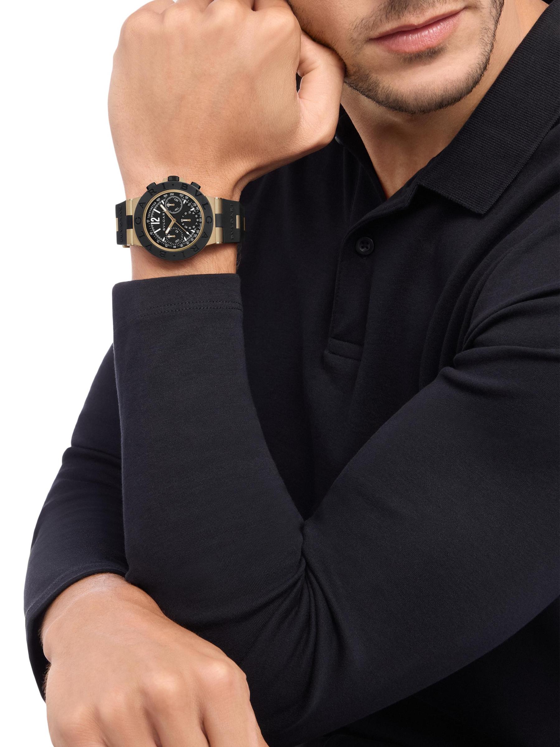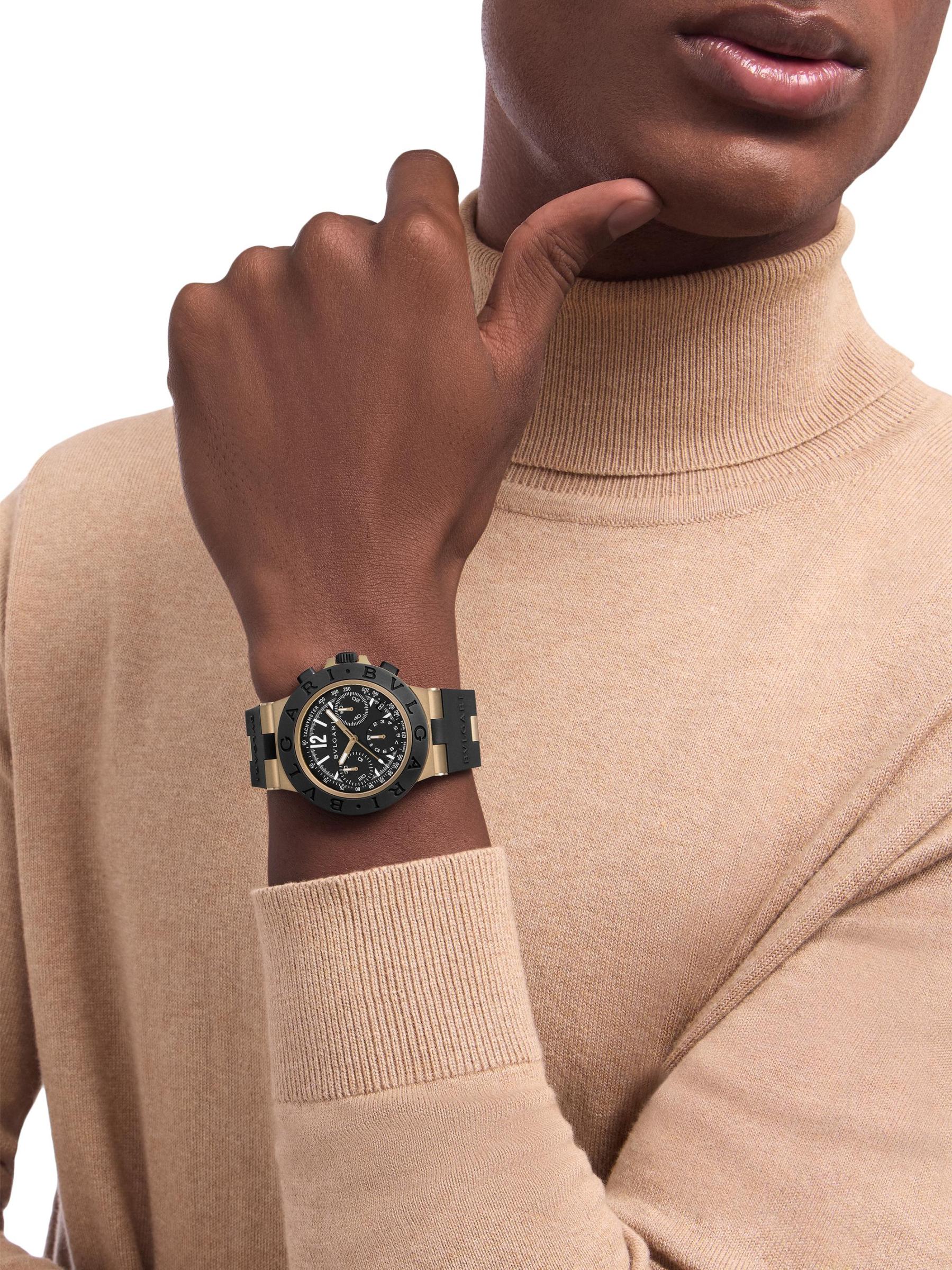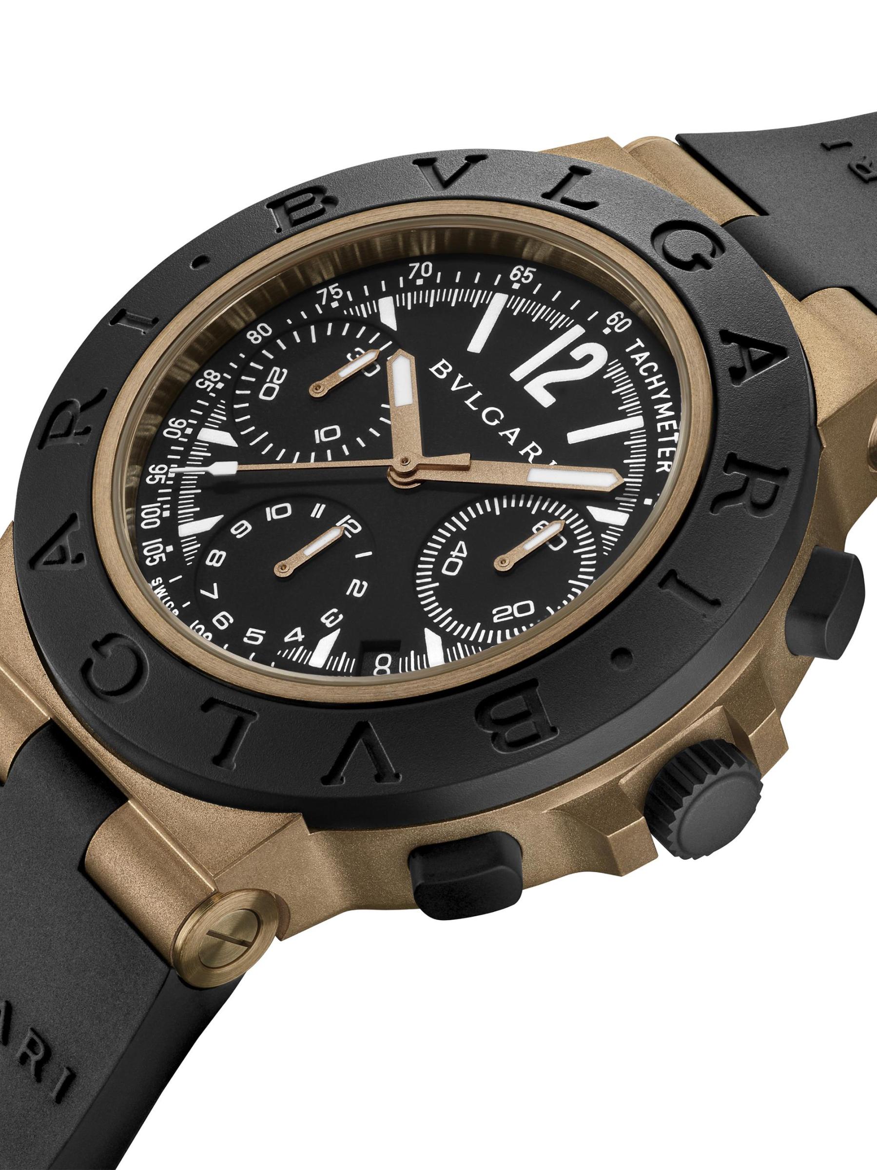 من مجموعة بولغري بولغري. تتميّز هذه الساعة ذات الإصدار المحدود من بولغري، المزوّدة بحزام مطاطي، بإطار دائري من التيتانيوم والألومنيوم، وإطار محفور عليه شعار، ومينا كرونوغراف أسود بثلاثة أقراص فرعية.