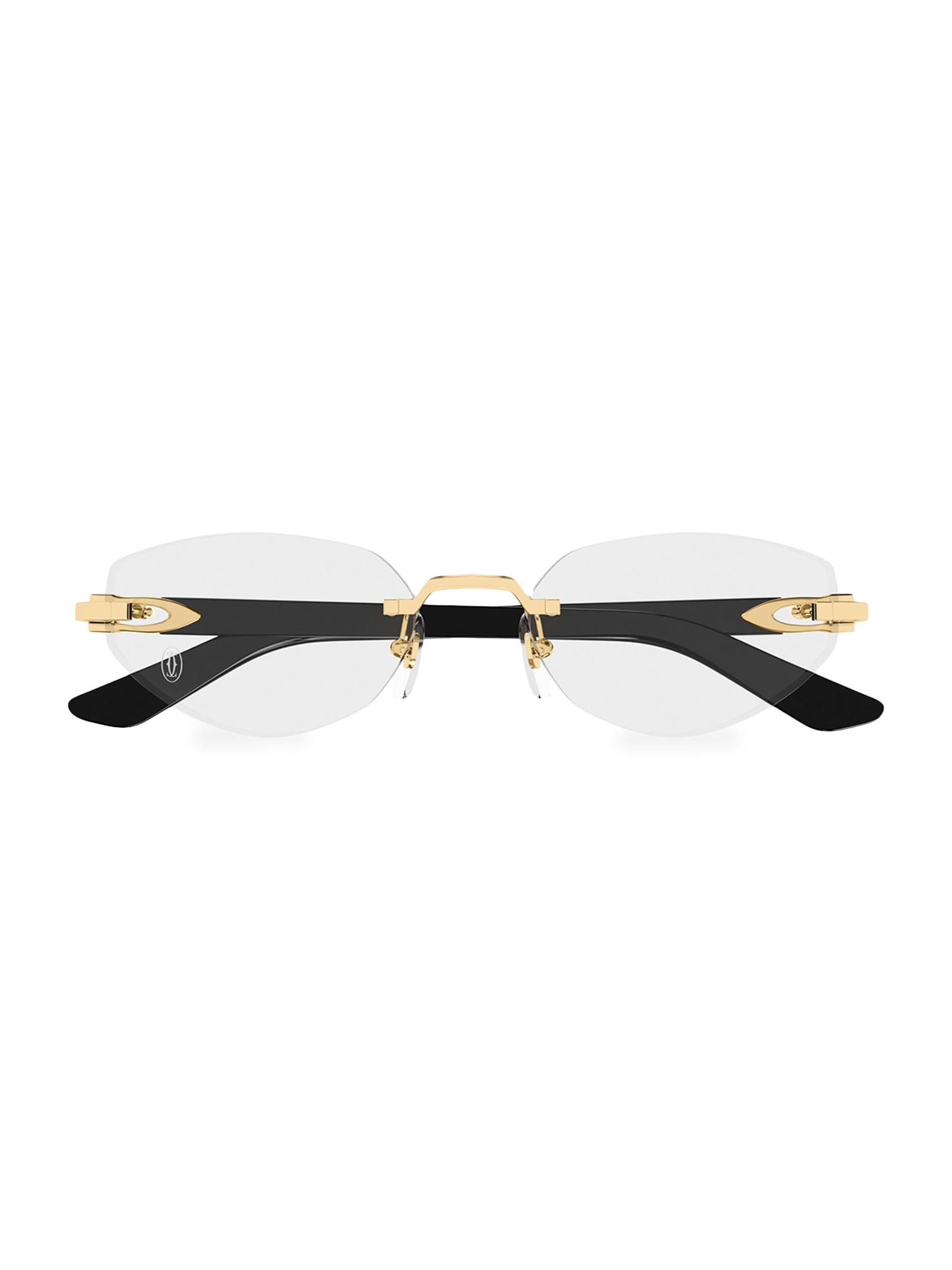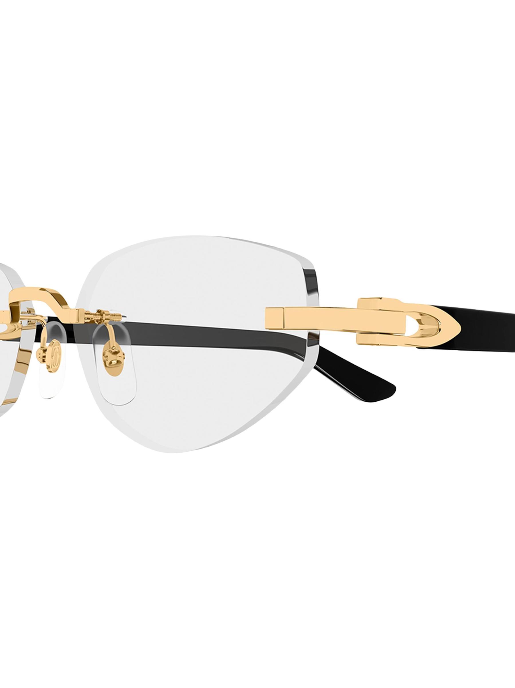 من مجموعة C Décor. تتميّز النظارات البصرية Décor C من كارتييه، التي لا تحتوي على إطار، بطلاء فاخر باللون الذهبي عيار 24 قيراطًا وتفاصيل مميزة في كل مفصل، وذلك بفضل تصميمها على شكل عين القطة.