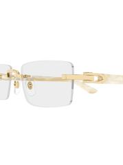 من مجموعة سي ديكور. تتميّز هذه النظارات البصرية من كارتييه، المصنوعة من المعدن المطلي بالذهب عيار 24 قيراطًا، بوسادات أنف قابلة للتعديل وتفاصيل الشعار على الذراعين.