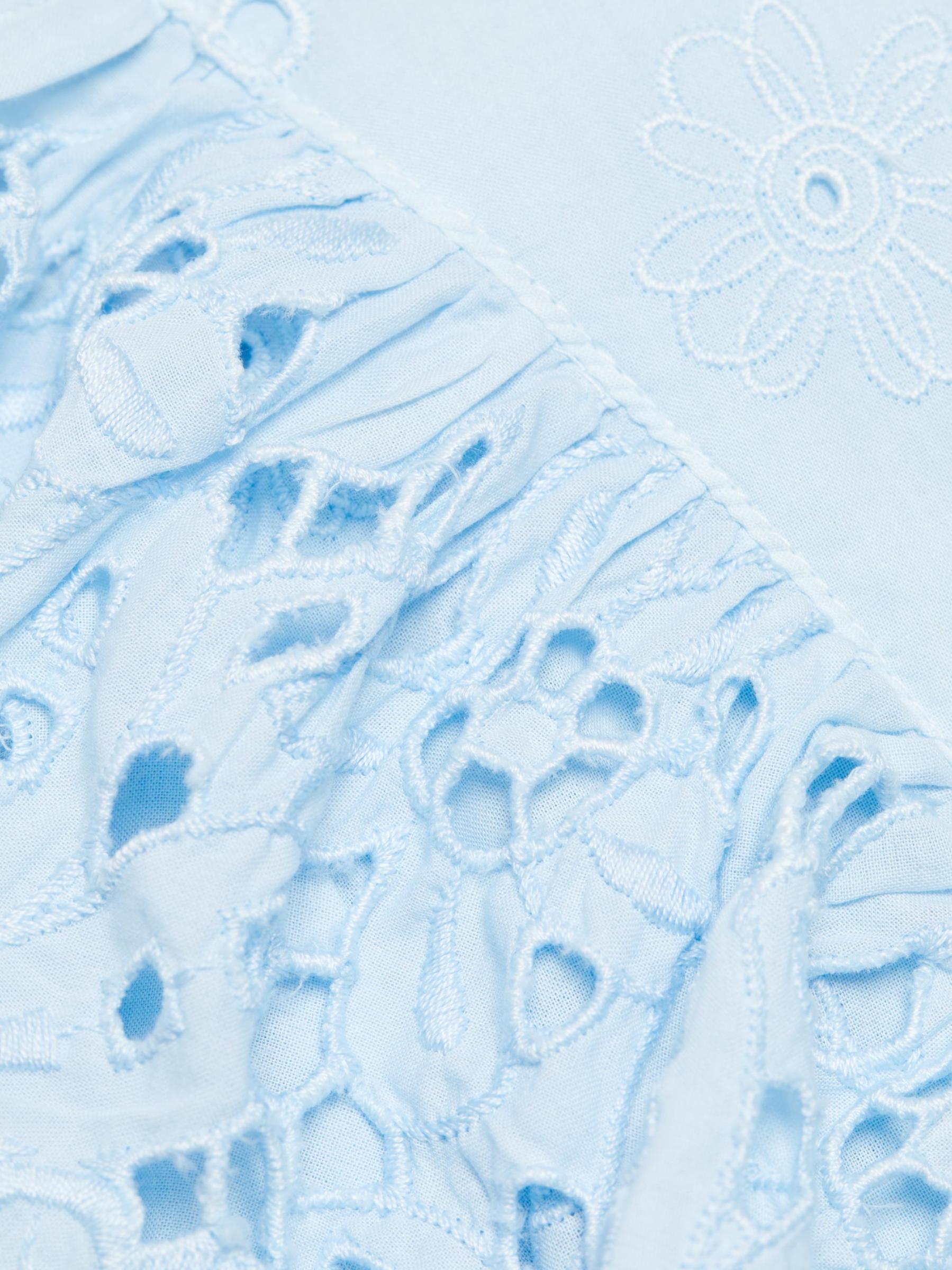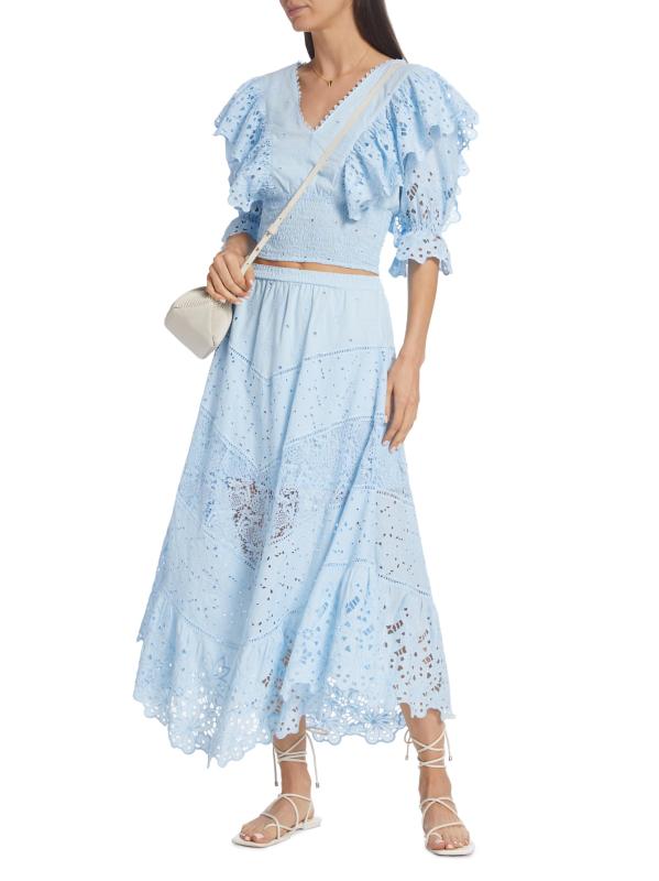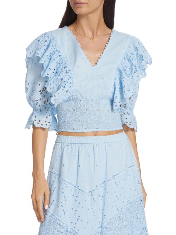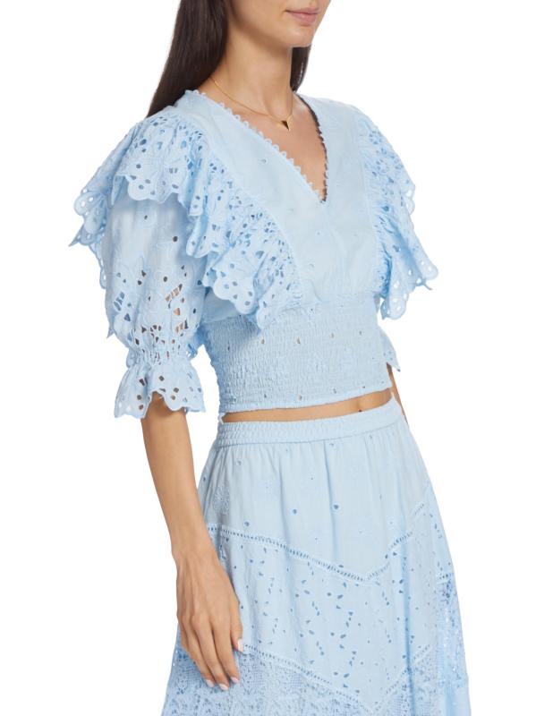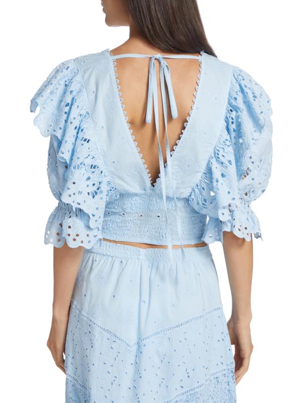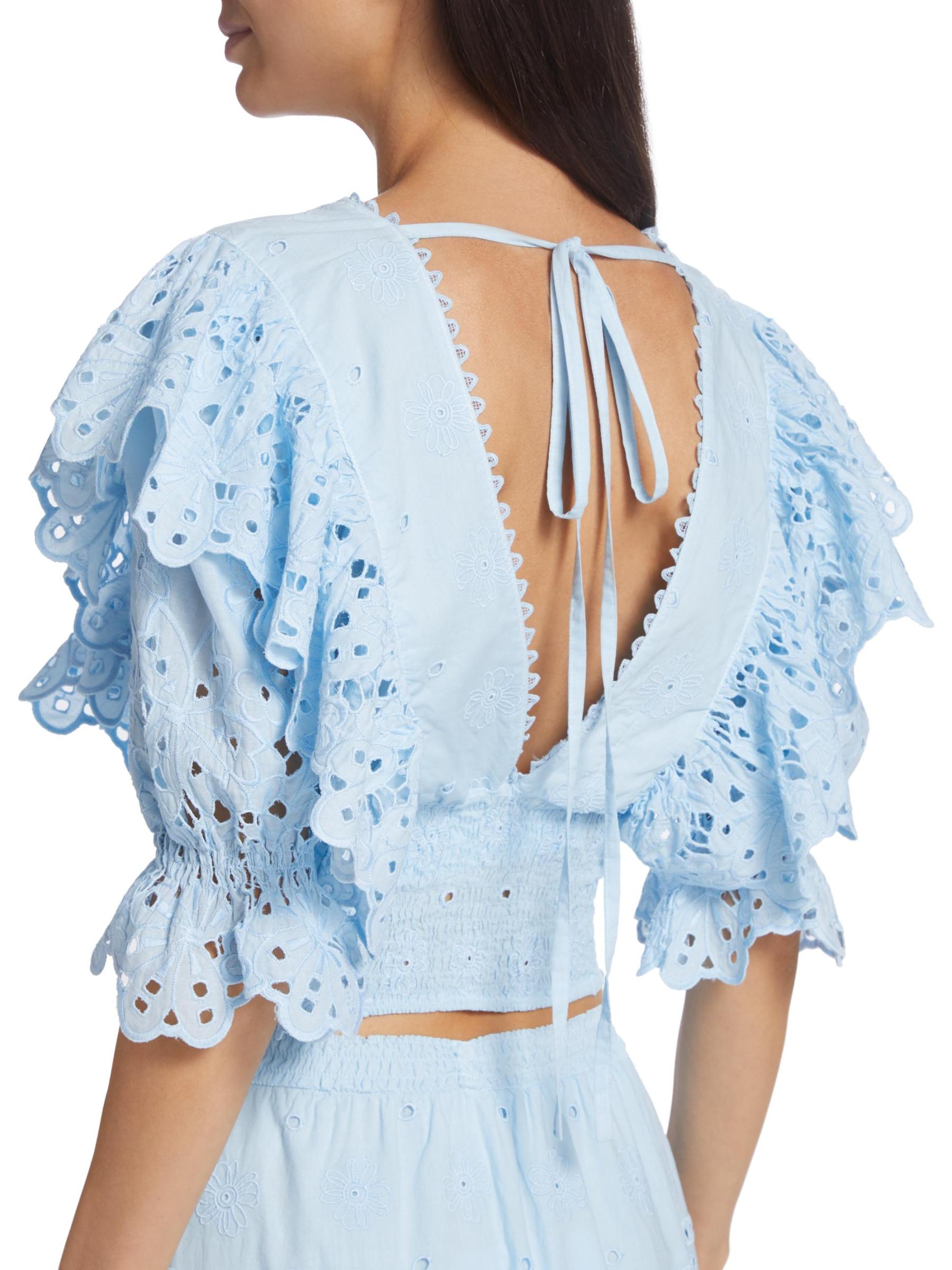 تتميّز بلوزة كالا من كوين مودا بألواح من الدانتيل المكشكش وأكمام منفوخة بطول الكوع. مستوحى من ملابس المنتجع في ساحل أمالفي، تم تصميم هذا النمط القطني القصير بحزام خصر كبير وربطة ذاتية في الجزء الخلفي المفتوح.رقبة على شكل حرف V أكمام قصيرة منفوخة دانتيل العيينة خصر مطرز قطن بنسبة 100% غسيل يدوي صُنع في إيطاليا