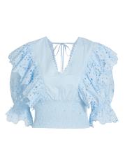 تتميّز بلوزة كالا من كوين مودا بألواح من الدانتيل المكشكش وأكمام منفوخة بطول الكوع. مستوحى من ملابس المنتجع في ساحل أمالفي، تم تصميم هذا النمط القطني القصير بحزام خصر كبير وربطة ذاتية في الجزء الخلفي المفتوح.