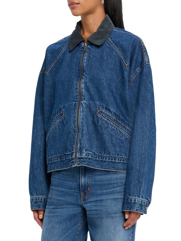جاكيت Camden Garage من SLVRLAKE مصنوع من الدنيم المغسول ومزين بياقة سروال قصير بلون مغاير.طوق سبريد أكتاف منسدلة أساور بأزرار بأكمام طويلة جيبان جانبيان إغلاق بسحّاب أمامي قطن بنسبة 100% يُغسل في الغسالة صُنع في الولايات المتحدة الأمريكية