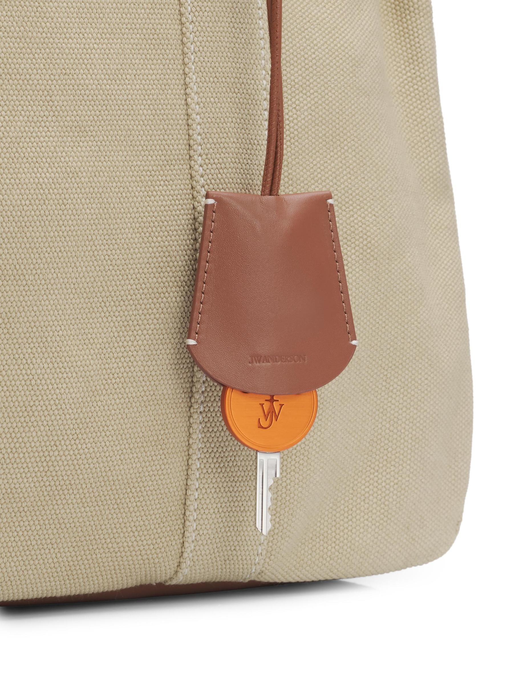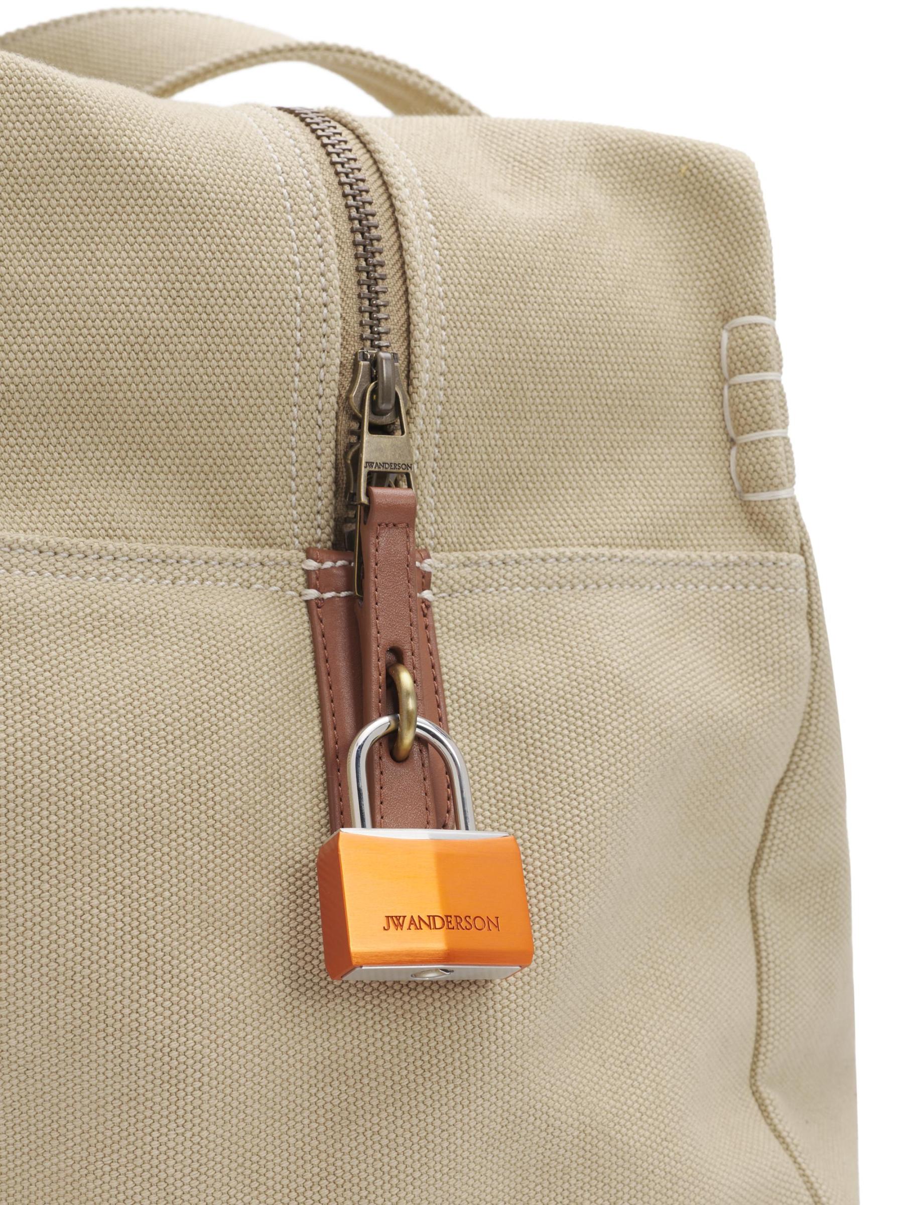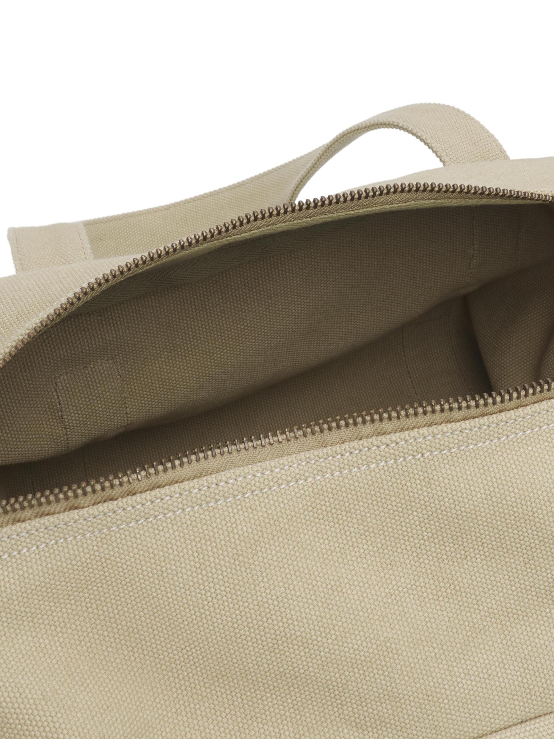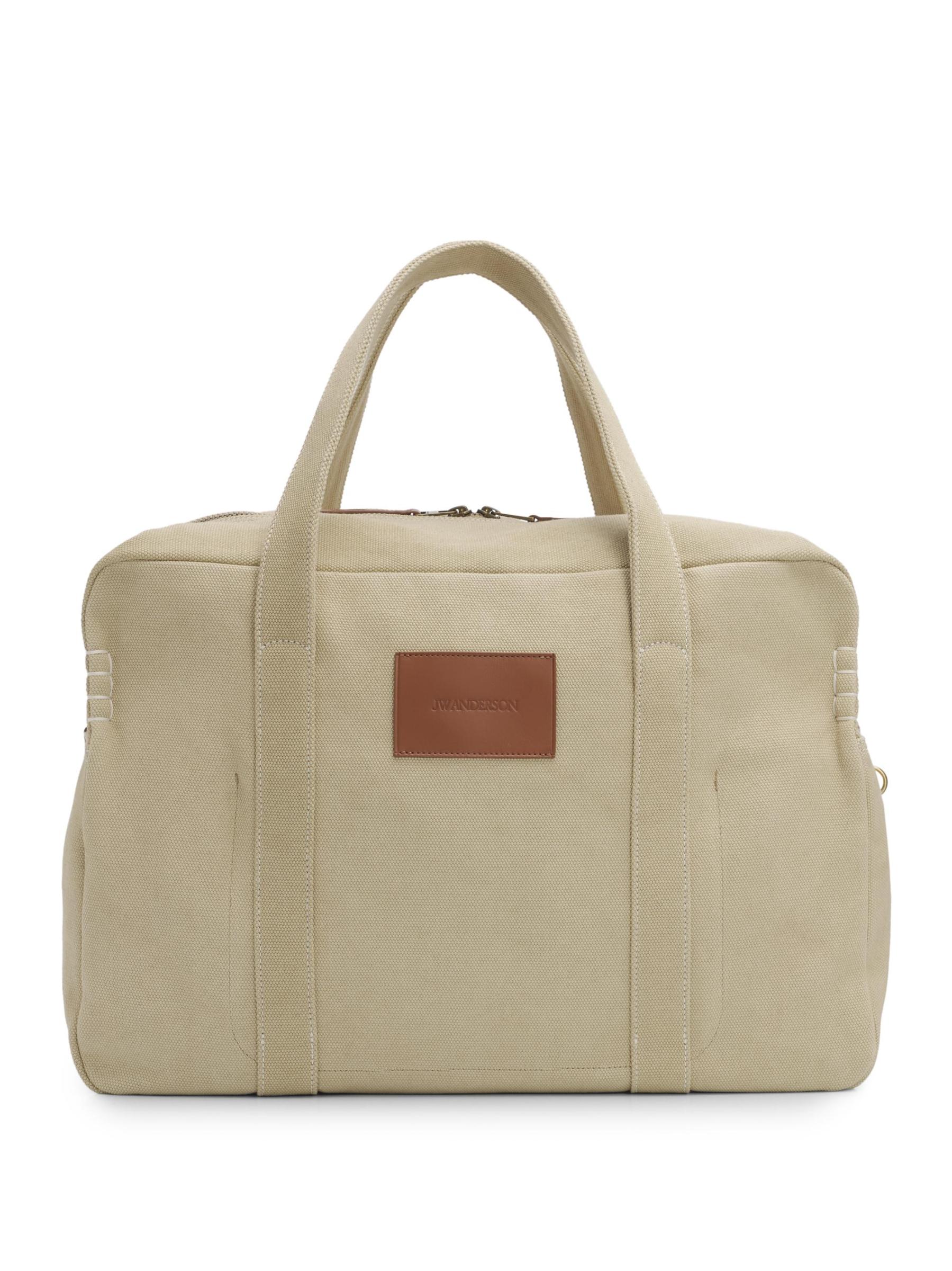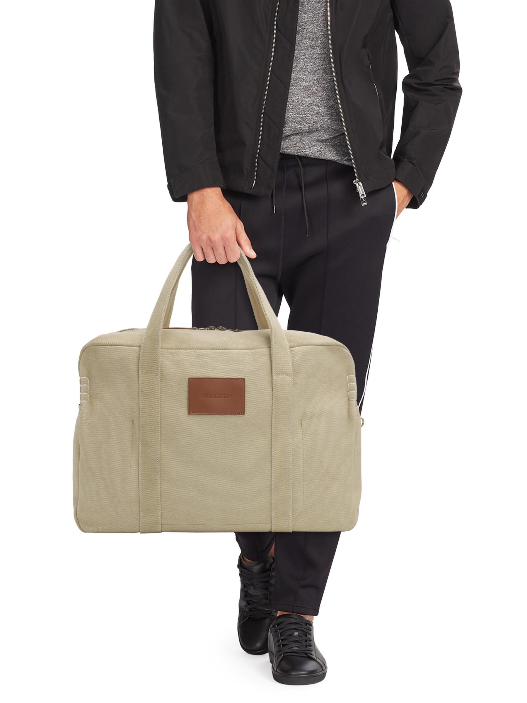 تتميز حقيبة Weekender المصنوعة من القماش القطني من JW Anderson بجيب خارجي ورقعة جلدية محفورة بشعار وقاعدة مسطحة لصورة ظلية منظمة.