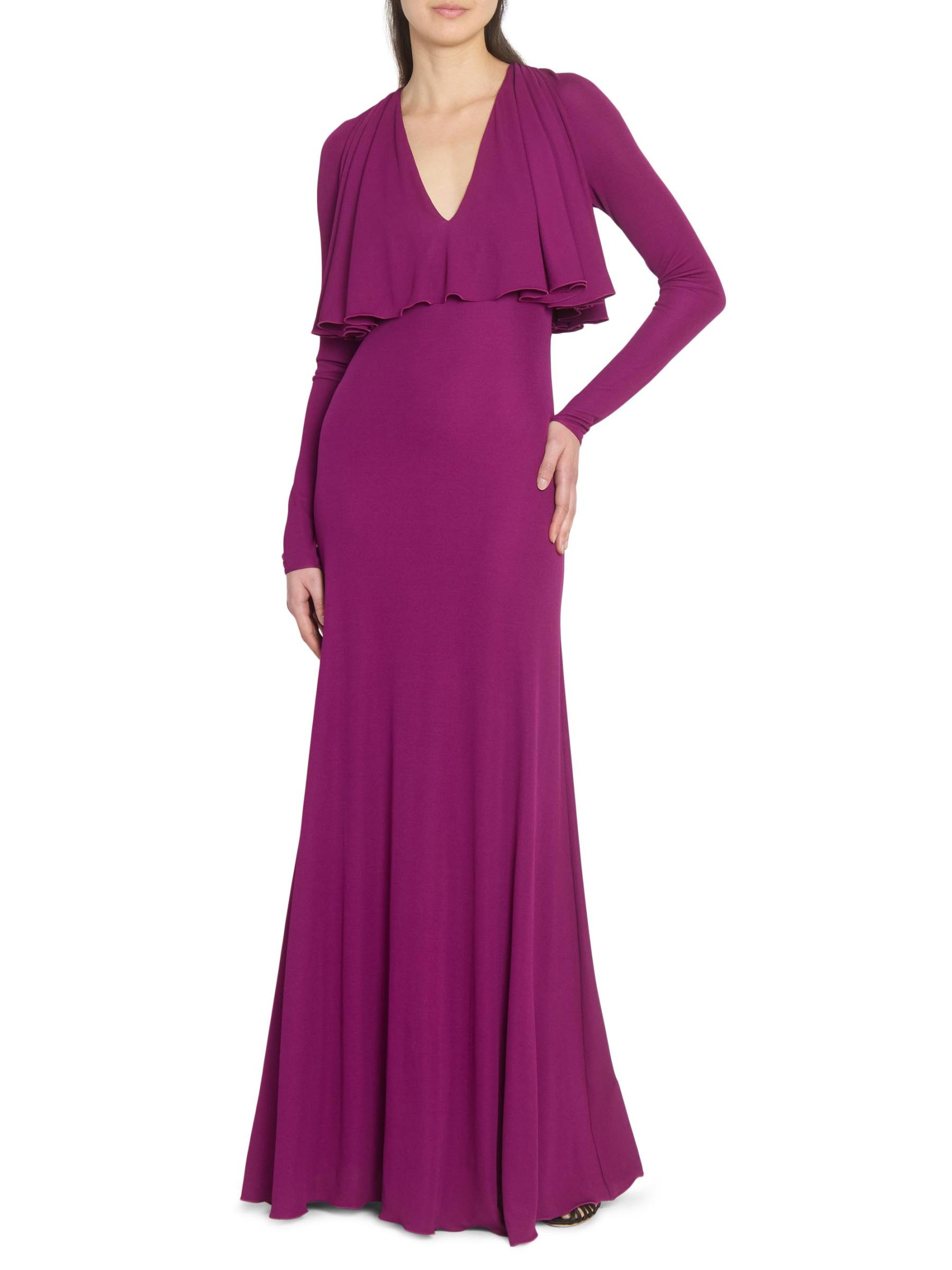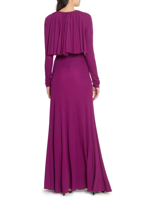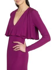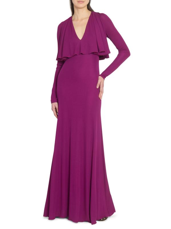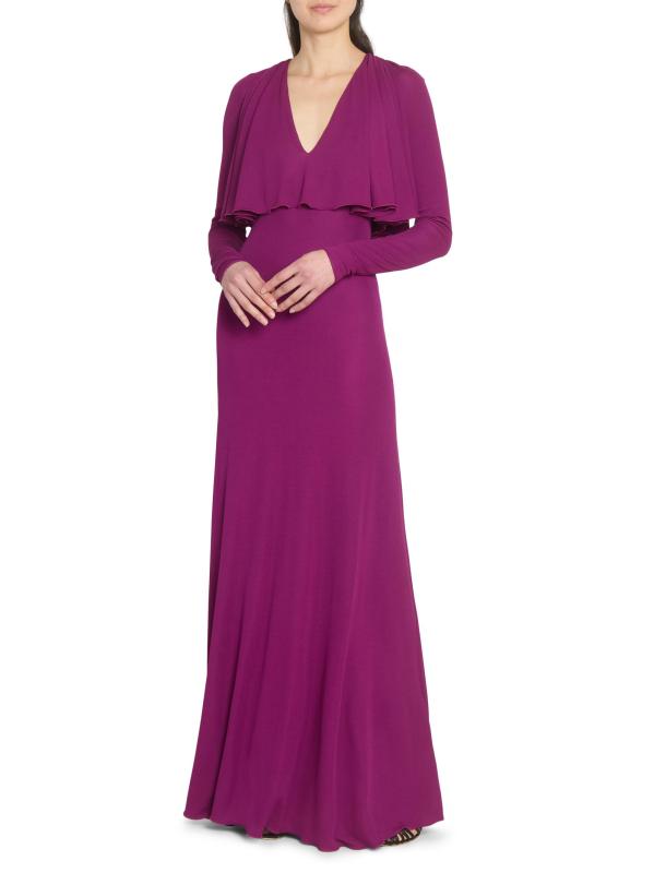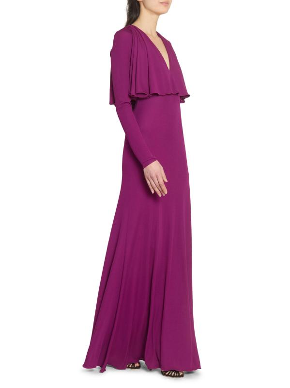 يتميّز هذا الفستان الطويل الأكمام من جيامباتيستا فالي، والمصنوع من الجيرسيه المرن، برقبة واسعة على شكل حرف V، وغطاء كاب على الصدّار، وتصميم على شكل حرف A.