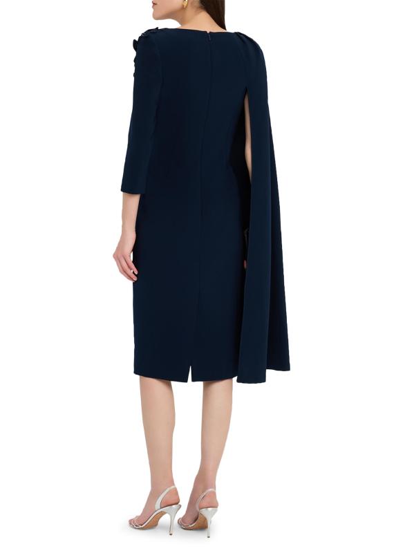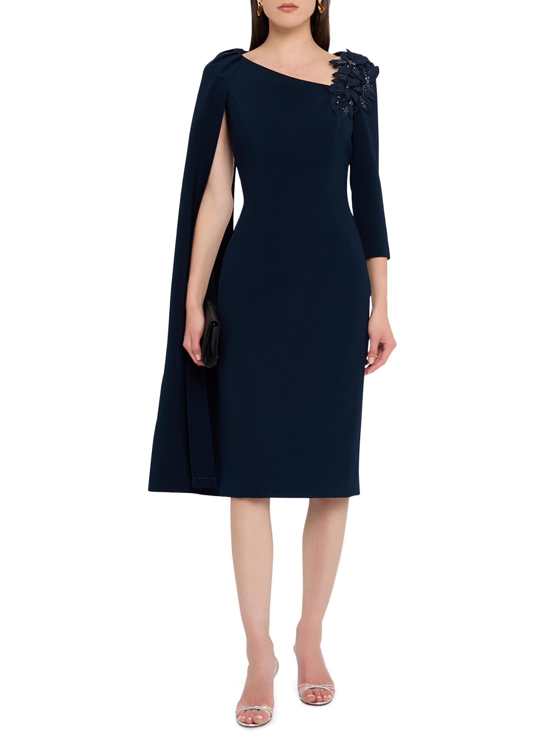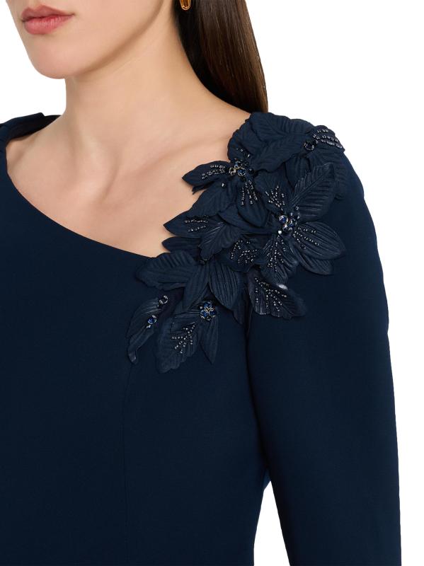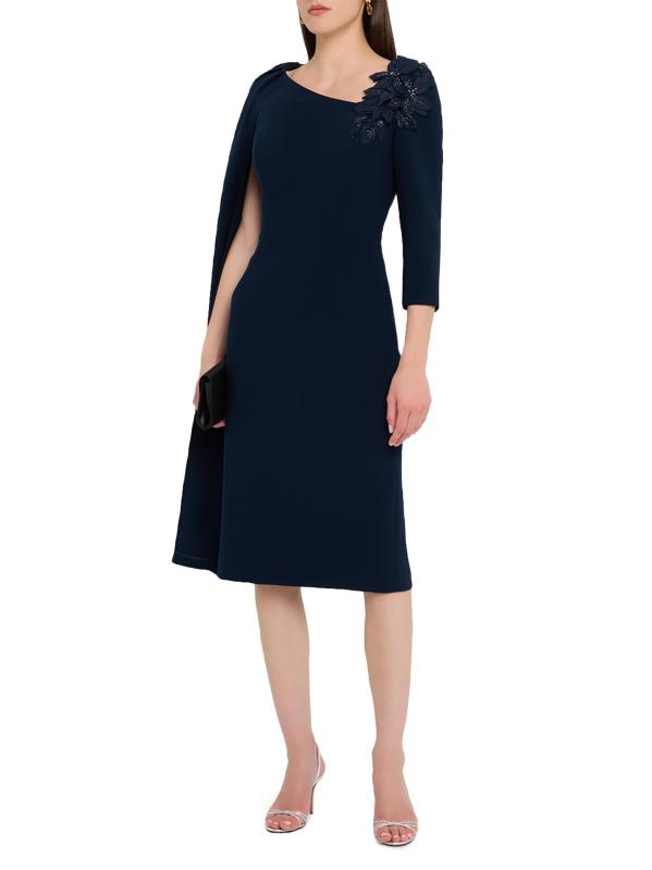 يتميز فستان Teri Jon من Rickie Freeman بطول الركبة والمصنوع من الكريب بتقويرة وأكمام غير متماثلة. يتميّز هذا الطراز بتطريزات زهرية مزيّنة بالكريستال والخرز على الكتف الأيسر.