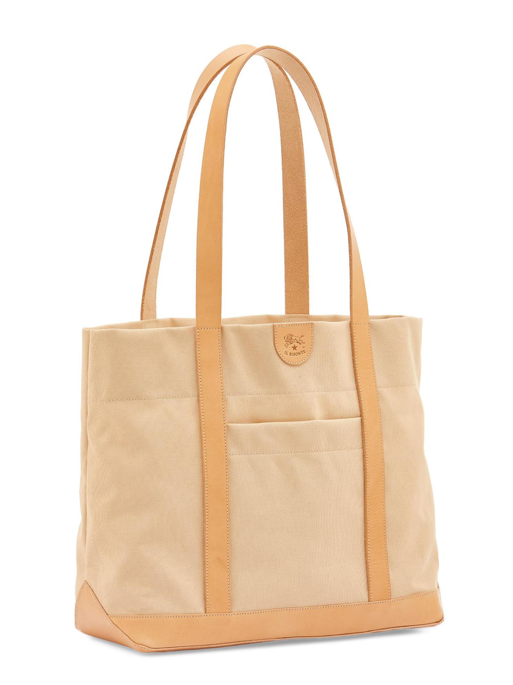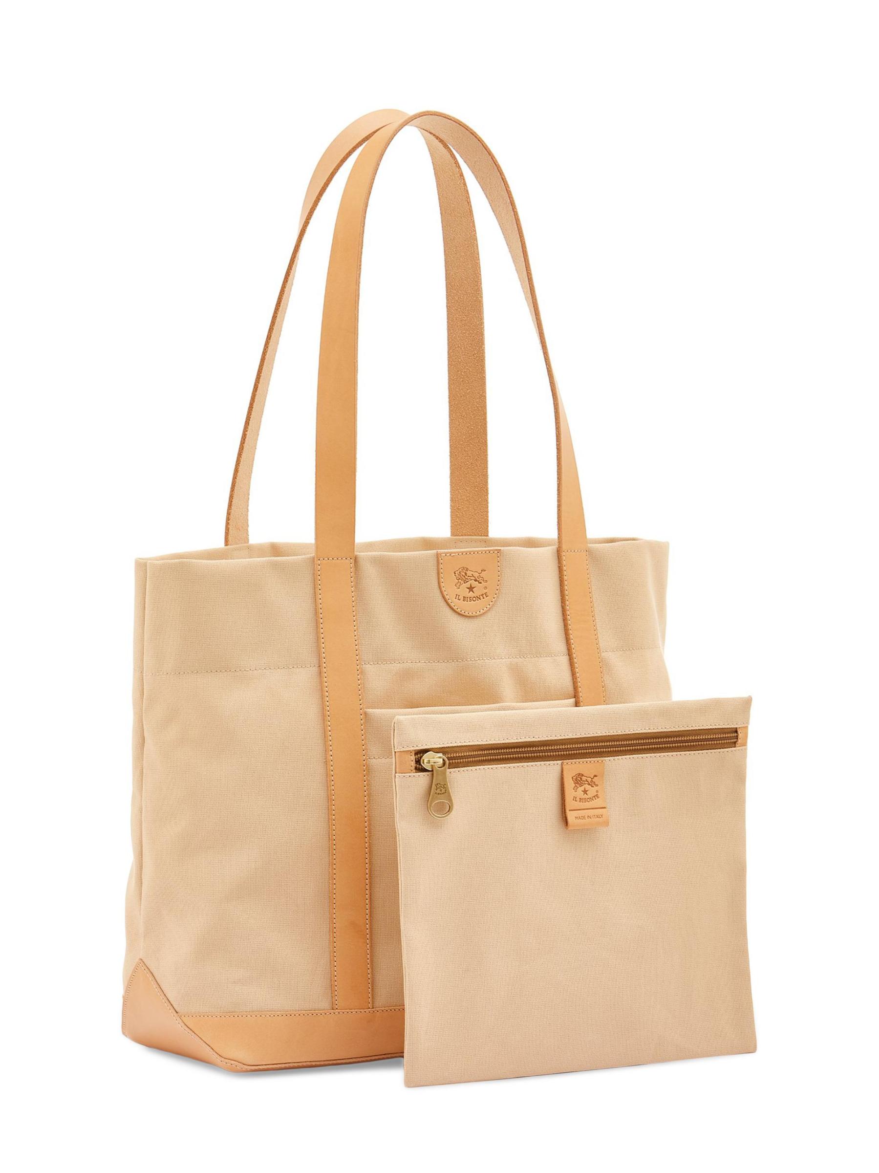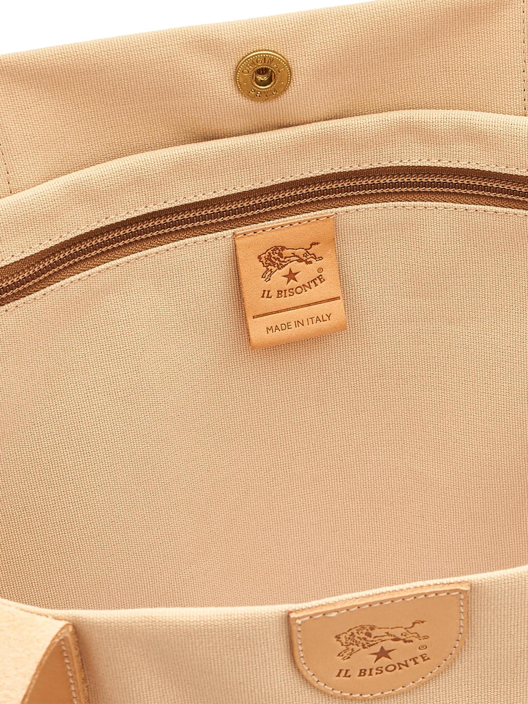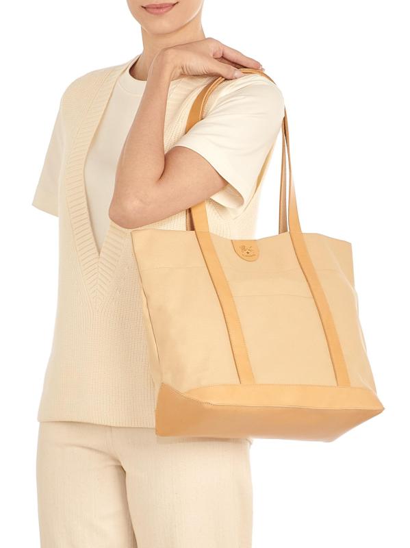 من مجموعة كاراميلا. تتميز حقيبة II Bisonte الكلاسيكية المصنوعة من القماش المتوسط بزخرفة ومقابض من الجلد المدبوغ بالخضروات وجيب خارجي مفتوح وجيب بسحّاب يمكن استخدامه كحقيبة.