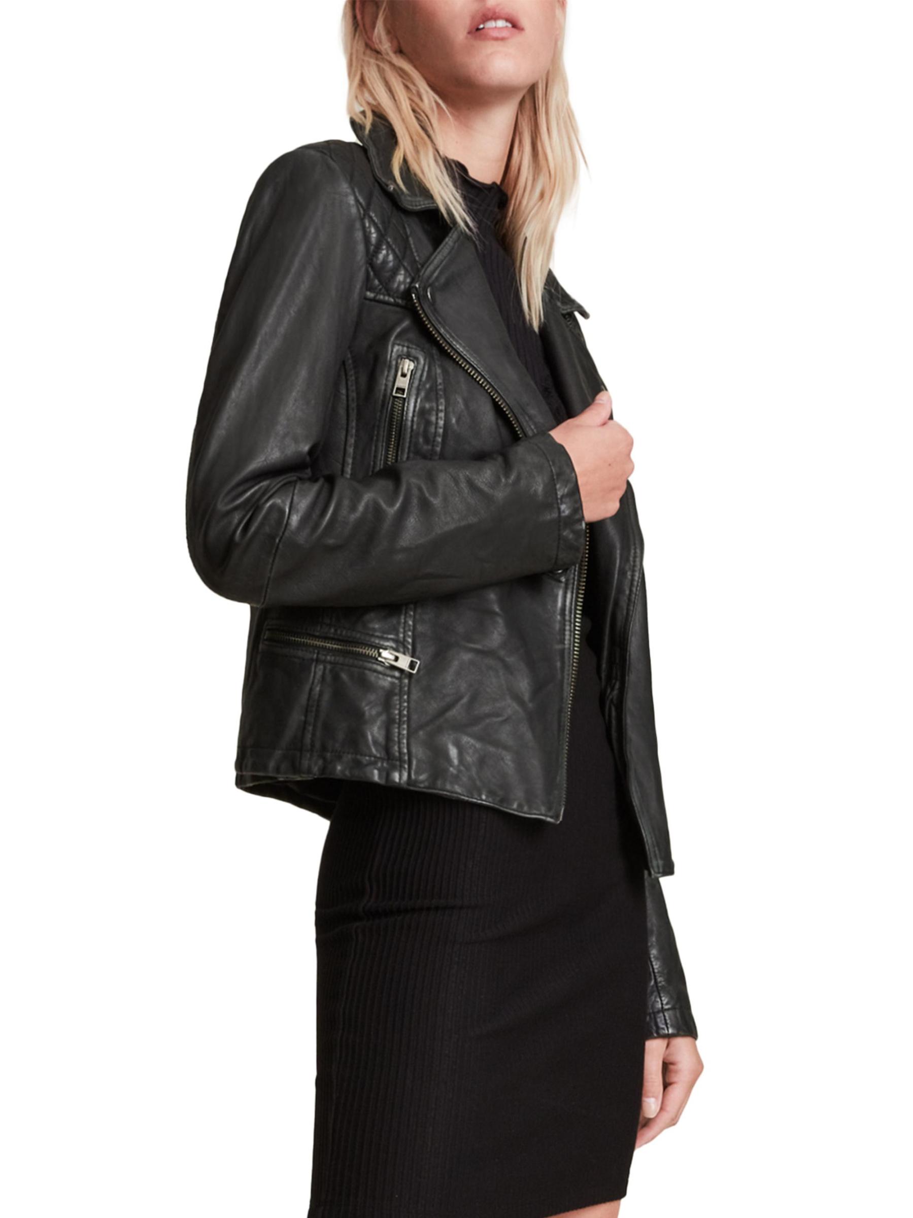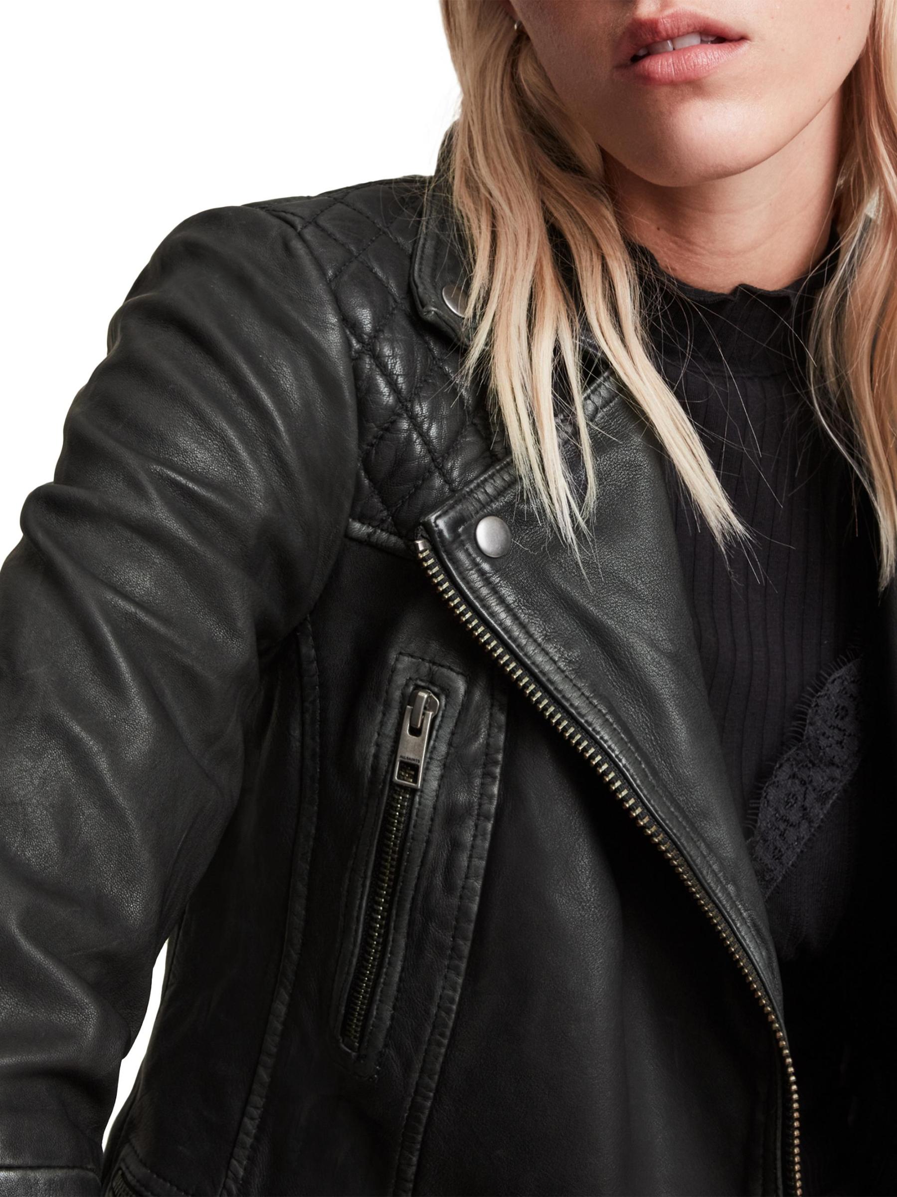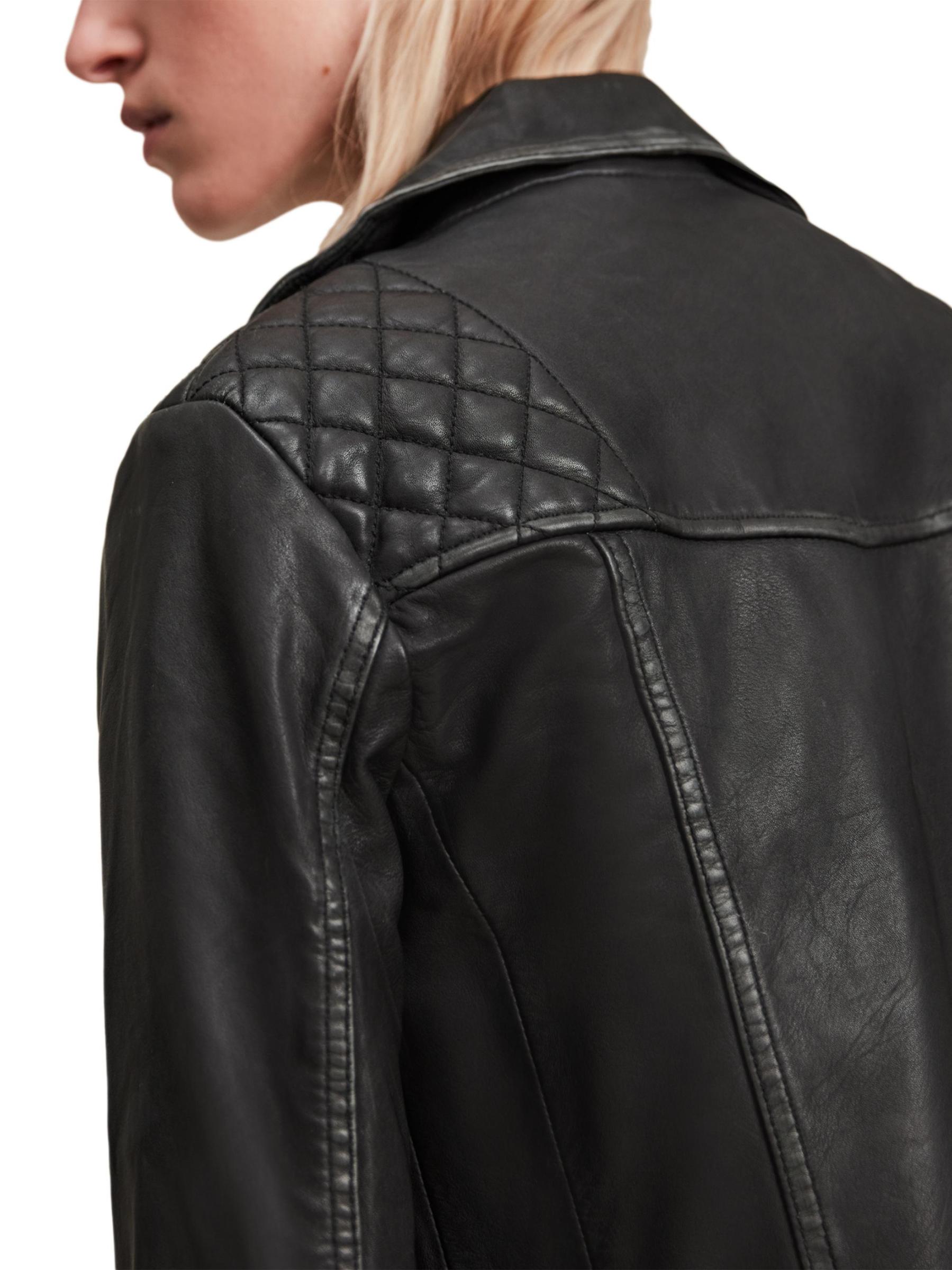 جاكيت كارغو لراكبي الدراجات النارية من AllSaints مصنوع من الجلد، ويتميز بثنيات مدببة وتفاصيل مبطنة على الكتف وجيوب جانبية. تم الانتهاء من هذه القطعة بسحّاب أمامي.