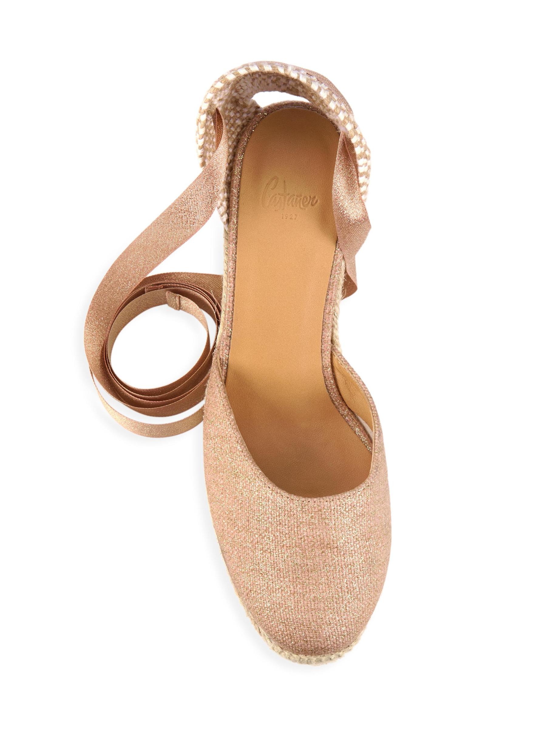 صندل Carina من Castañer مصنوع من القماش المعدني مع كعب إسفين من الجوت.الجزء العلوي من الكتان إصبع مستدير إغلاق برباط الكاحل البطانة: جلد نعل مطاطي صُنع في إسبانيا