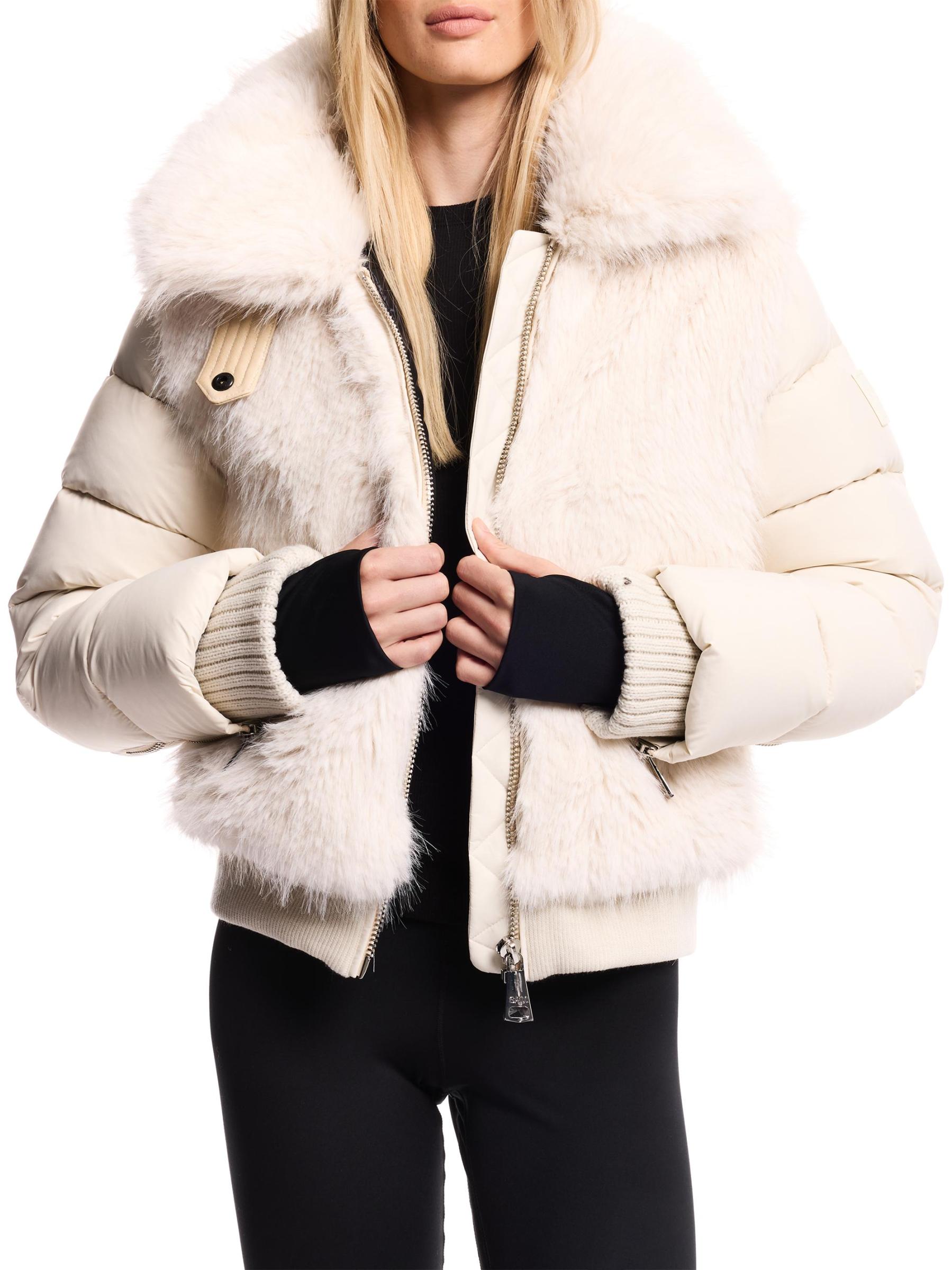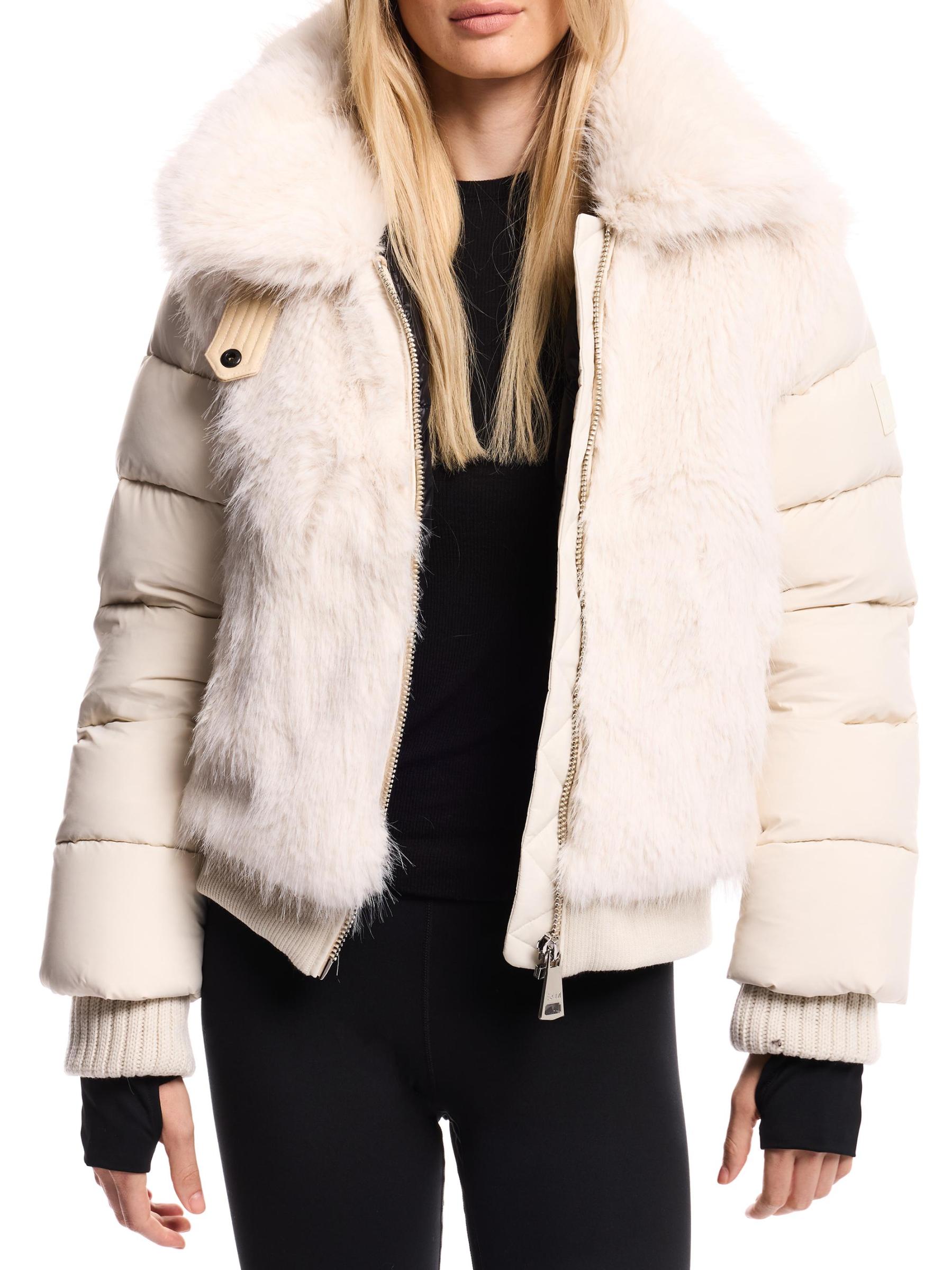 صُمّم جاكيت كارلي داون بومبر من سام مزيّن بفرو صناعي عند الصدّار، مع صورة ظلية مبطّنة وياقة عريضة وحزام خصر محبوك.