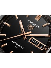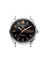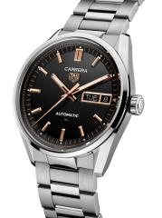 من مجموعة كاريرا. تتميز هذه الساعة من TAG Heuer المصنوعة من الفولاذ المقاوم للصدأ بمينا أسود وتفاصيل باللون الذهبي الوردي وشاشة عرض اليوم والتاريخ عند الساعة الثالثة.