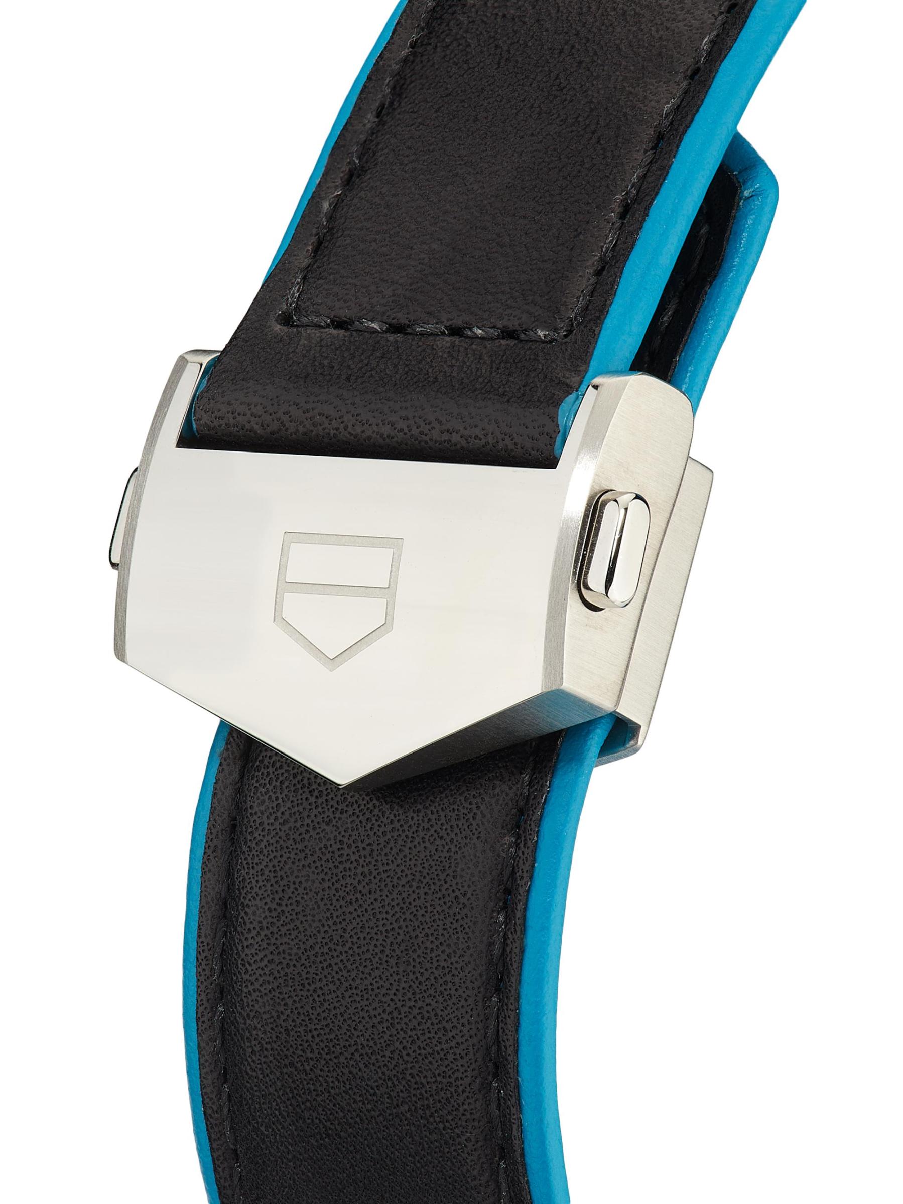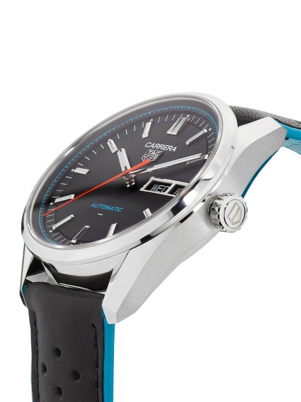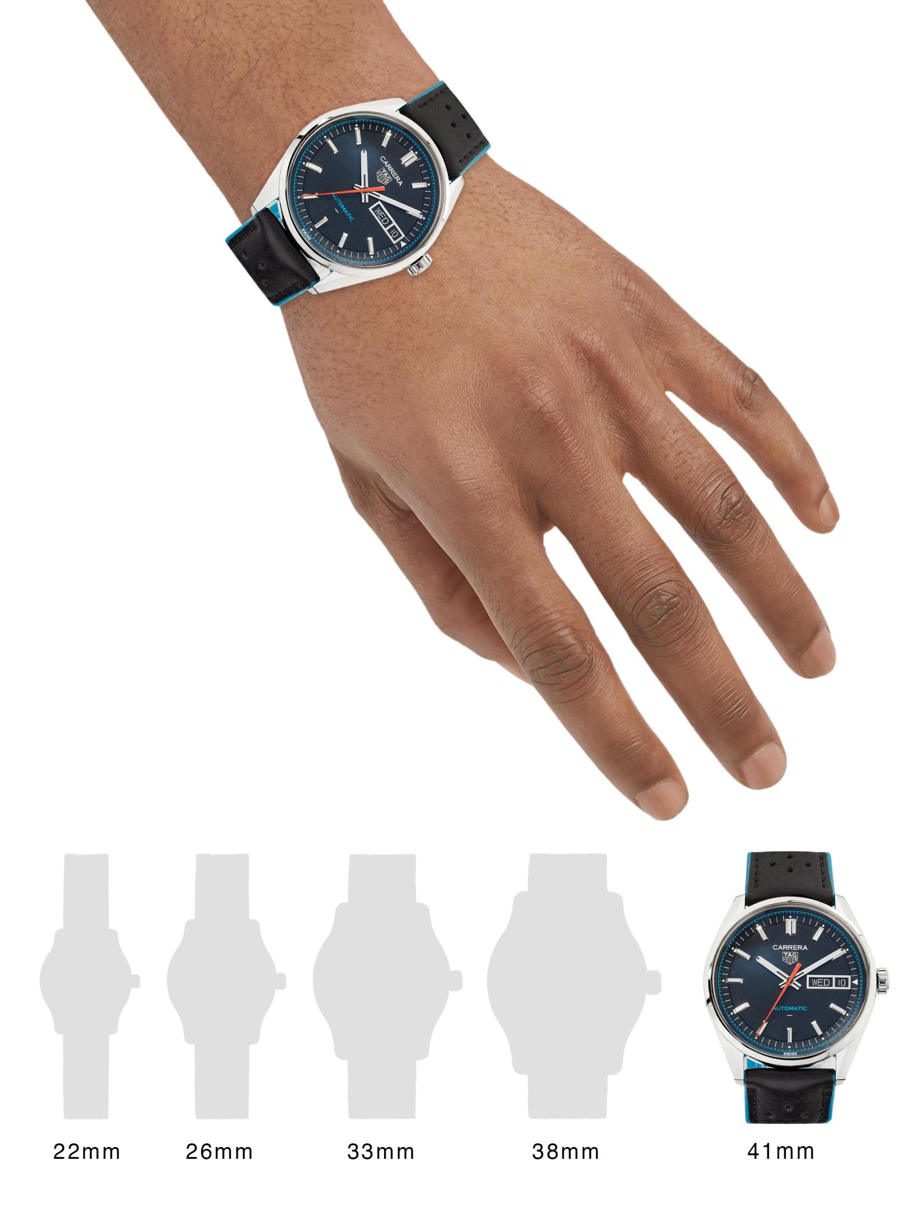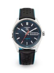 من مجموعة كاريرا. تتميز هذه الساعة من TAG Heuer، المزودة بحزام جلدي أسود، بهيكل دائري من الفولاذ المقاوم للصدأ، ومينا باللون الأزرق الداكن، وشاشة عرض اليوم والتاريخ عند الساعة الثالثة.