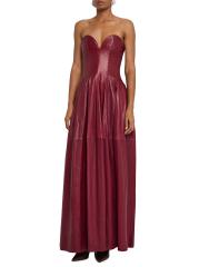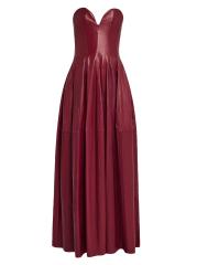 تم تصميم فستان كارينغتون المصنوع من الجلد بدون حمالات من SIMKHAI مع بلوزة على شكل قلب وصدّار تمثال نصفي منحوت وتنورة سلسة ذات ثنيات على شكل حرف A.