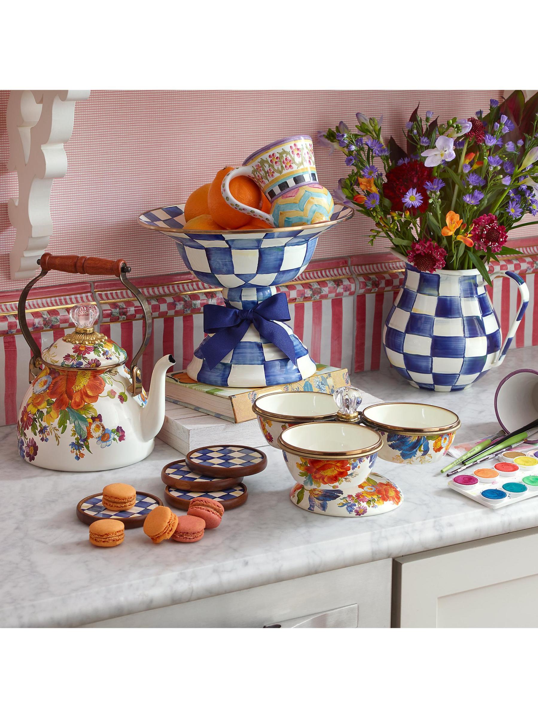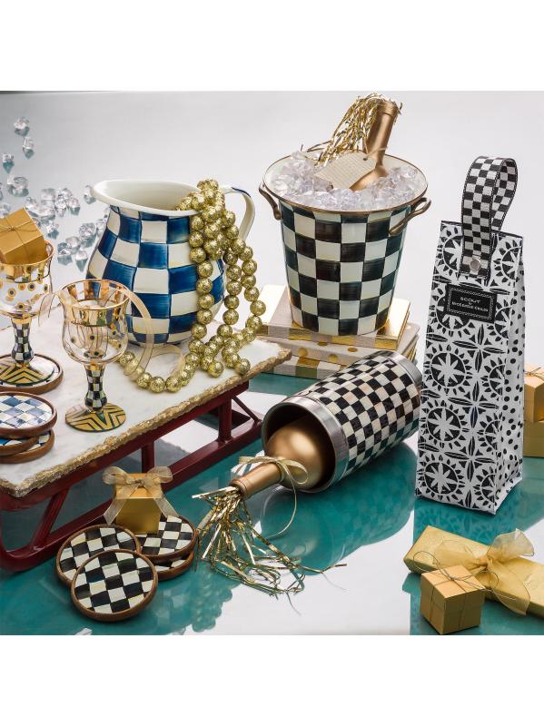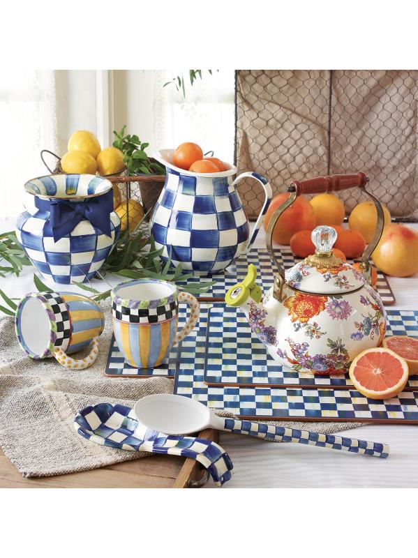 هذا الإبريق من Mackenzie-Childs يزين أي بار أو مائدة عشاء. تم تعزيز الهيكل السفلي المصنوع من الفولاذ الثقيل بإبرازات مرصعة بالجواهر، وهو مطلي بفحوصات مرسومة يدويًا.الفولاذ/المينا آمنة للاستخدام في غسالة الأطباق مستوردة