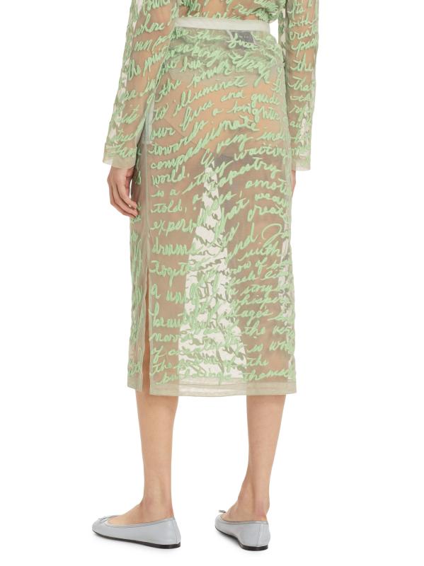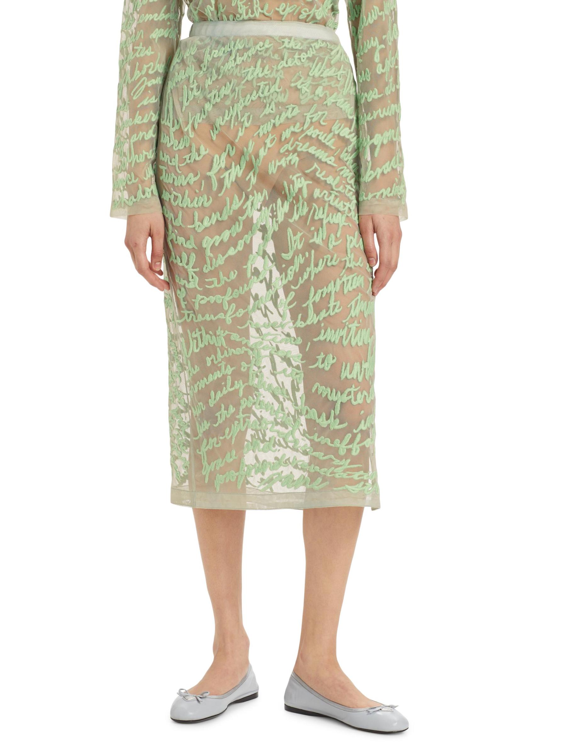 تتميز تنورة Cheever المتوسطة من Lingua Franca بتصميم شفاف مع خطوط مطرزة في جميع الأنحاء.خصر مطوق شق جانبي إغلاق بسحّاب جانبي مخفي 100% بوليستر يُغسل في الغسالة مستوردة