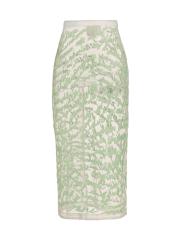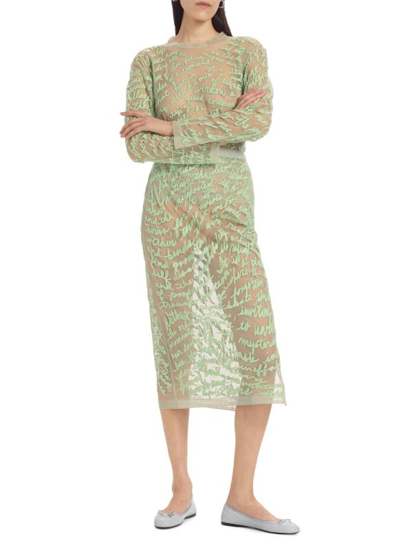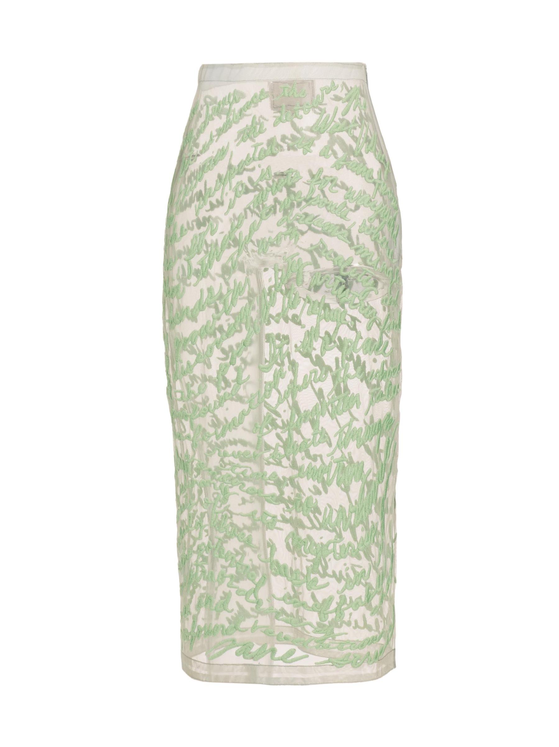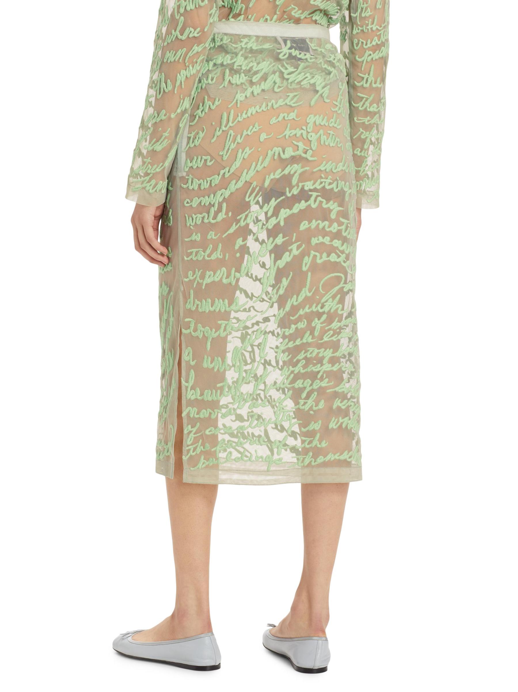 تتميز تنورة Cheever المتوسطة من Lingua Franca بتصميم شفاف مع خطوط مطرزة في جميع الأنحاء.