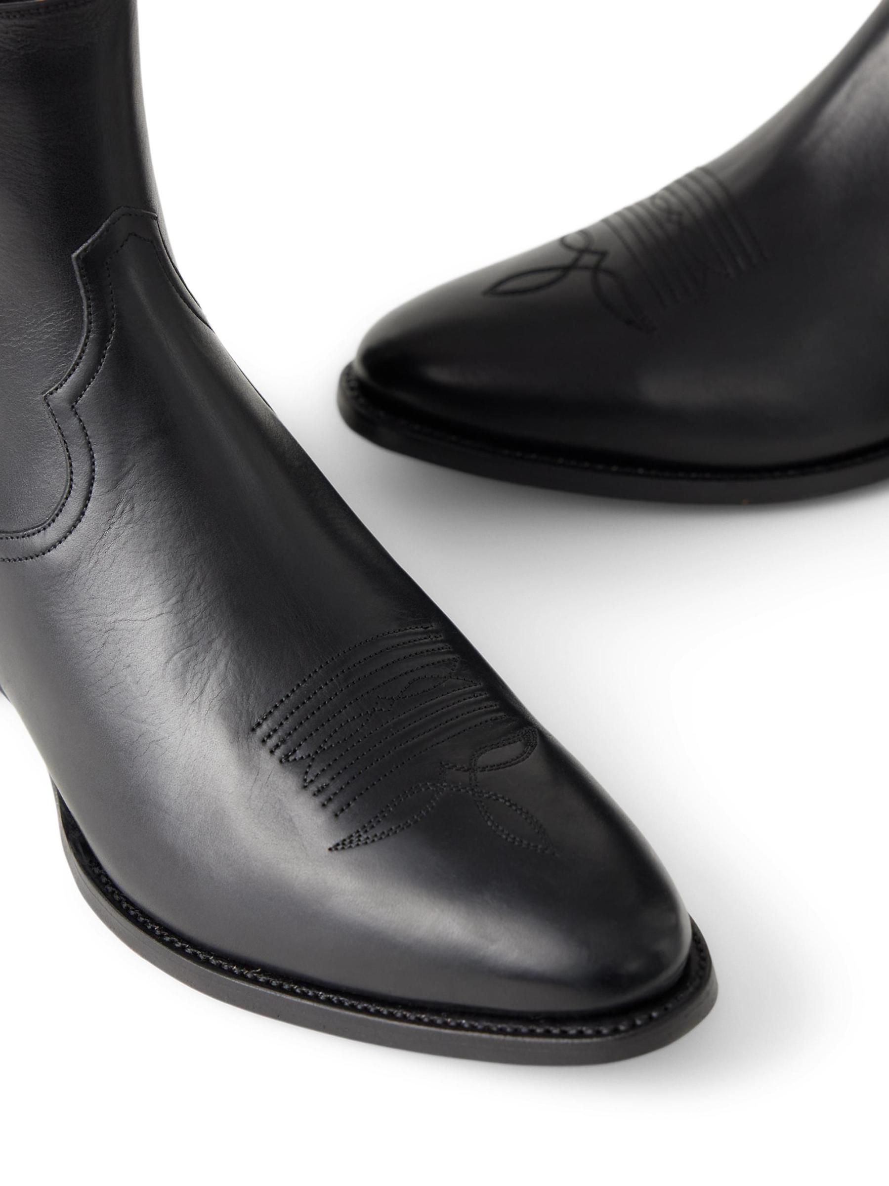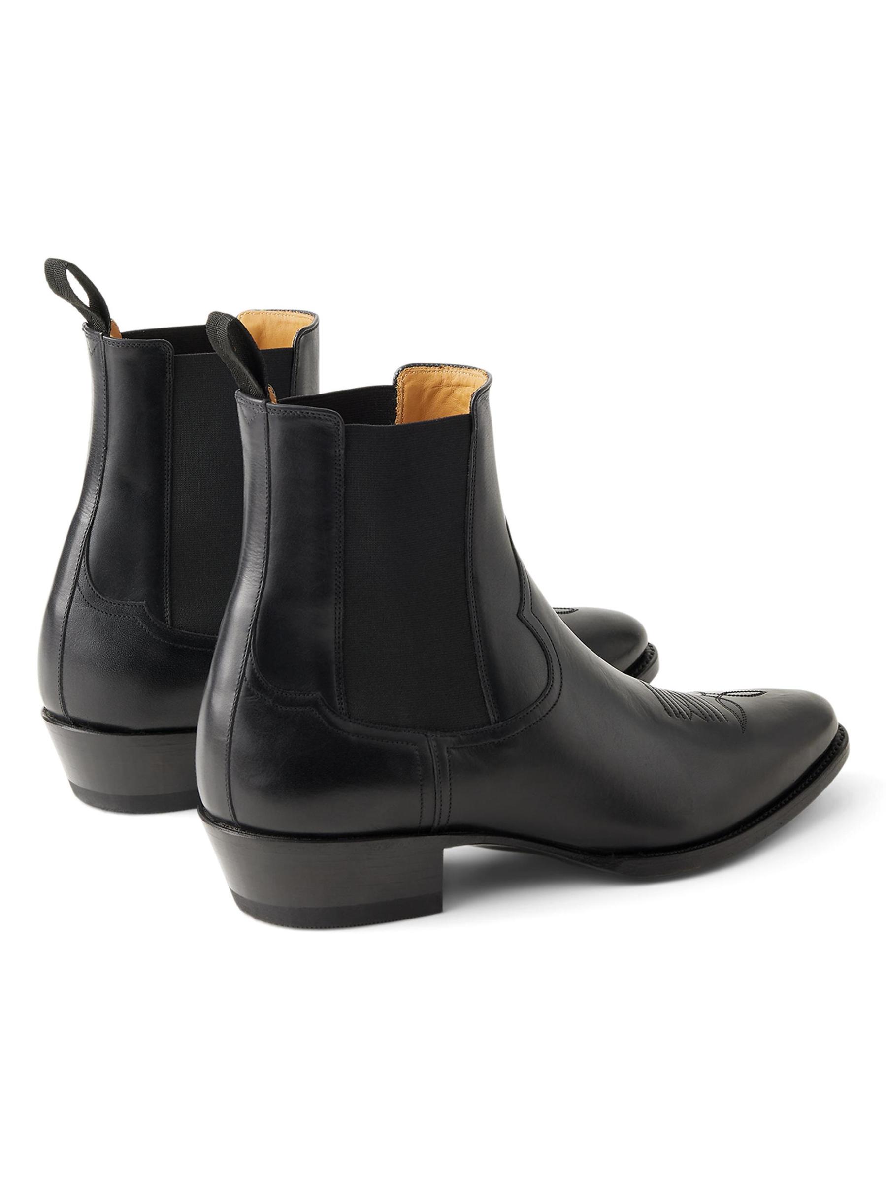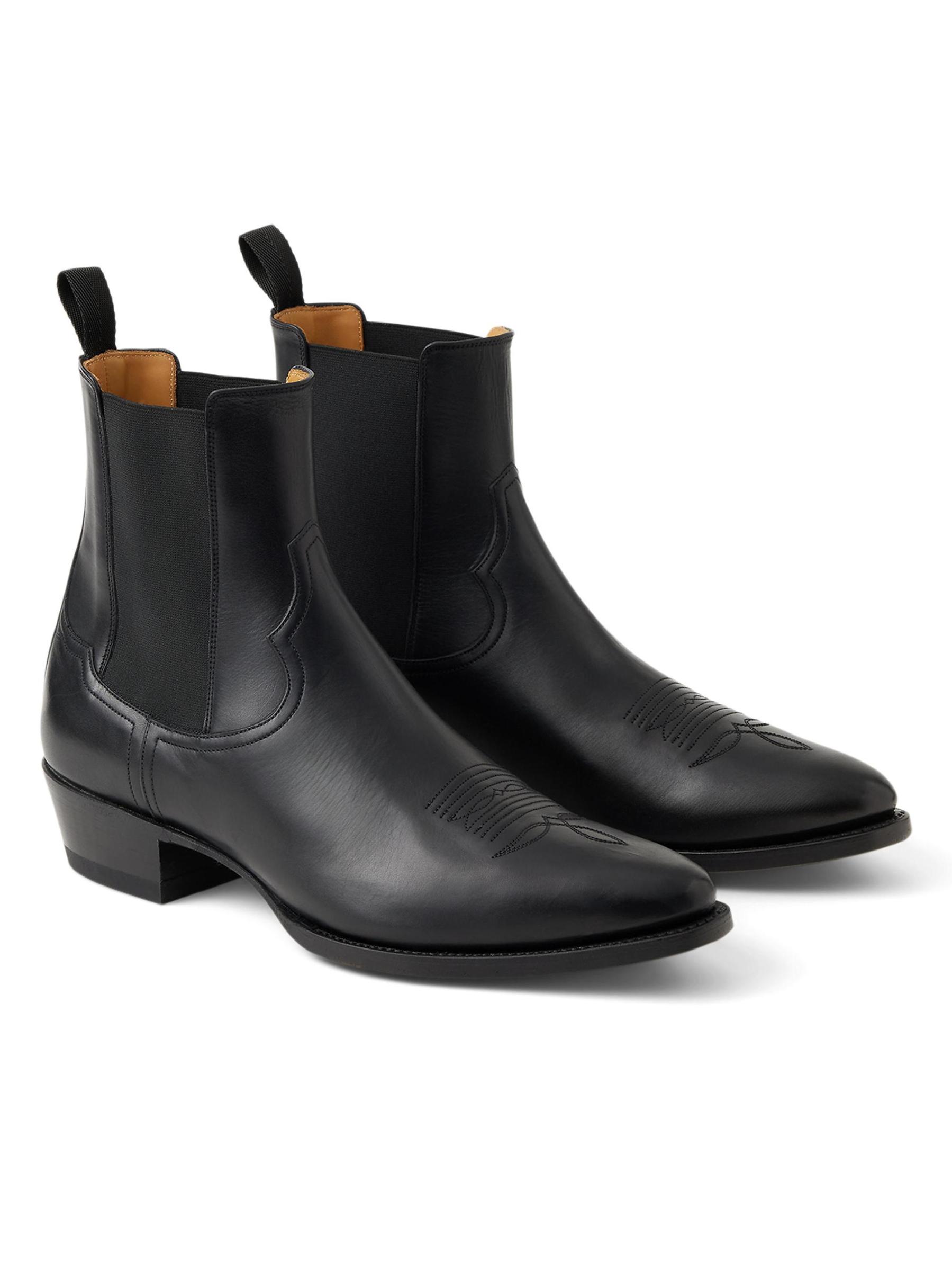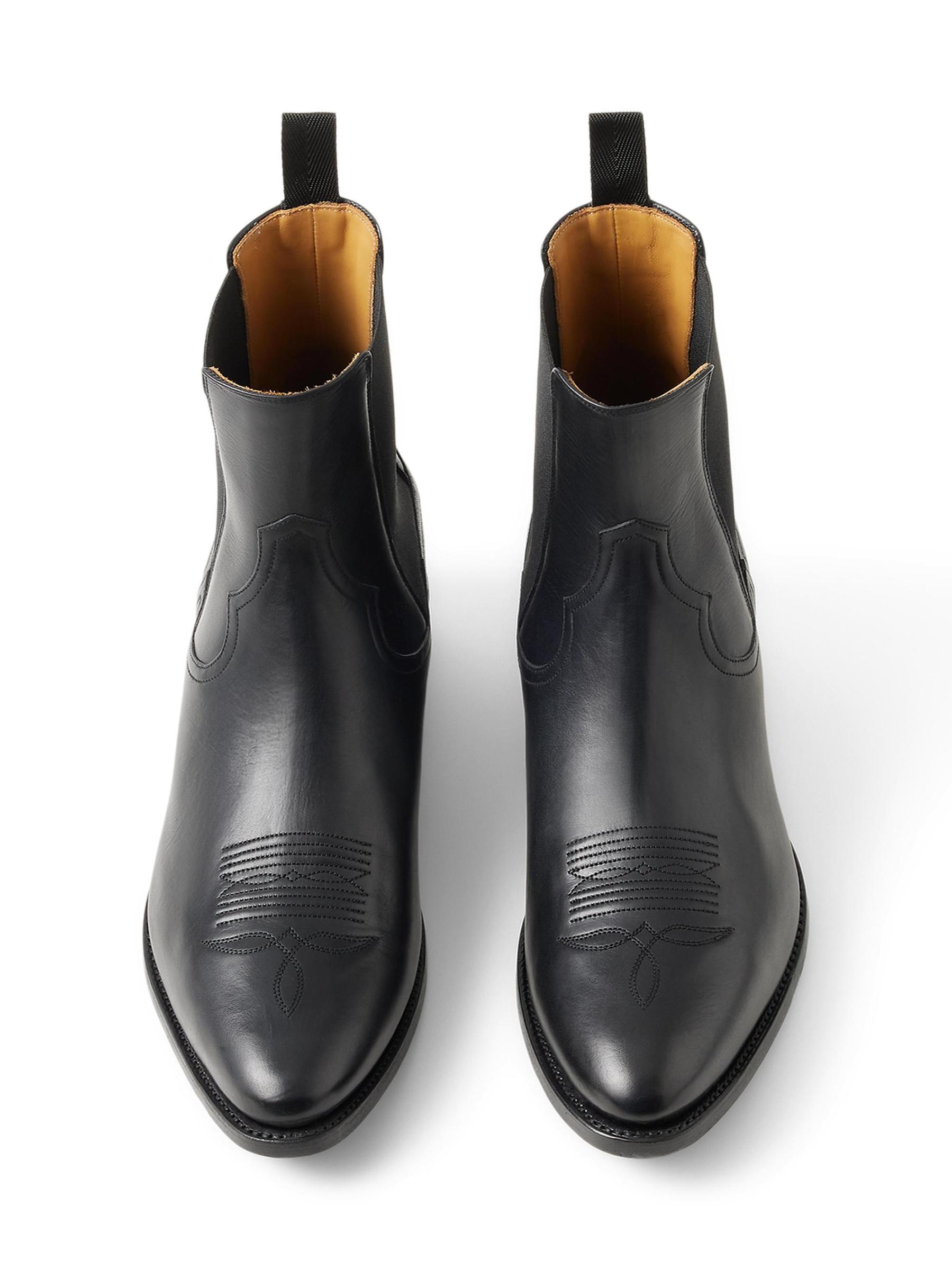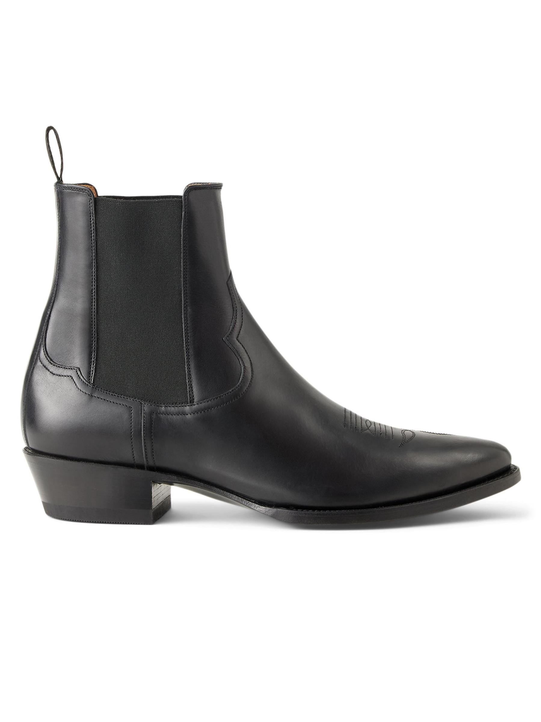 حذاء تشيلسي ويسترن من رالف لورين بيربل ليبل مصنوع من الجلد ومطرّز بخياطة زخرفية عند المصمّمة.نقطة إصبع القدم سهل الارتداء جلد نعل جلدي صُنع في إسبانيا