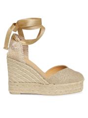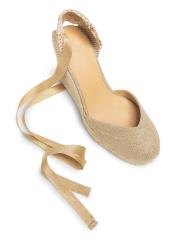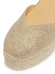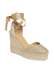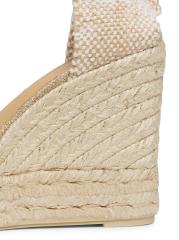 صُنعت أسافين كيارا إسبادريل من Castañer من الكتان وتتميز بإبزيم عند الكاحل. تم تصميم زوج Tise مع منصة ملفوفة بالجوت وكعب إسفين.