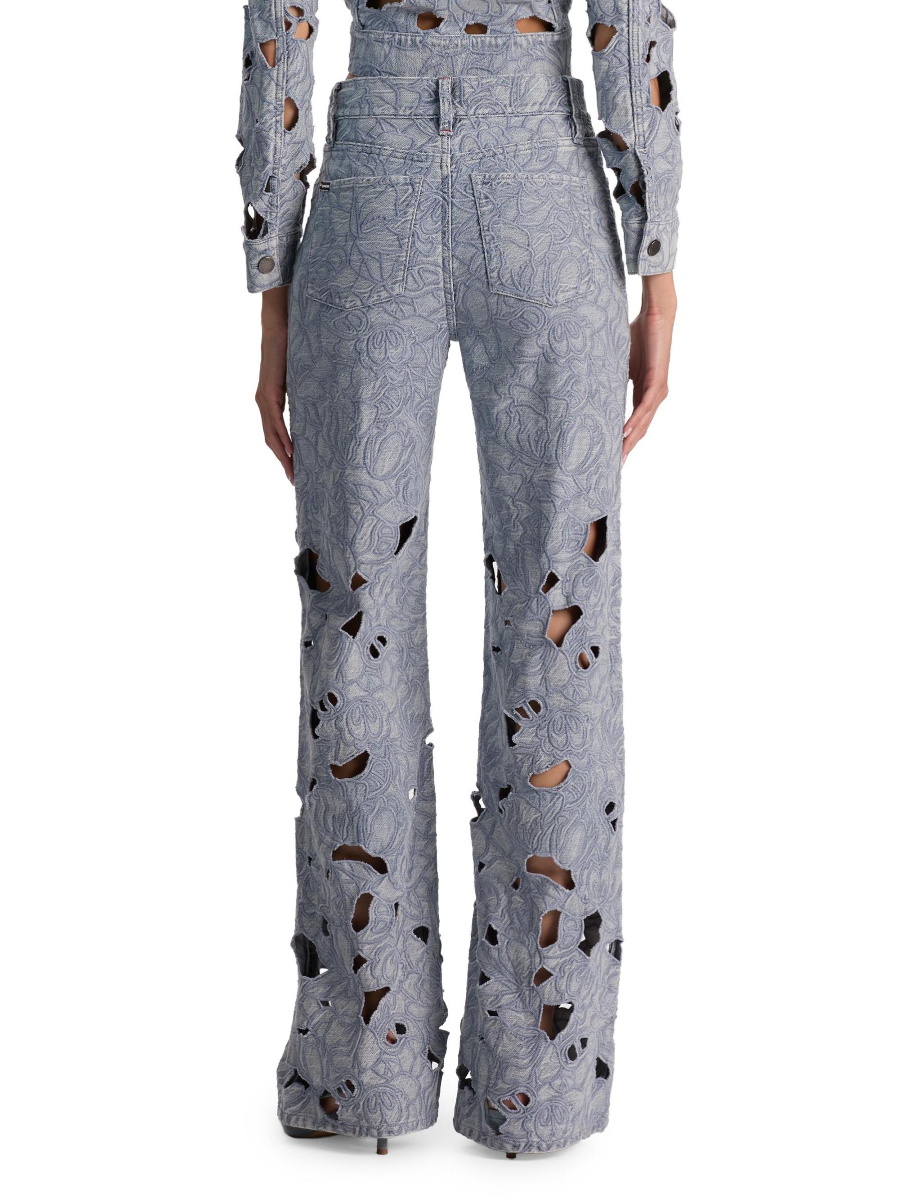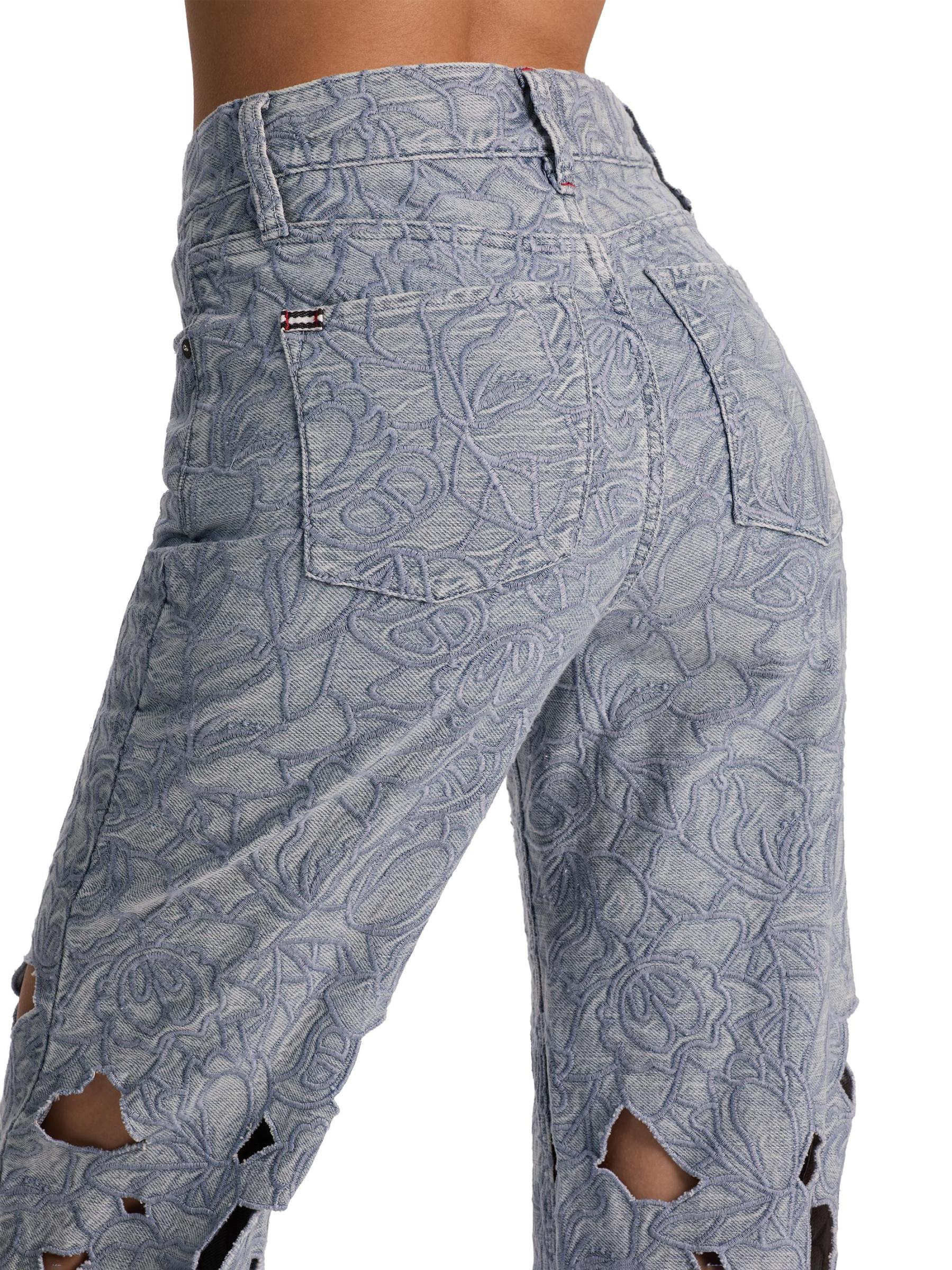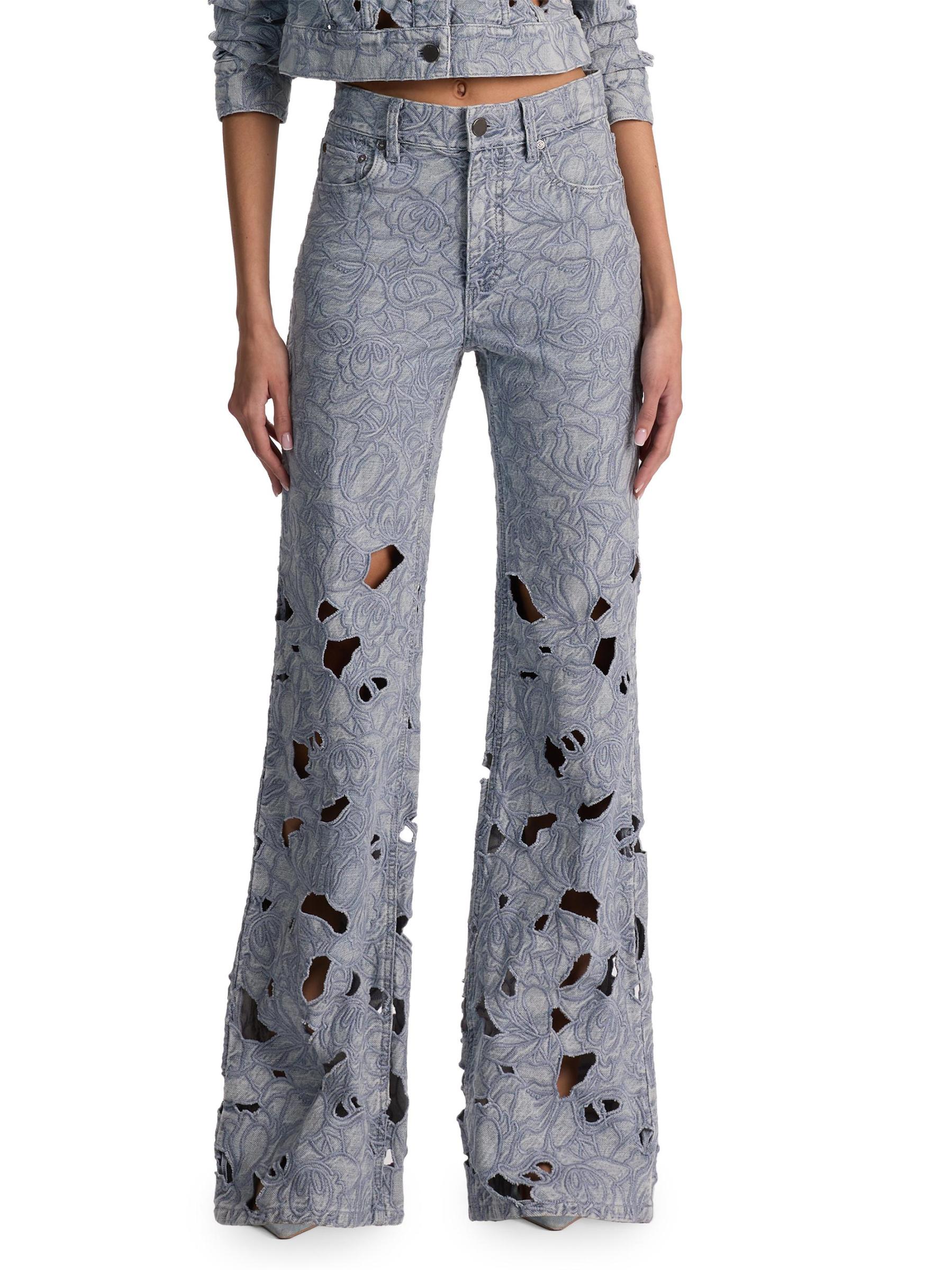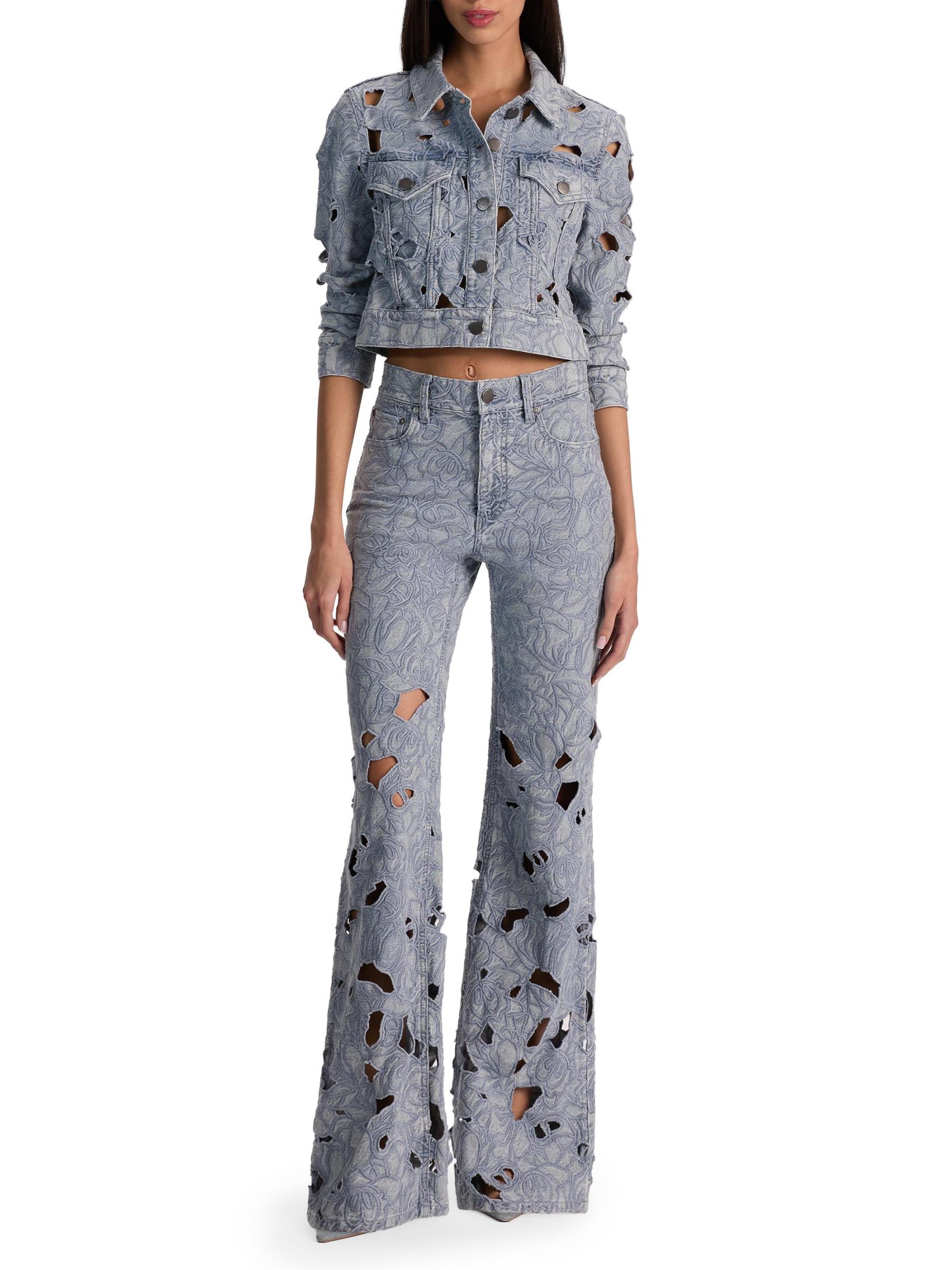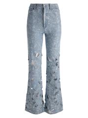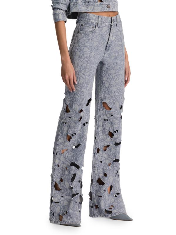 تتميّز سراويل الجينز الأنيقة من Alice + Olivia بتصميم العيينة المطرّزة والمزيّنة بزخارف نباتية. يتميز هذا الزوج، الذي تم تصميمه بمقاس مرتفع، بتصميم بخمسة جيوب وصورة ظلية مستقيمة الساق