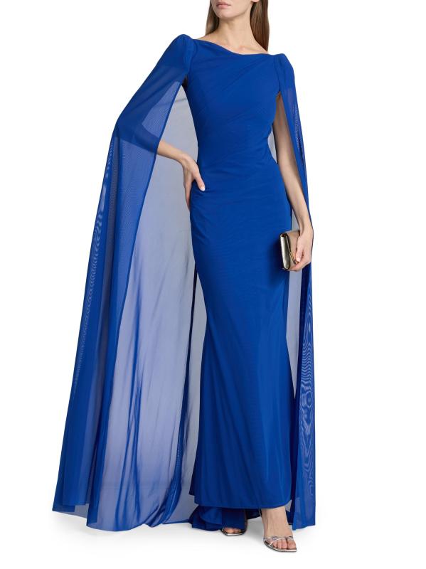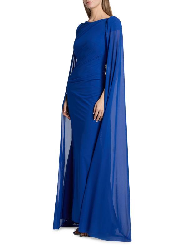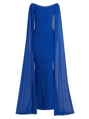 يتألق فستان Talbot Runhof المذهل المصنوع من الشيفون بأكمام كاب من التول، مما يضفي لمسة ملكية. تجمع هذه القطعة في جميع أنحاء الجسم، وتتميز بتقويرة على شكل قارب.