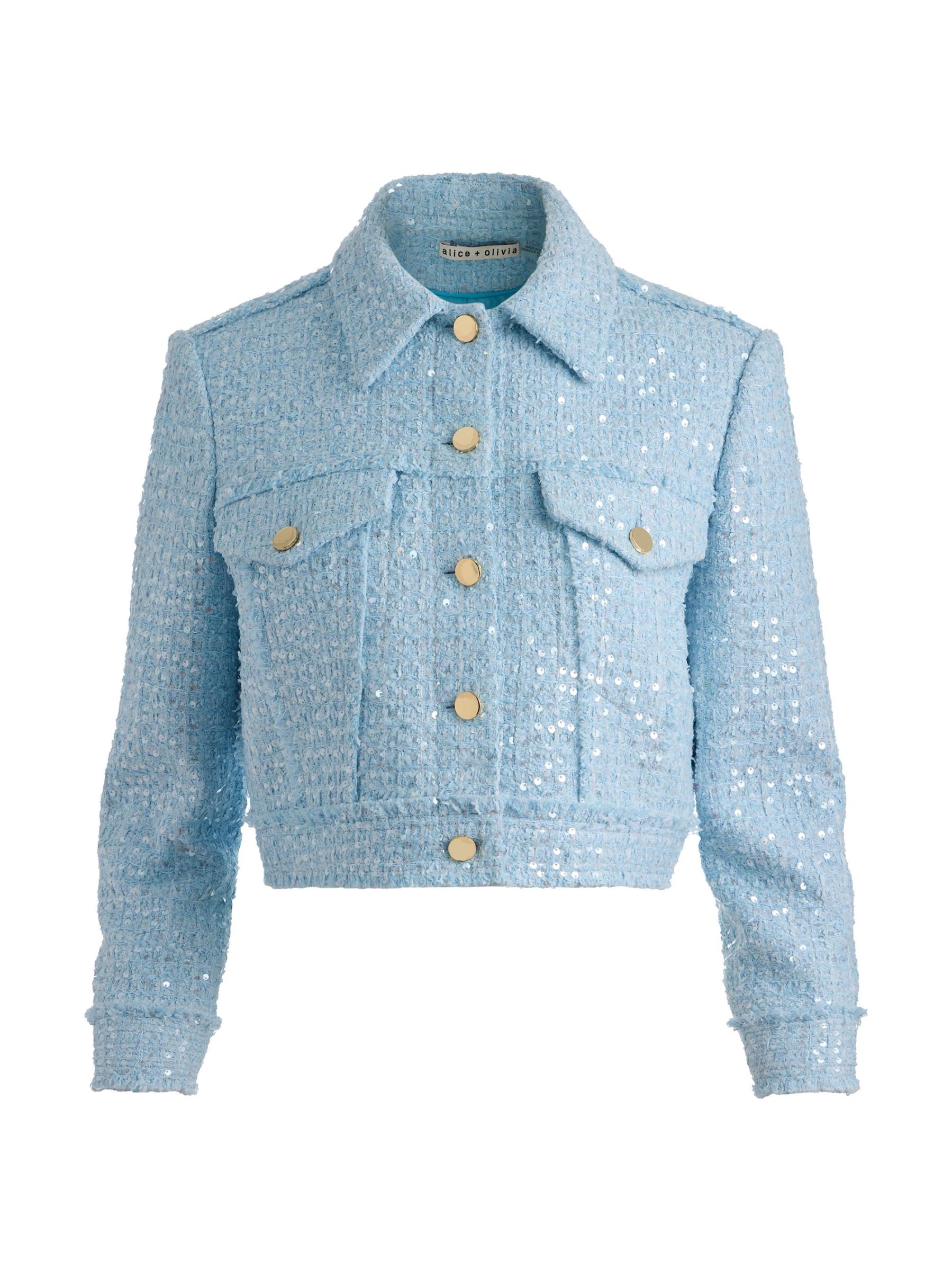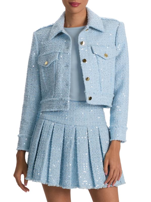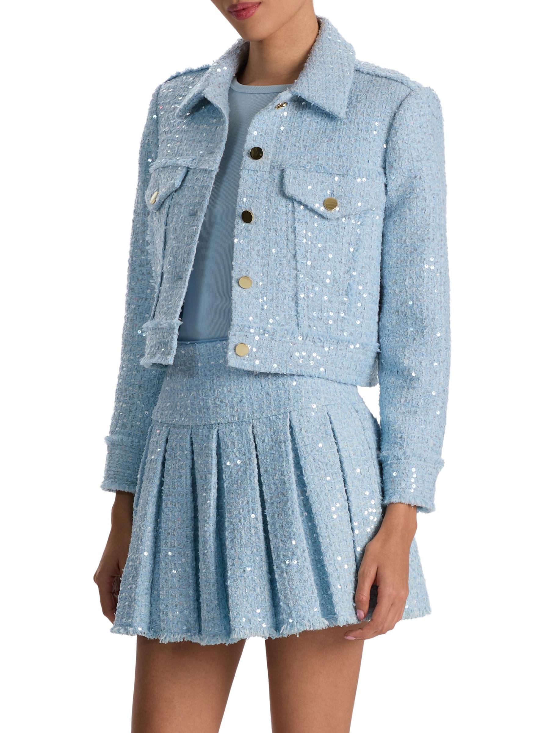 تتميز سترة Chloe هذه من Alice + Olivia بتصميم من التويد مع تفاصيل الترتر البراقة. صُمّمت هذه القطعة بقصّة قصيرة مع ياقة واسعة وجيوب علّاقة على الصدر وأزرار أمامية للإغلاق.