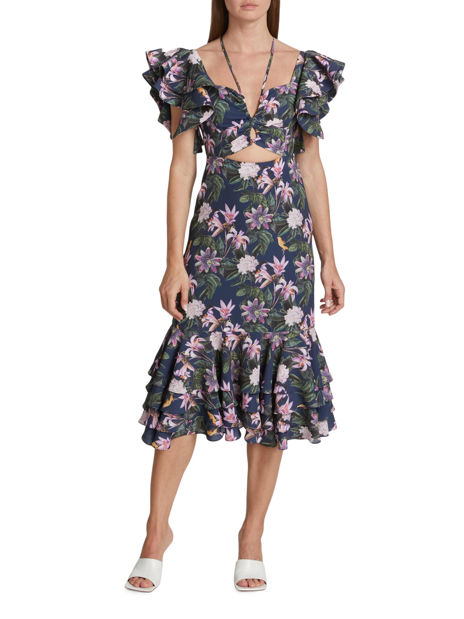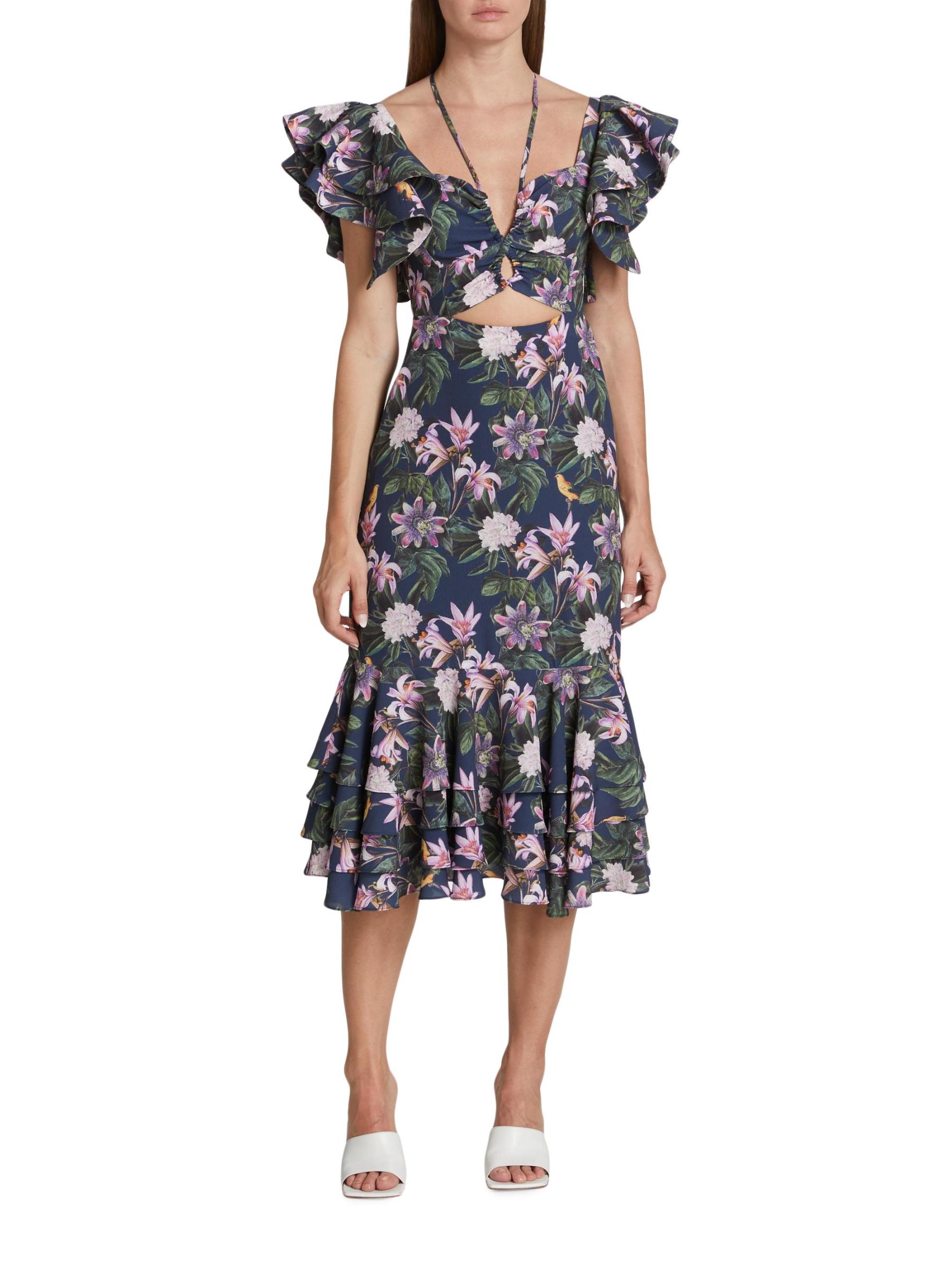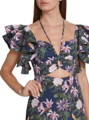 يتميّز فستان No Pise La Grama المتوسط المُزيّن بنقشة الزهور، وهو مزيّن برقبة رسن وأكمام كاب مكشكشة وفتحة أمامية جذابة.